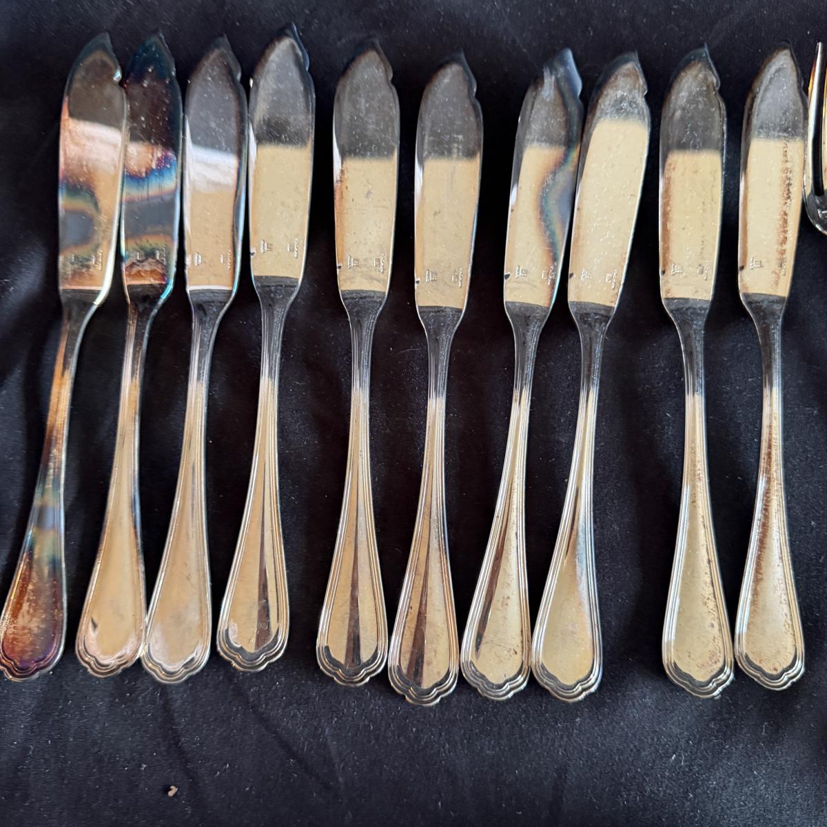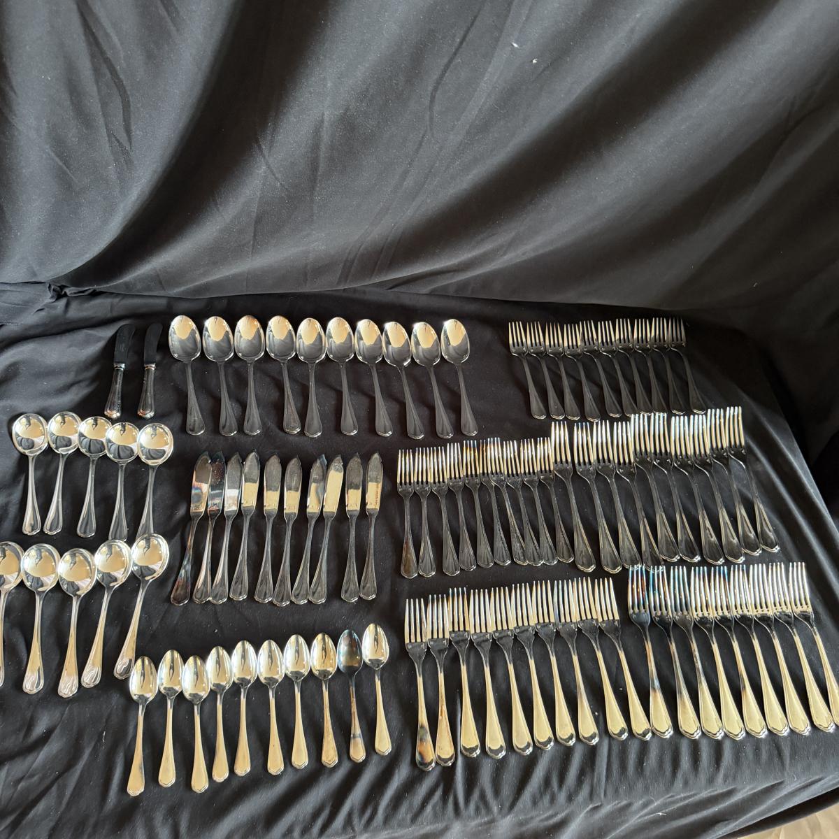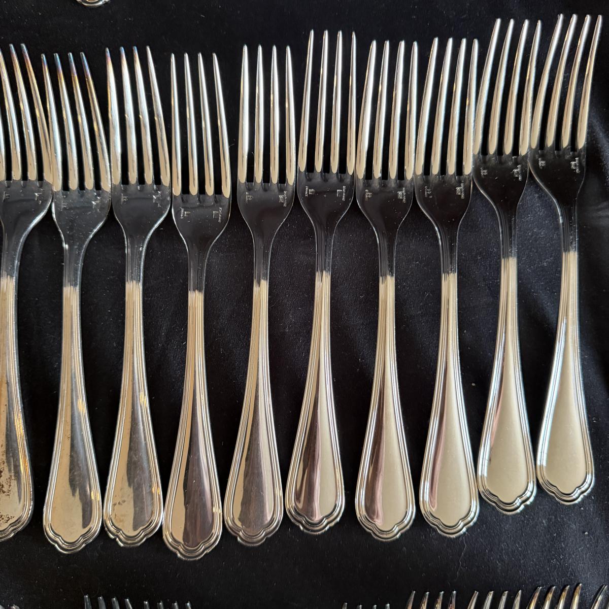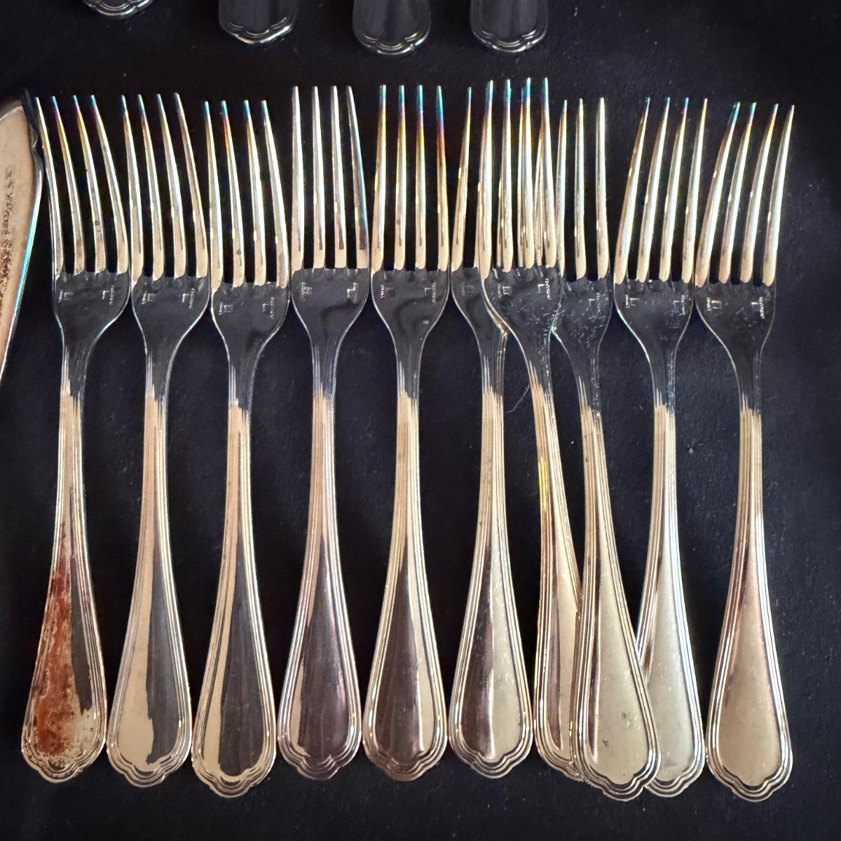 Lot includes a Christofle Spatours eight piece nine person flatware set with extras. Knife measures 9.5”long.