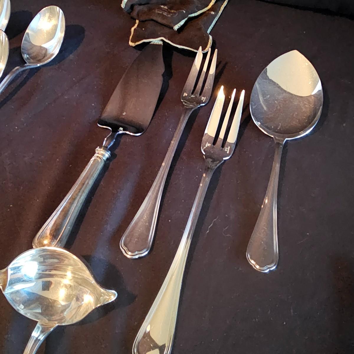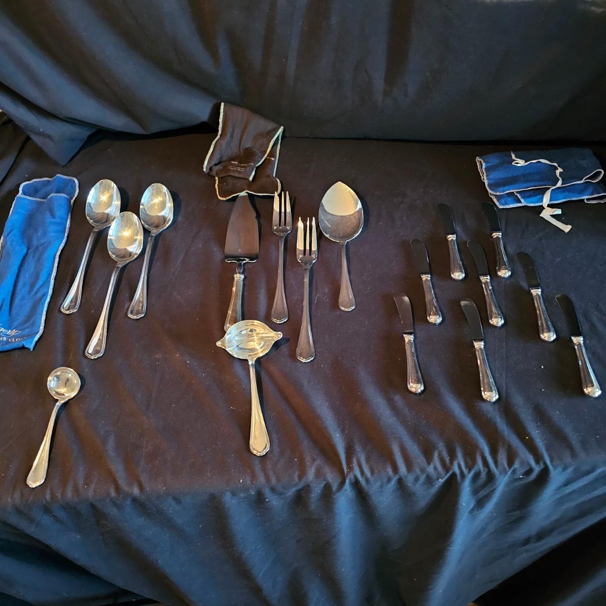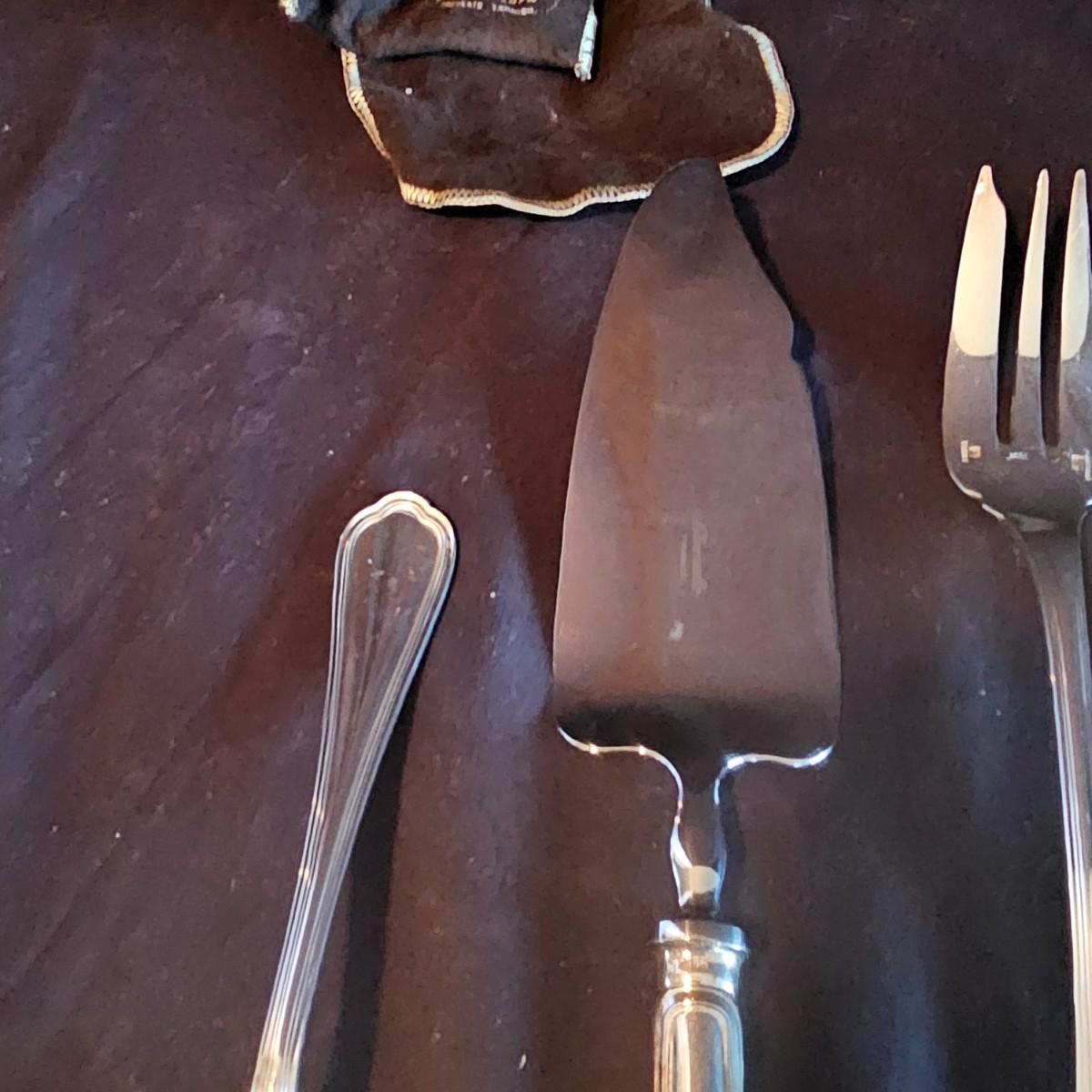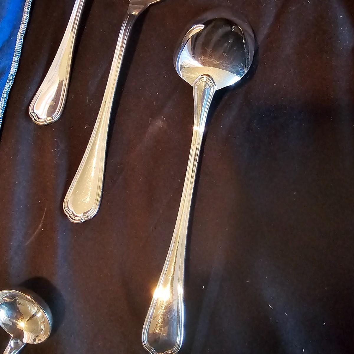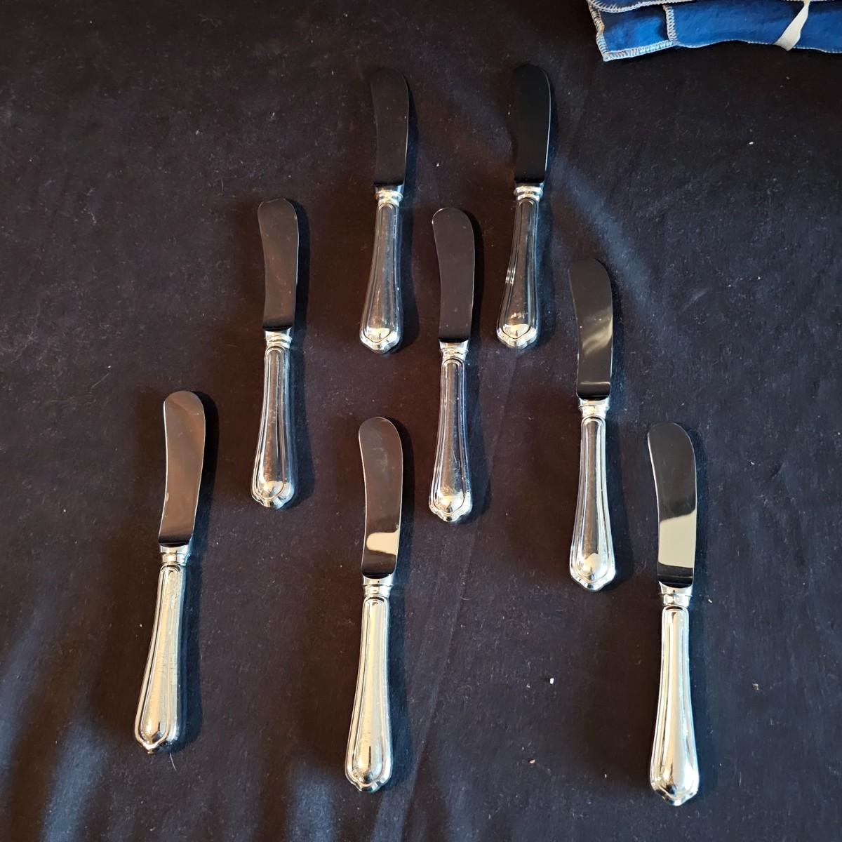 Fine French serving utensils by Christolfe. Serving spoons, meat forks, pie server, gravy ladle and eight butter knives. Company imprint on many of the items. Serving spoons are 10" long and butter knives are 6.5" long. See photos for details. Shipping available.