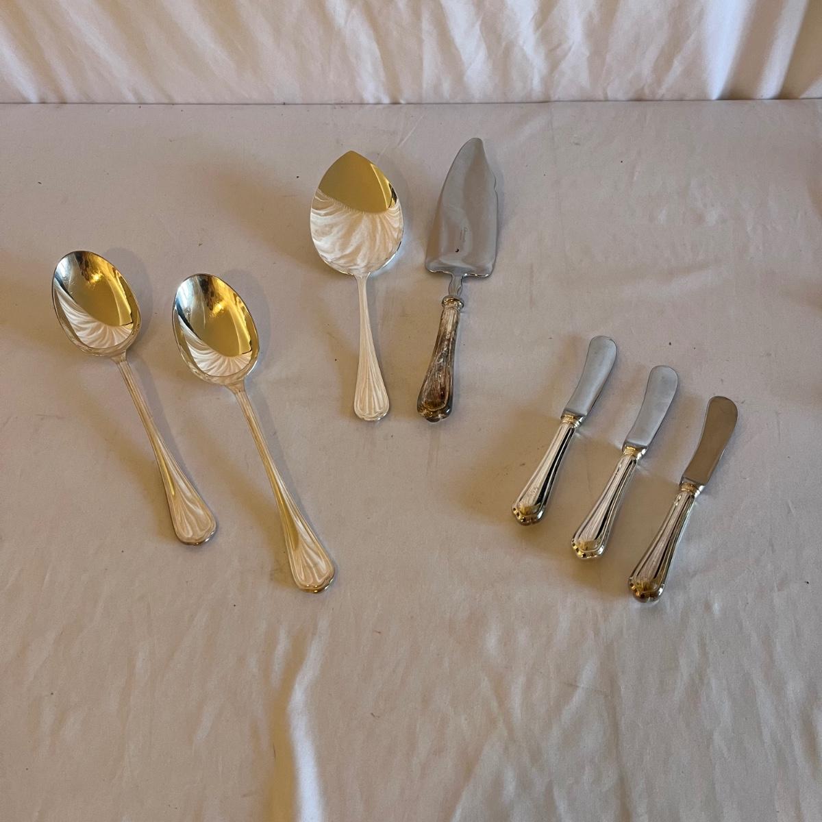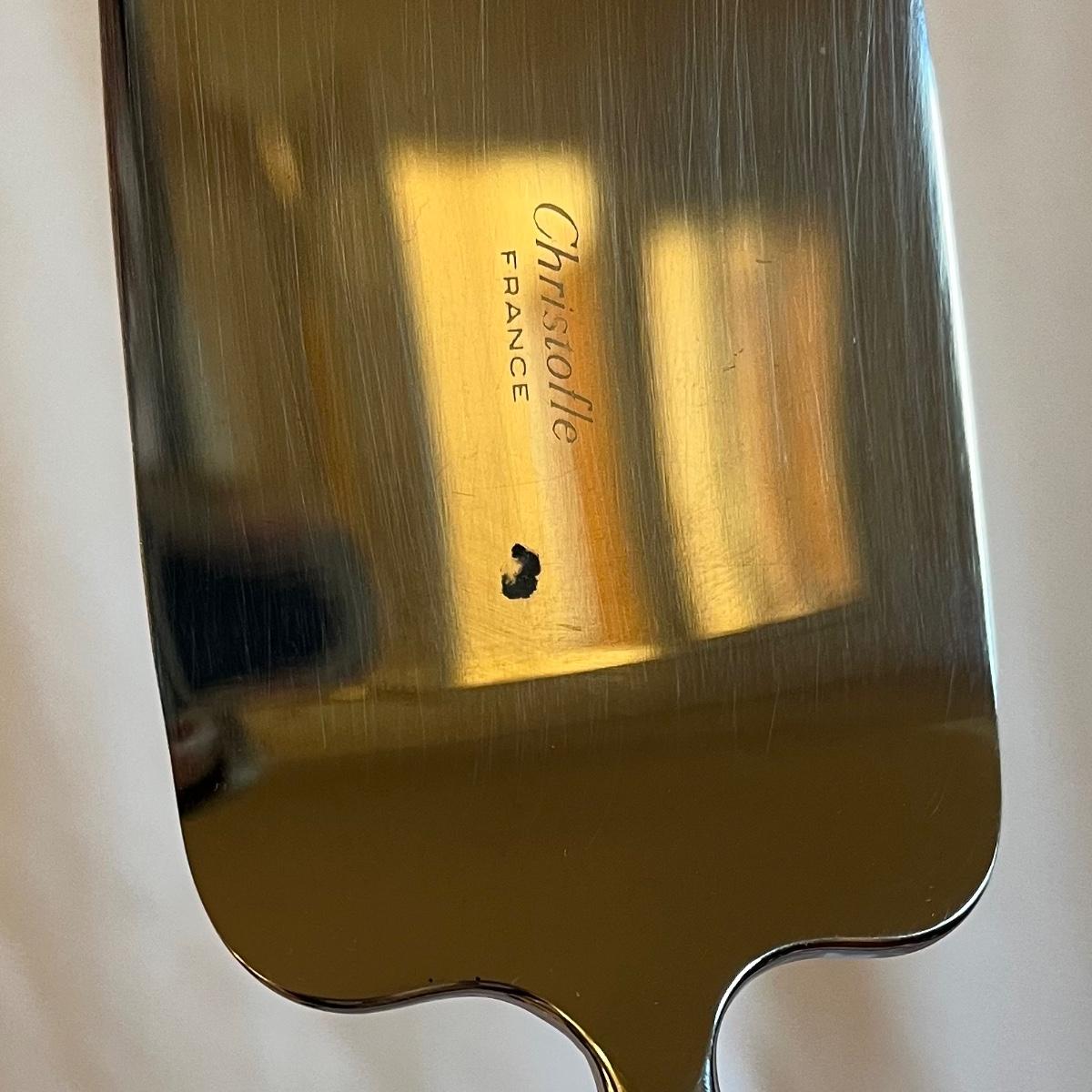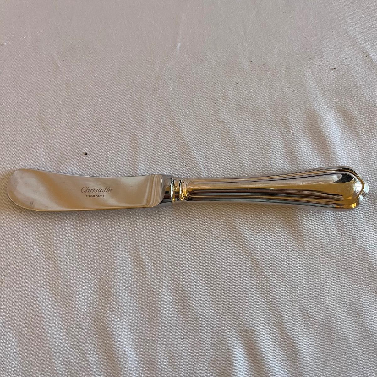 Fine French serving utensils by Christofle. Seventeen pieces in all. Serving spoons, meat forks, pie server, gravy ladle and eight butter knives. Company imprint on many of the items. Serving spoons are 10" long and butter knives are 6.5" long. Signs of wear on a couple pieces. See photos for details.