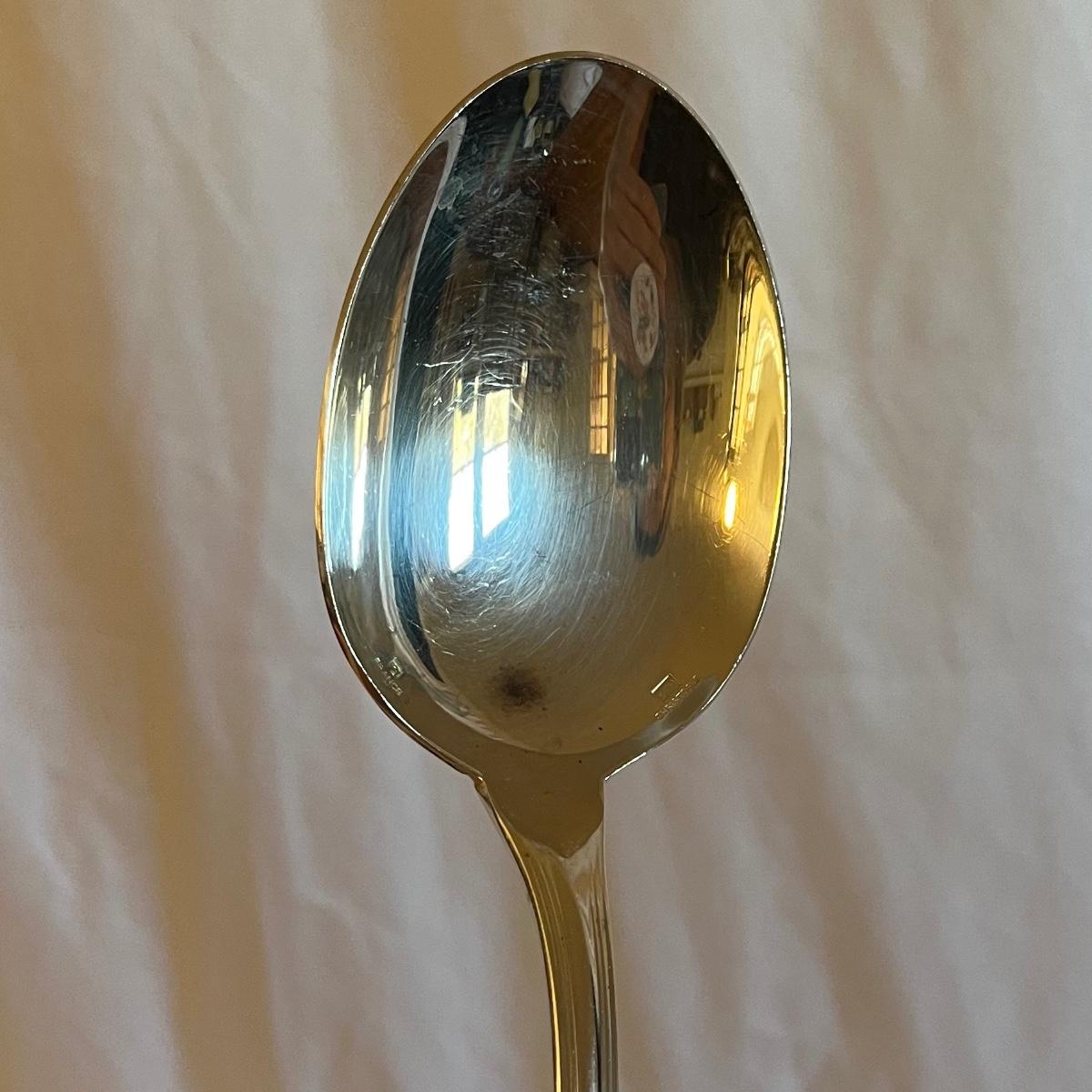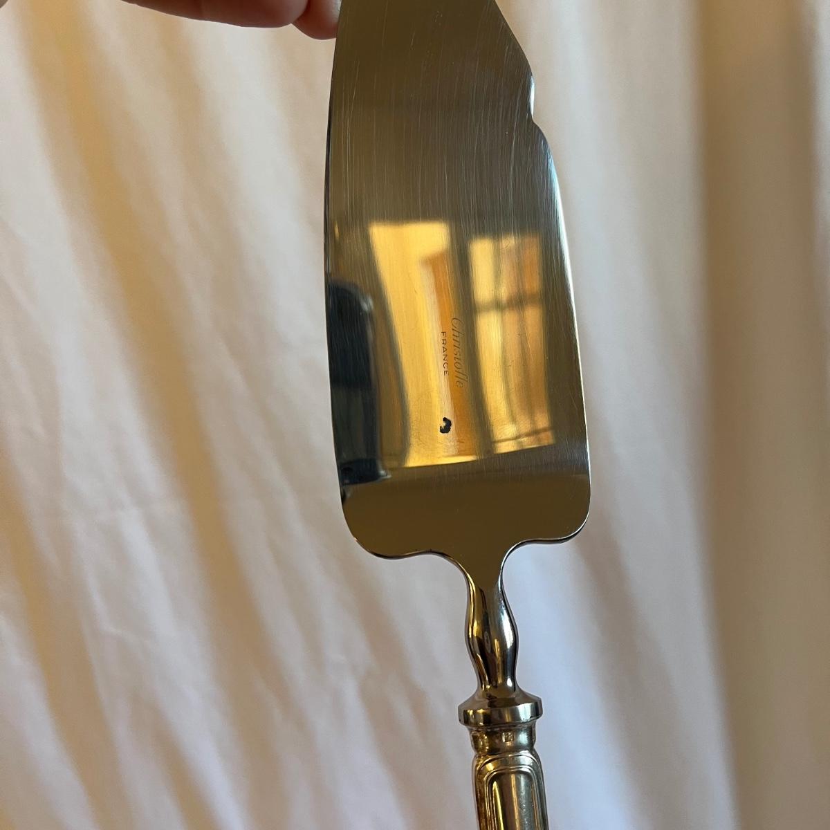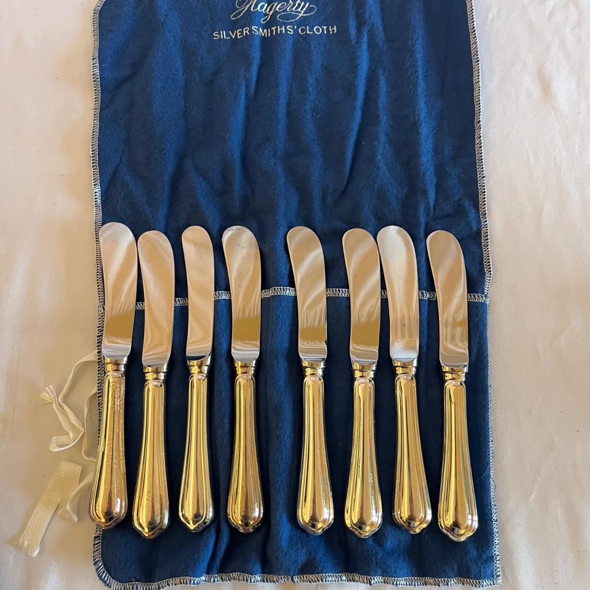 Fine French serving utensils by Christofle. Seventeen pieces in all. Serving spoons, meat forks, pie server, gravy ladle and eight butter knives. Company imprint on many of the items. Serving spoons are 10" long and butter knives are 6.5" long. Signs of wear on a couple pieces. See photos for details.