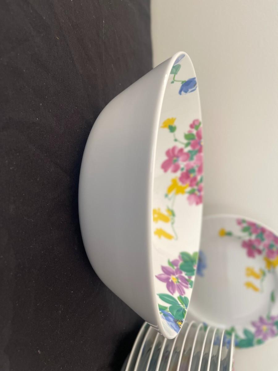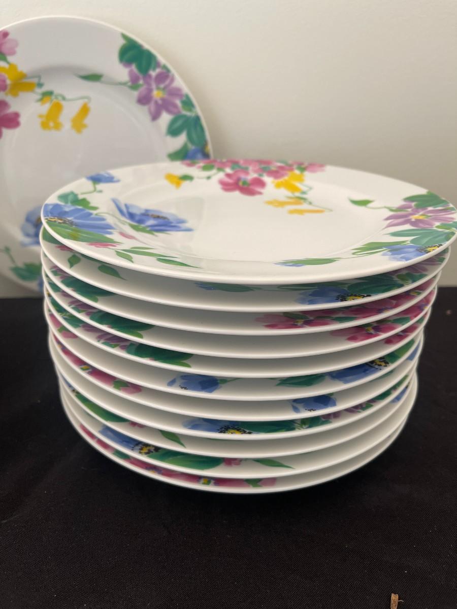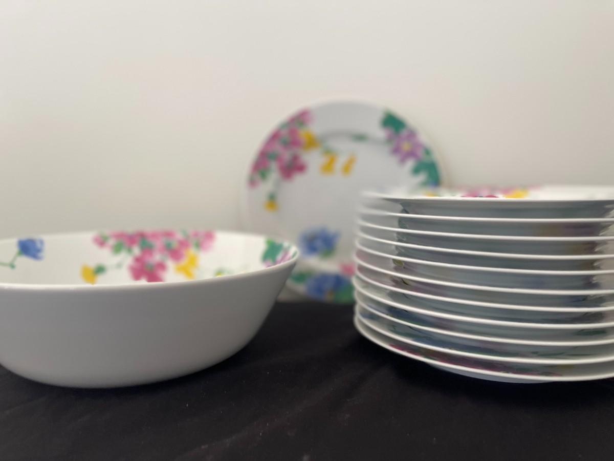 Christopher Stuart fine china dessert set. Pattern is Floral Gallery. Includes large serving bowl (9 1/2") and 12 plates (8 1/4"). All in very good condition.
