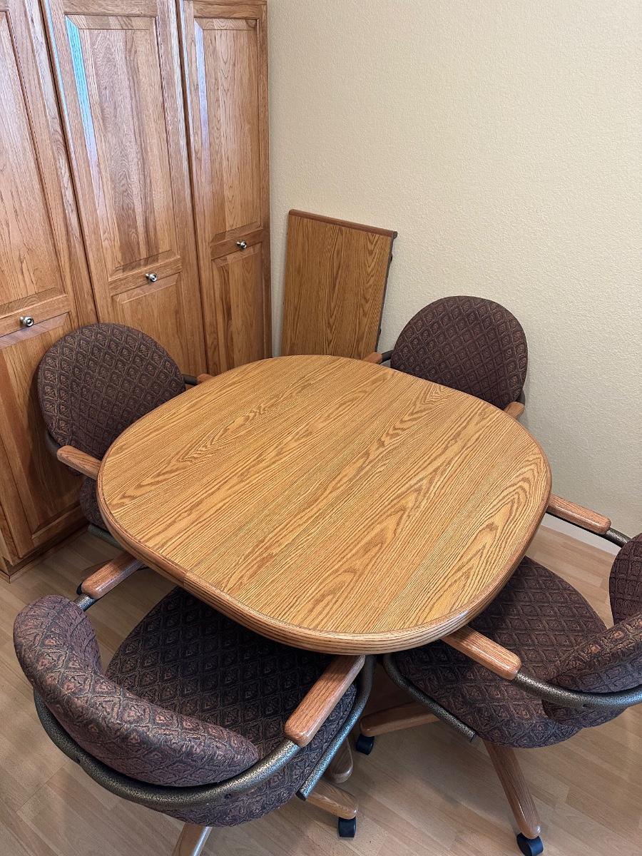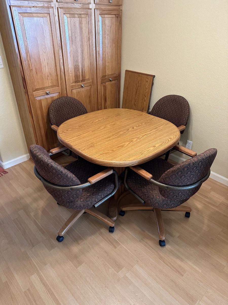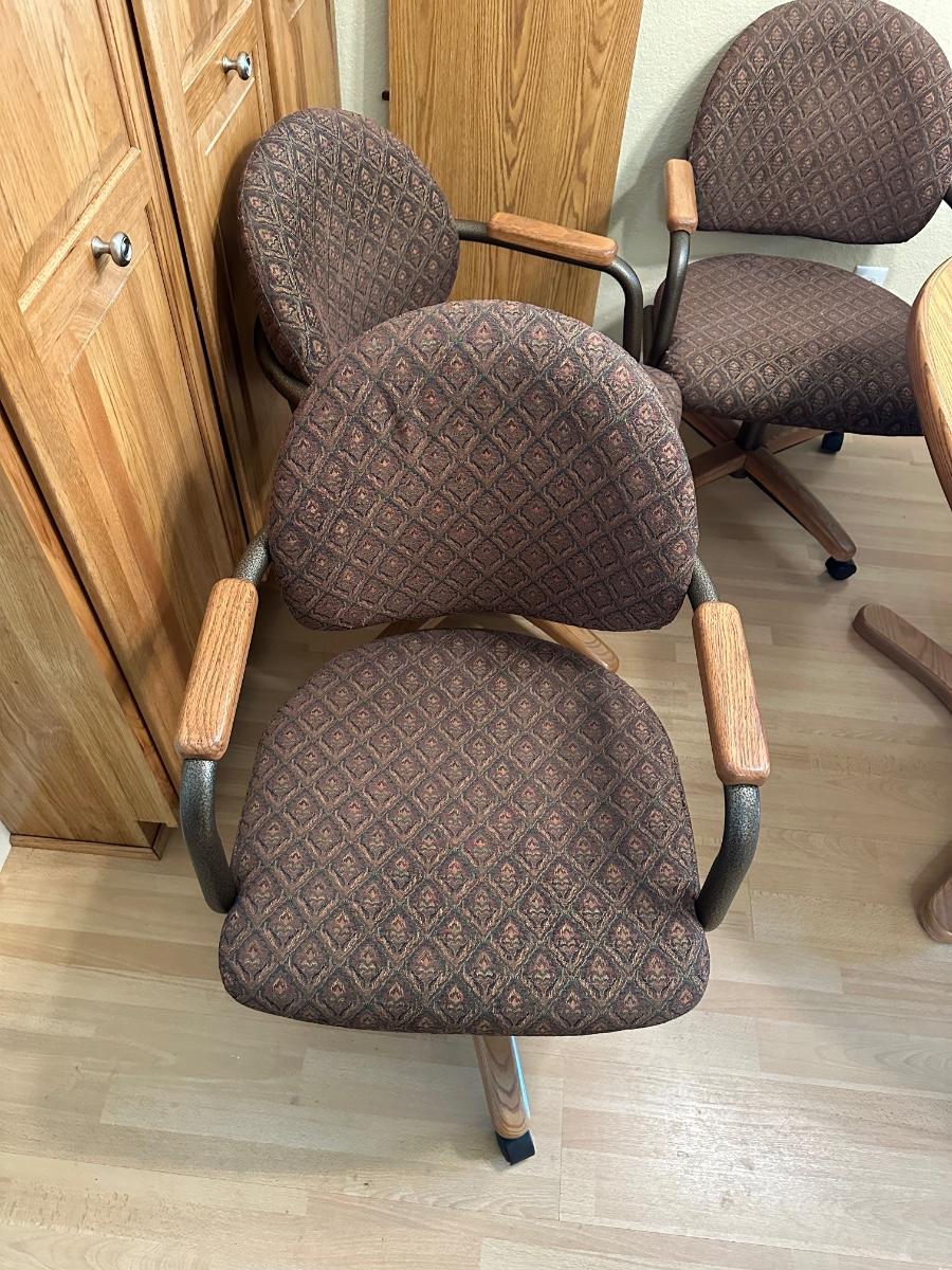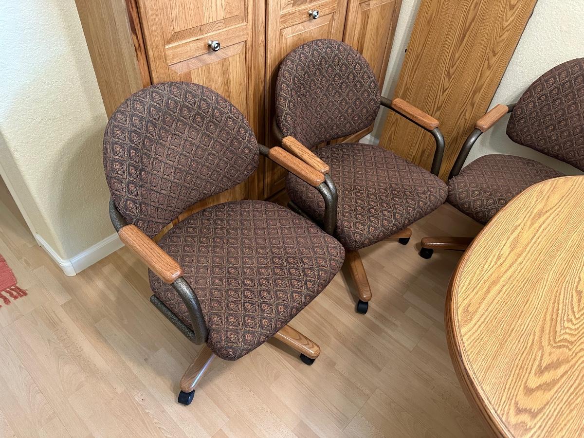 Beautiful table and it has 4 really nice cushioned and upholstered chairs that do swivel and are on casters