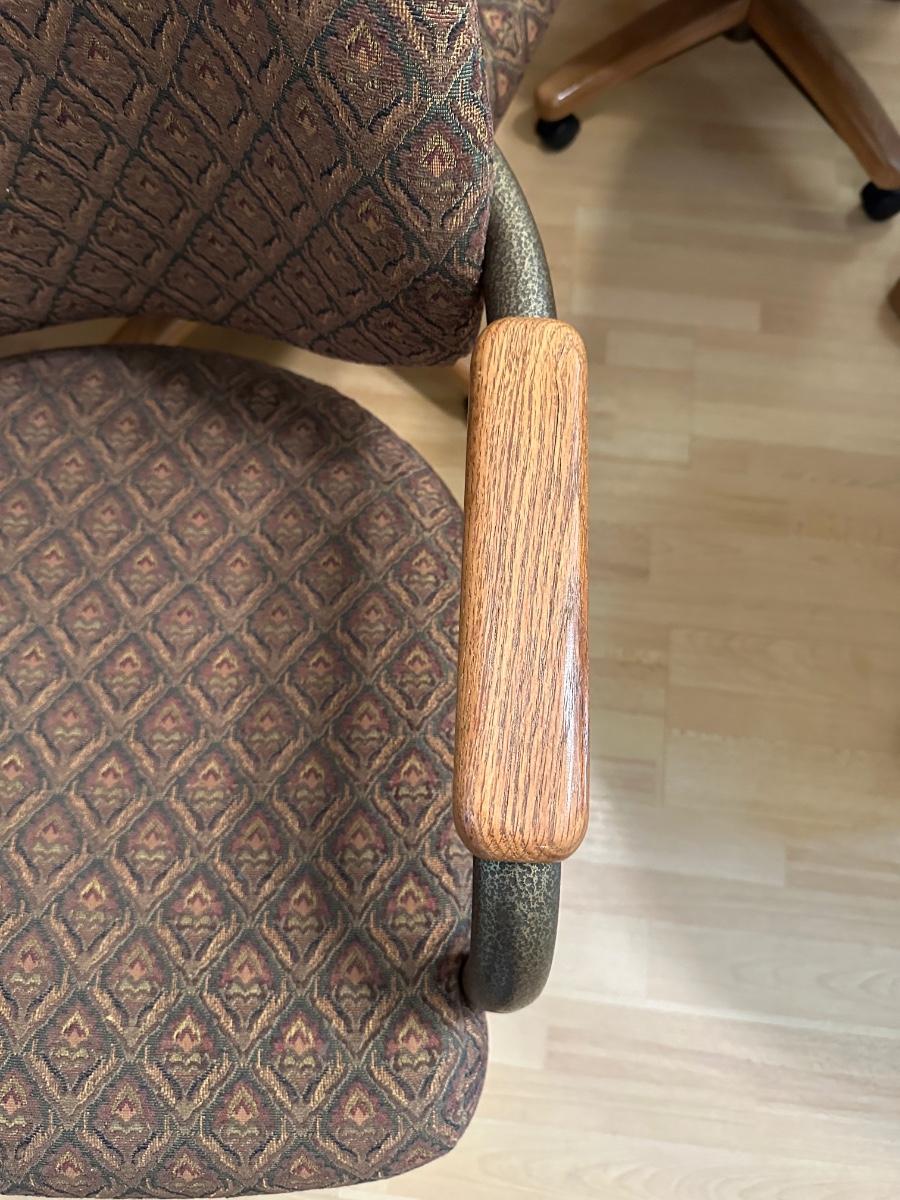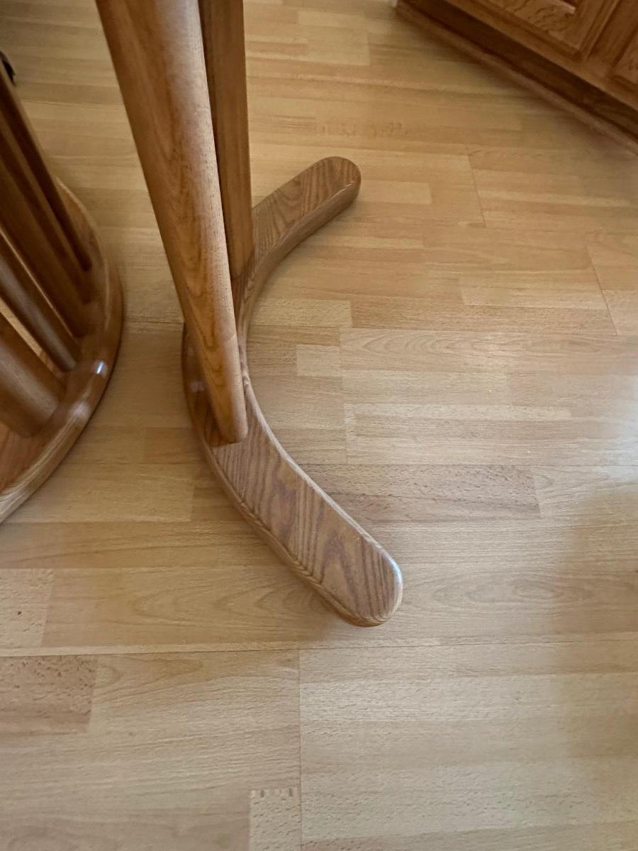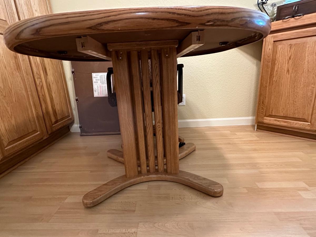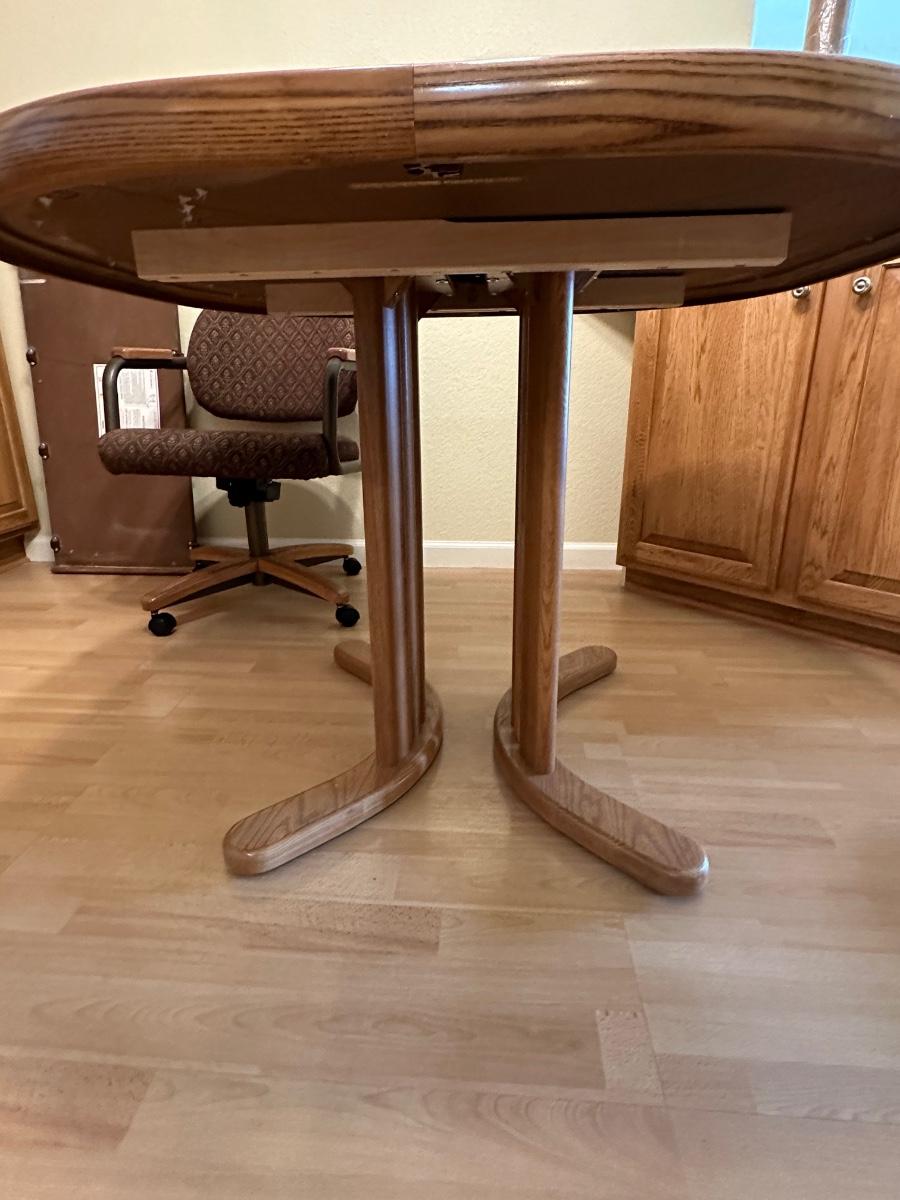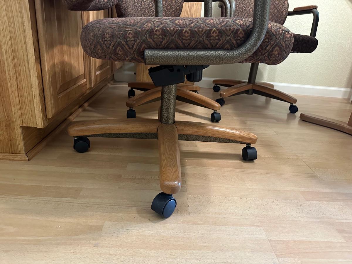 Beautiful table and it has 4 really nice cushioned and upholstered chairs that do swivel and are on casters