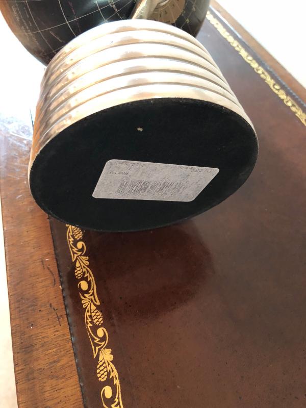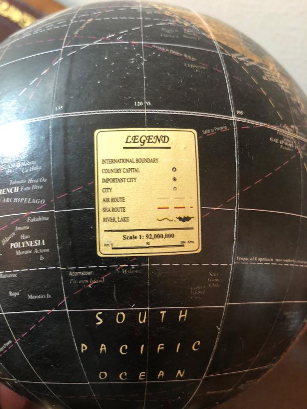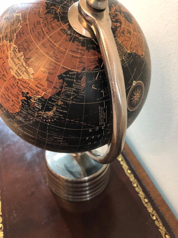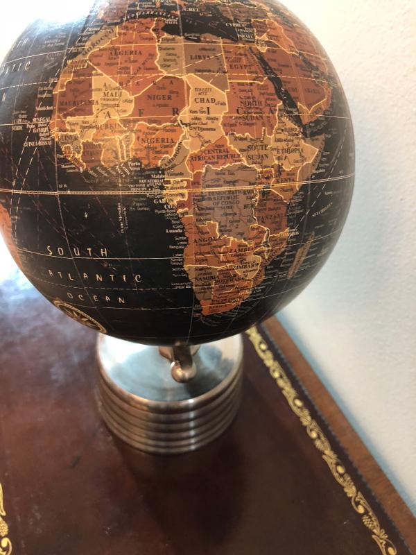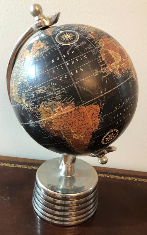 In great condition, no wear or damage. Globe is 6" in diameter. Stands about 12" tall.