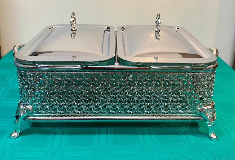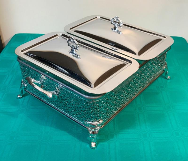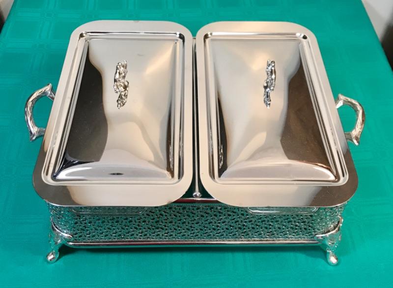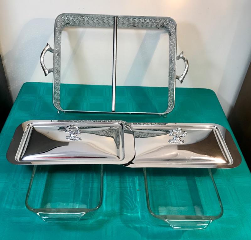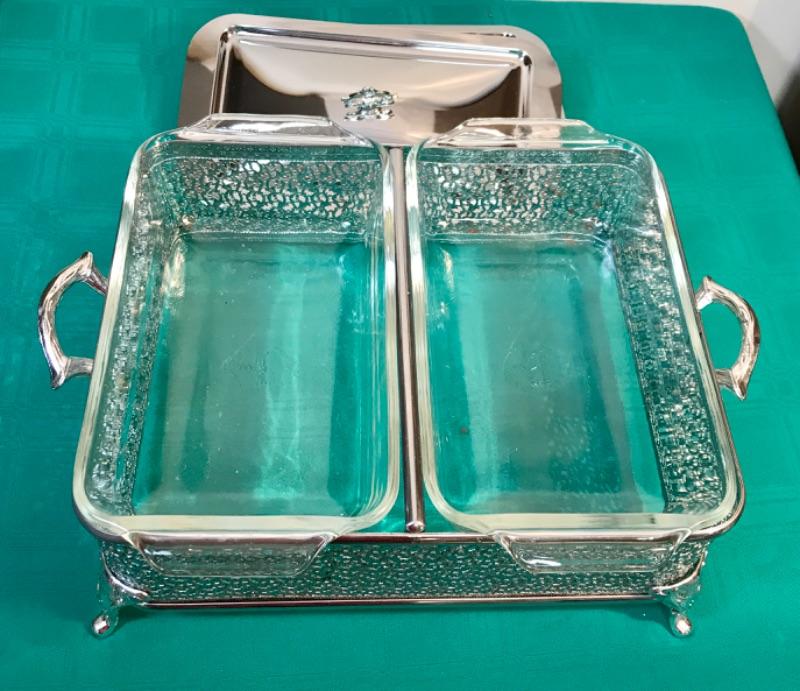 Side-by-side covered serving trays in a square chrome metal holder. Anchor Hocking glass pans measure approx 9”x 5.5” each, overall size of tray is approx 12” wide x 9” deep x 7” high.