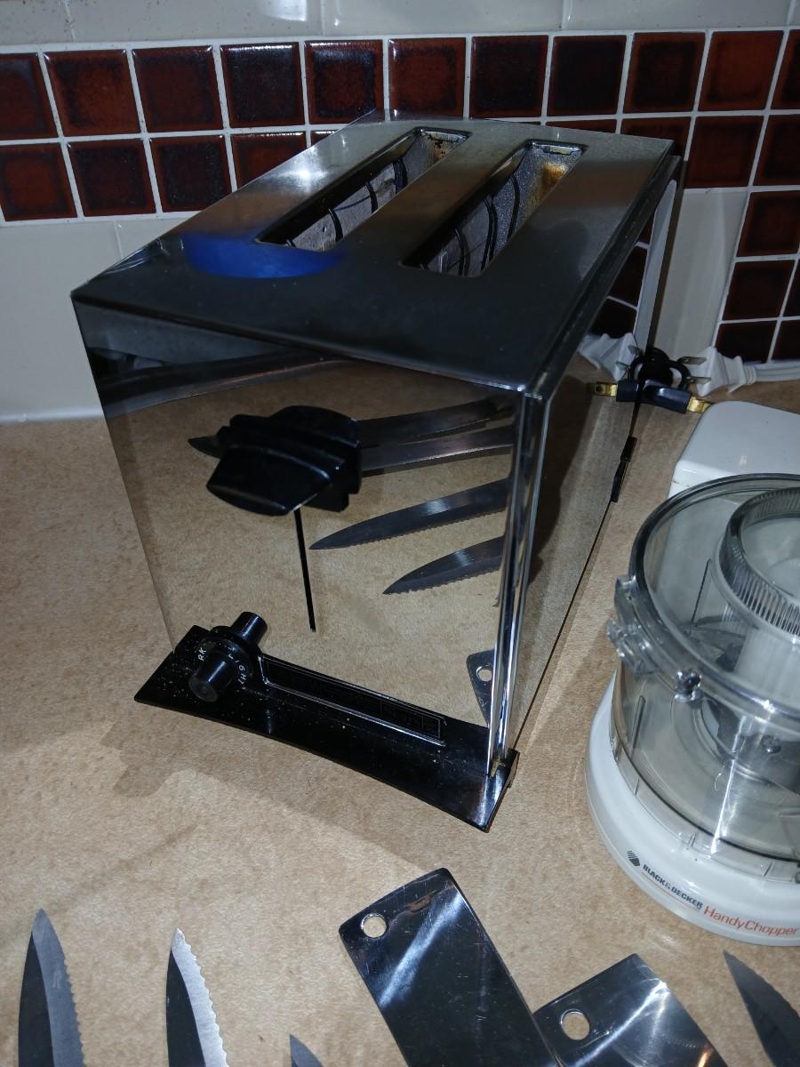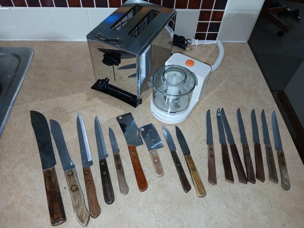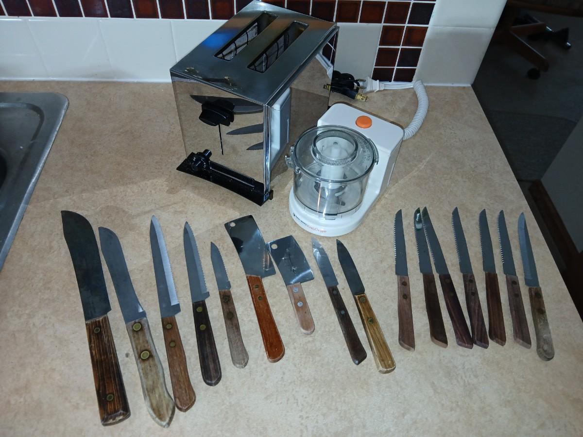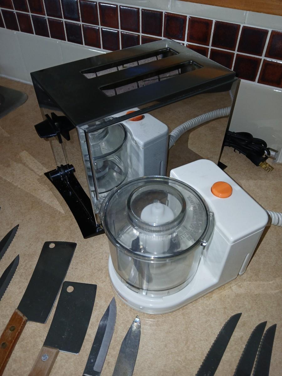 Chrome colored toaster with small electric chopper and wood handled knives