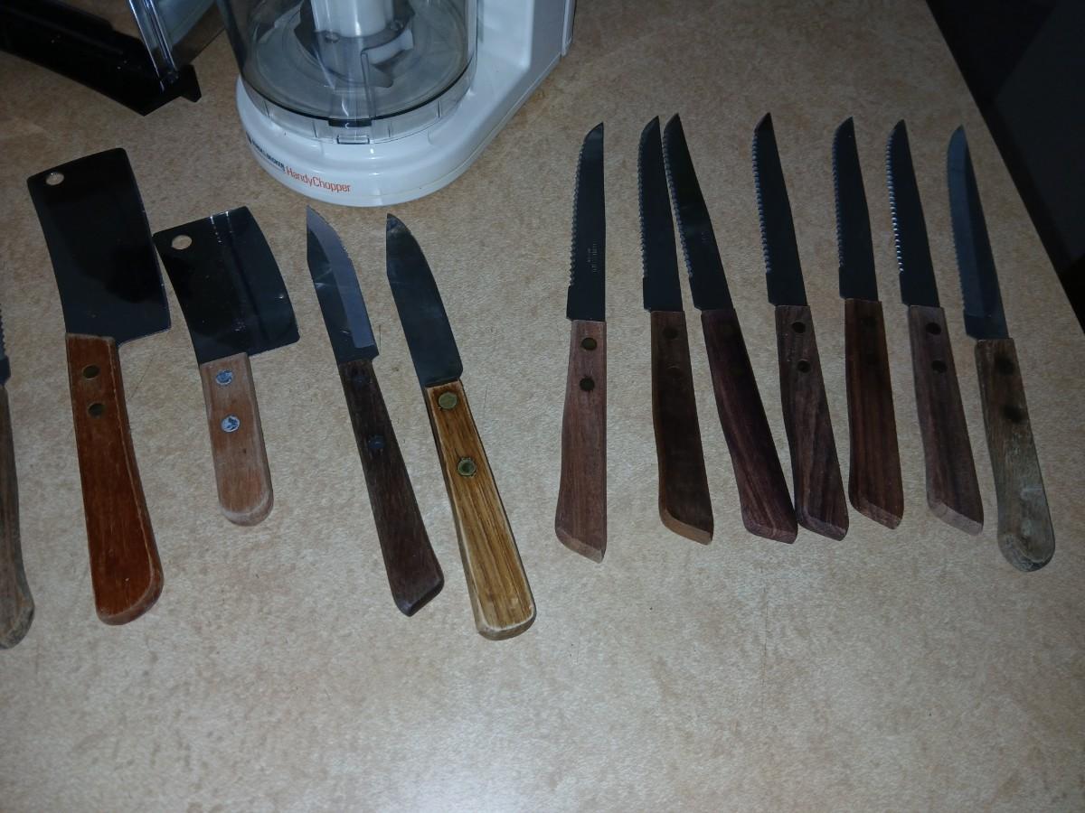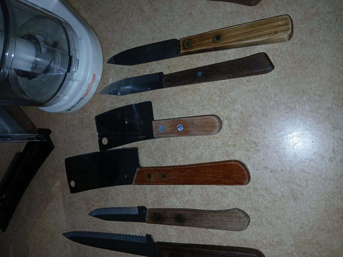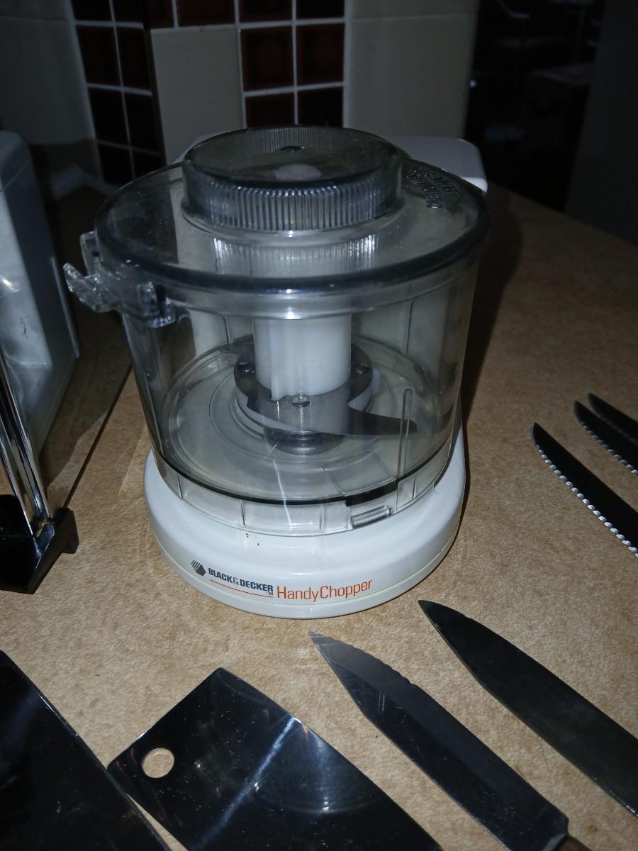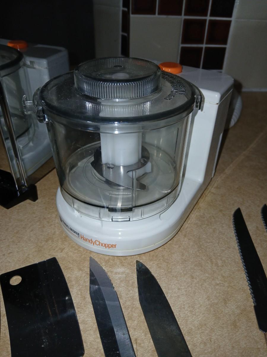 Chrome colored toaster with small electric chopper and wood handled knives