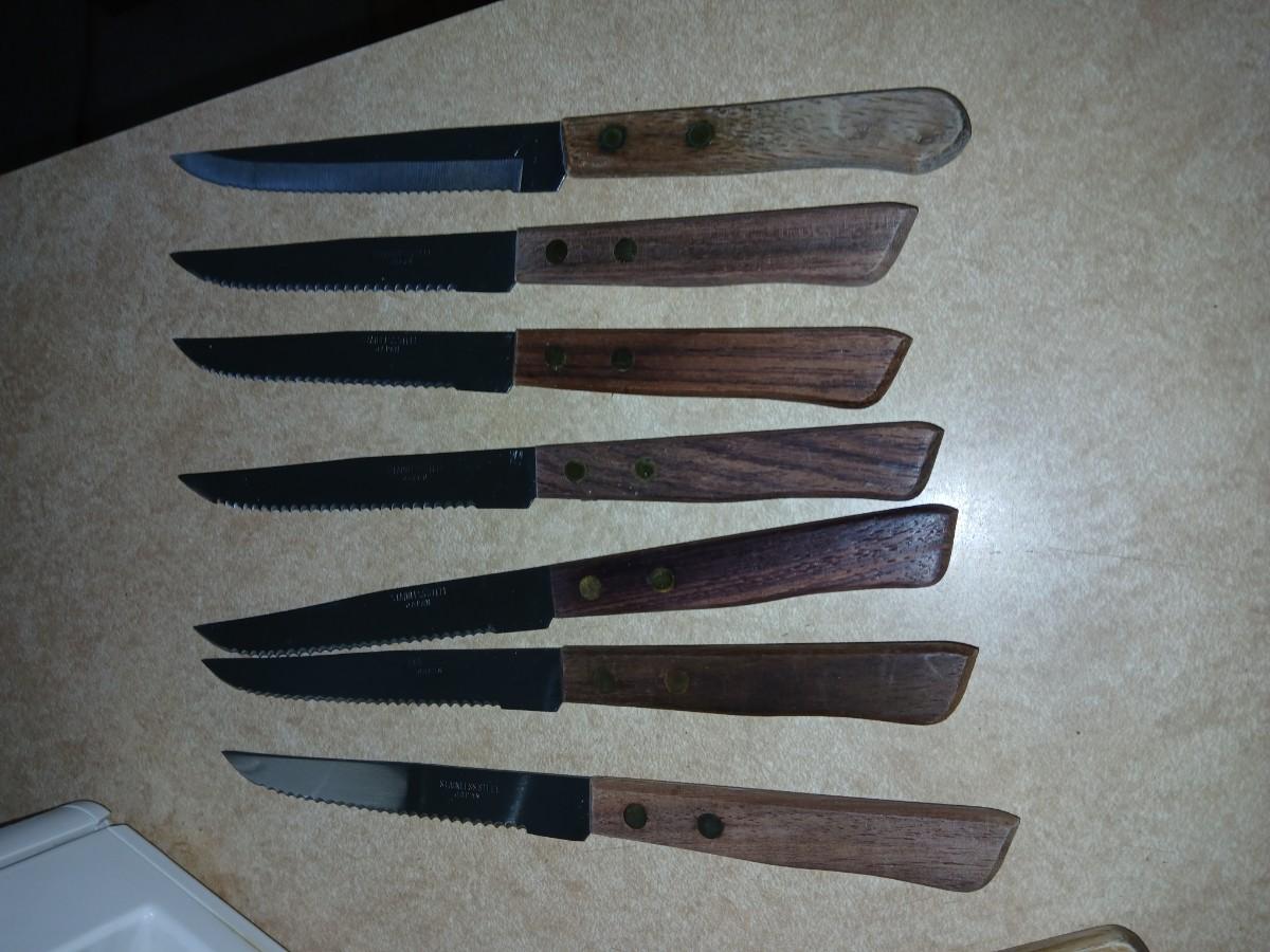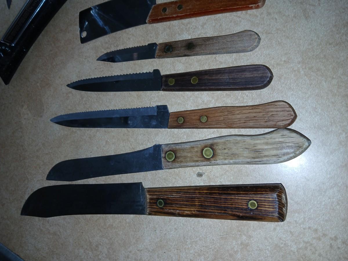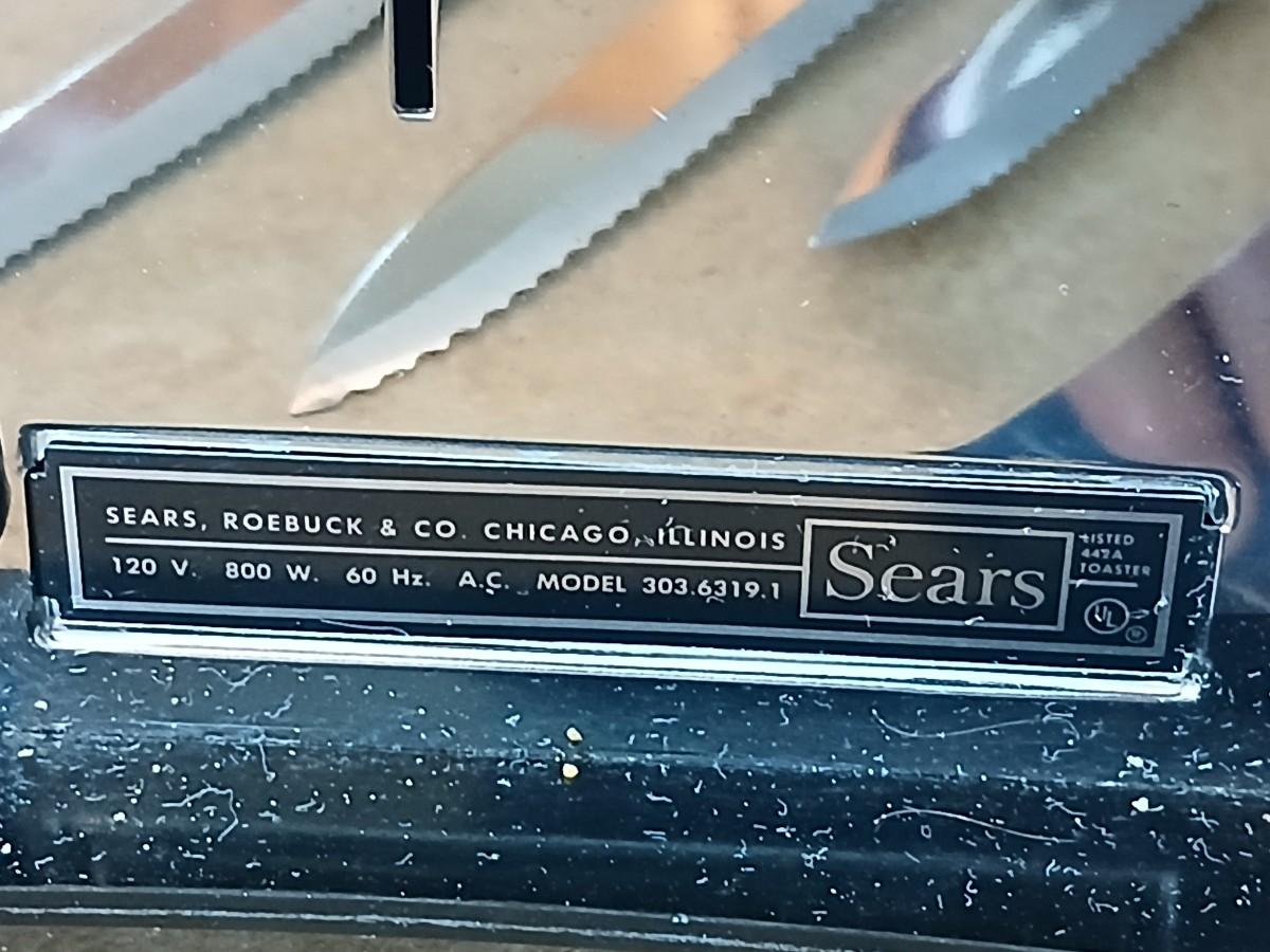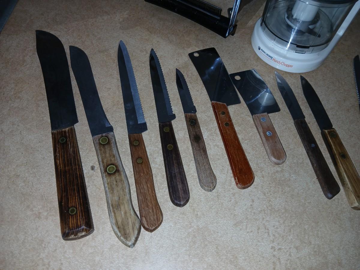 Chrome colored toaster with small electric chopper and wood handled knives