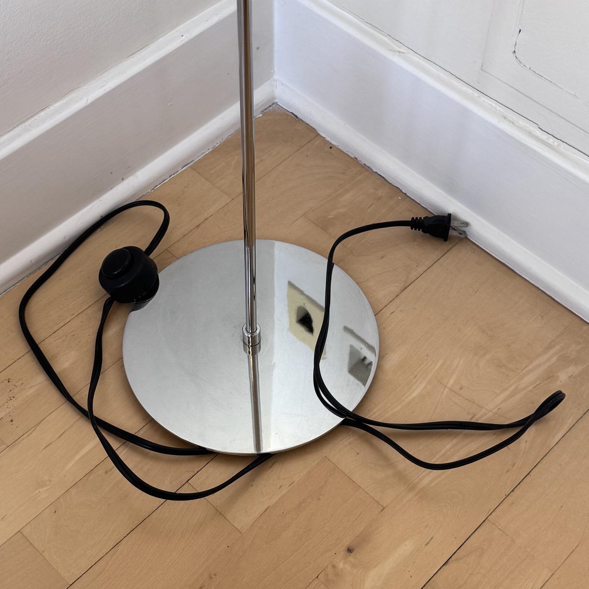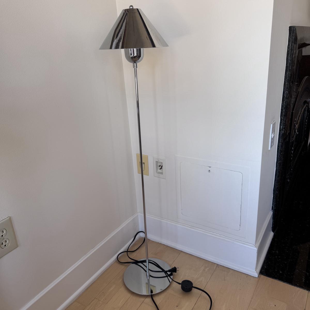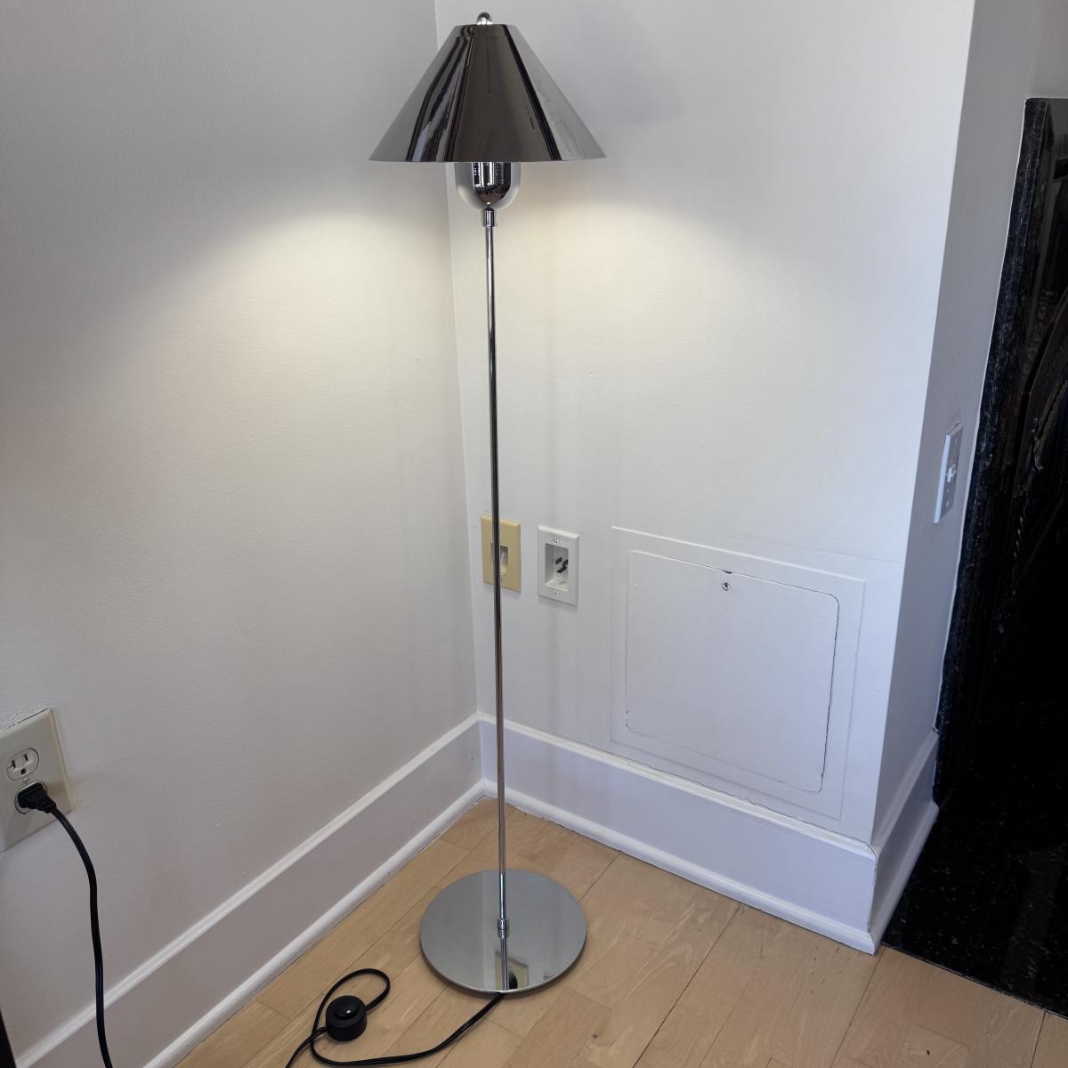 This lot includes one Chrome floor-standing lamp. The lamp powered on when plugged in. The lamp measures 9”D x 44”H. Local pickup only.