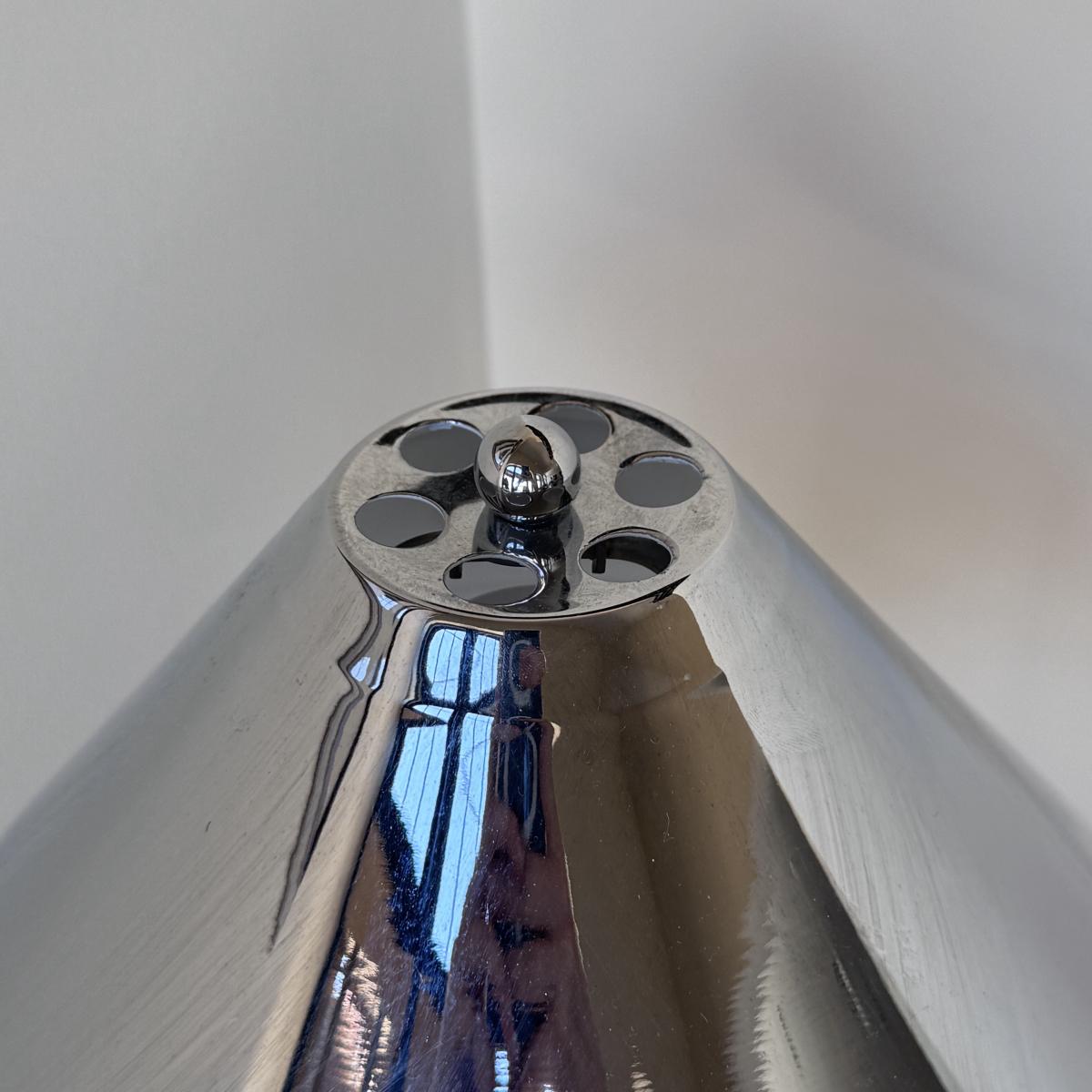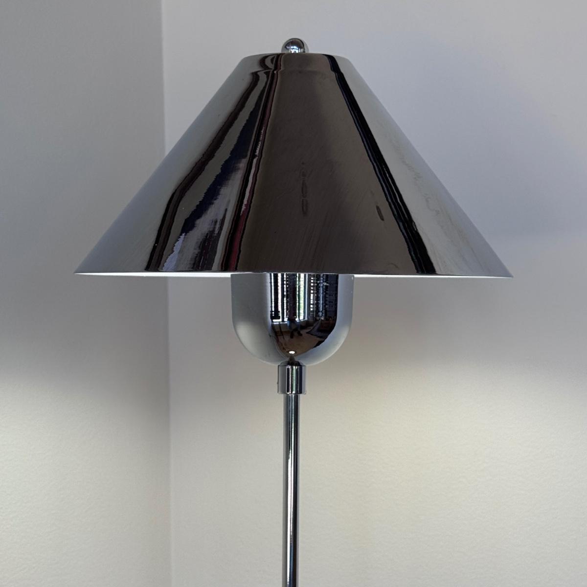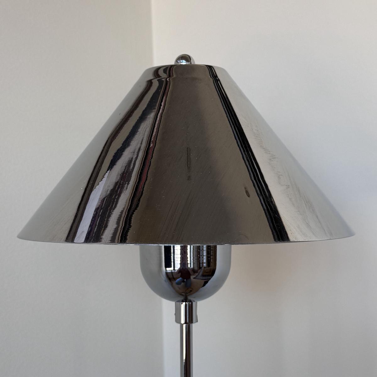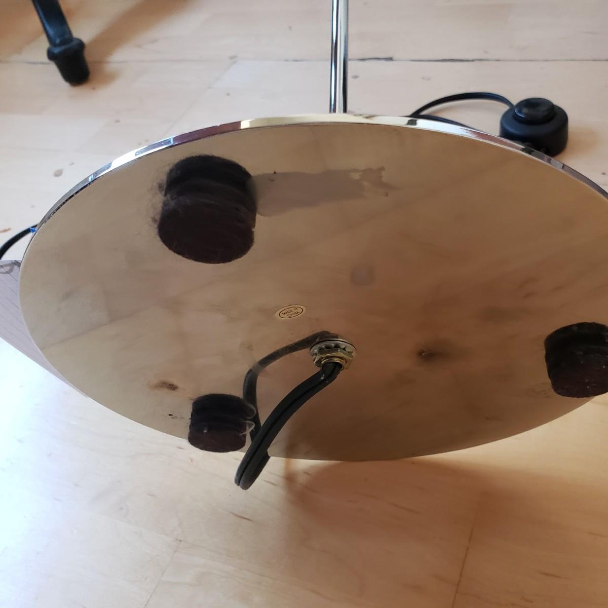 This lot includes one Chrome floor-standing lamp. The lamp powered on when plugged in. The lamp measures 9”D x 44”H. Local pickup only.