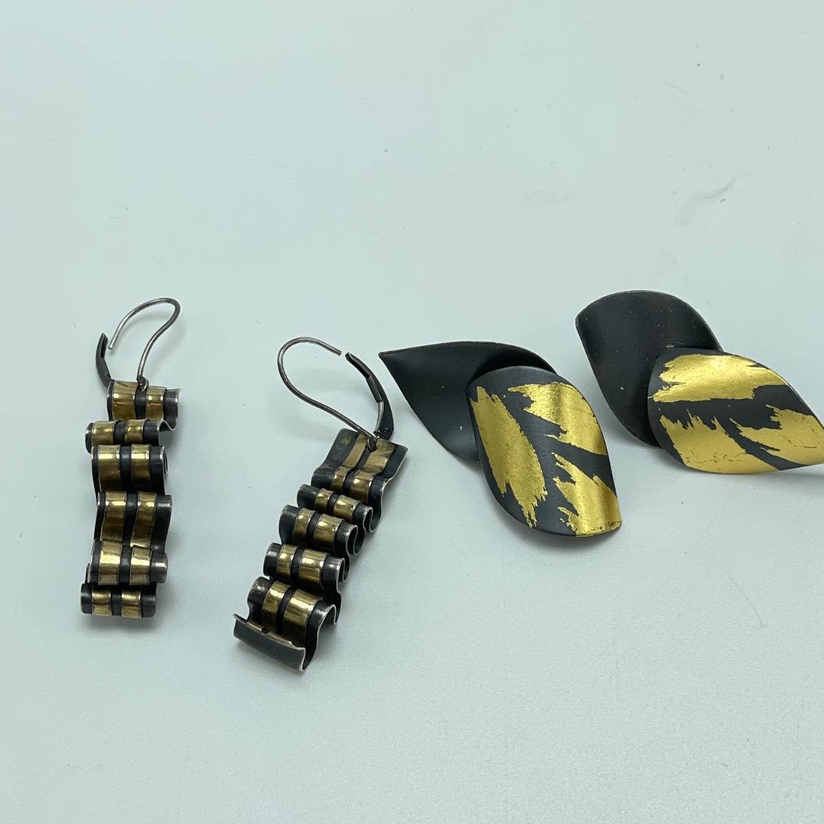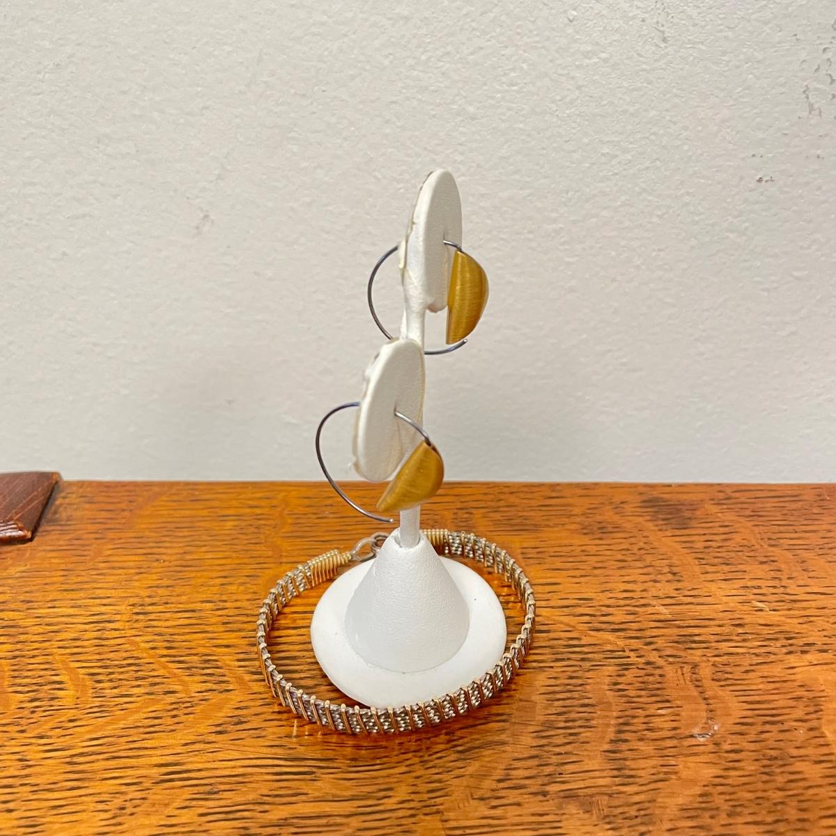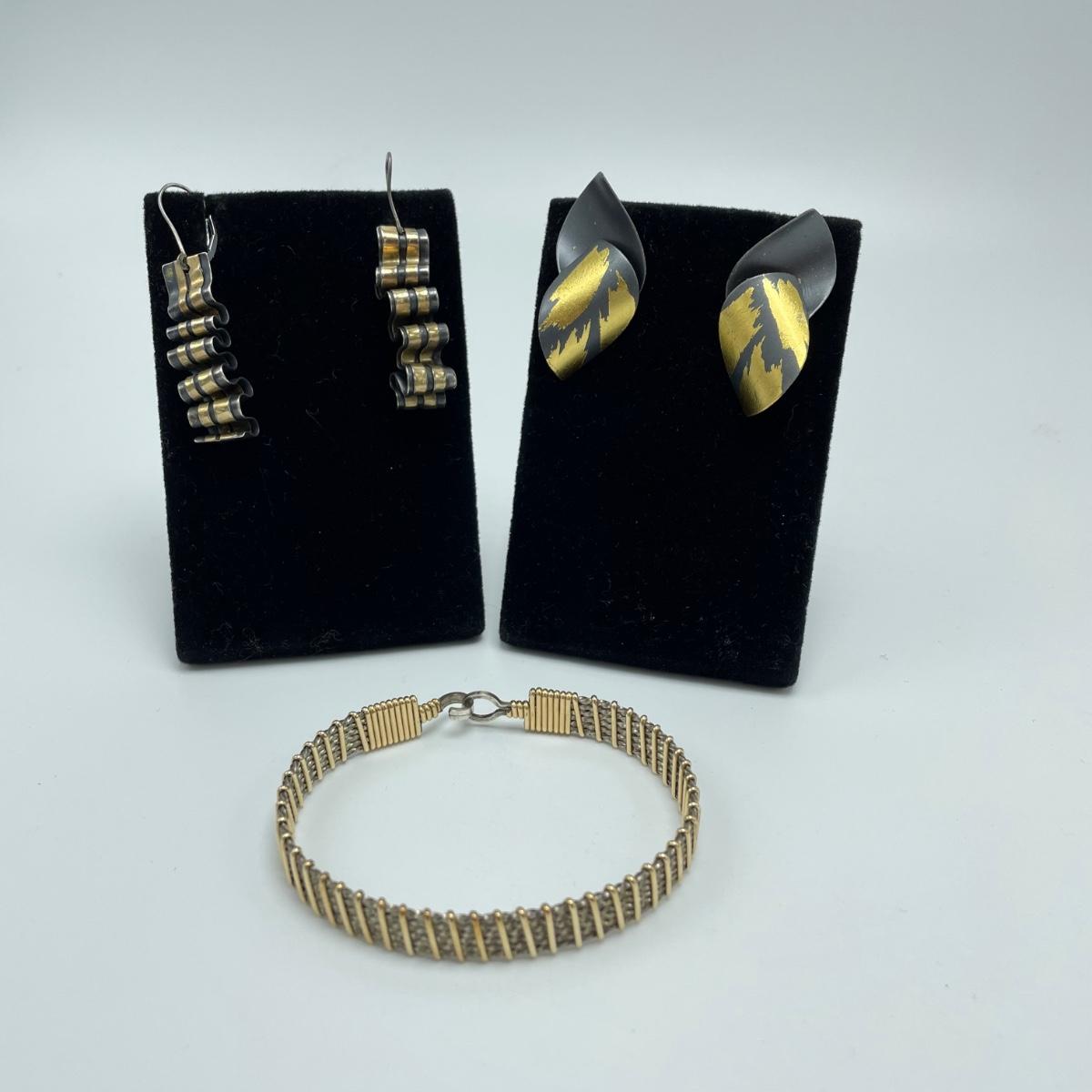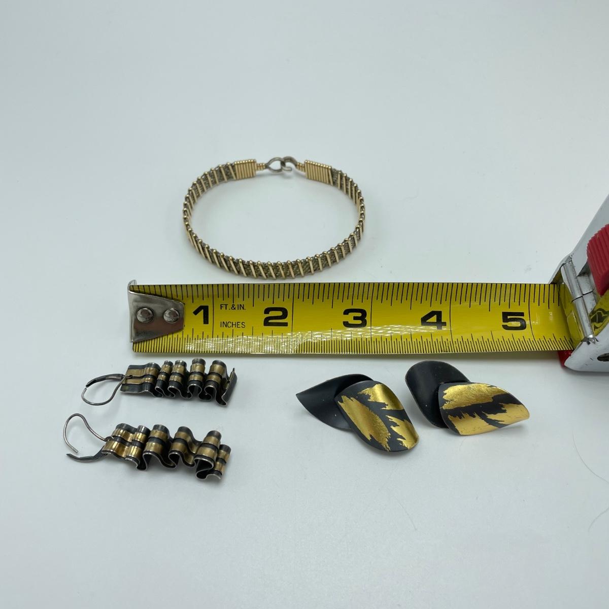 One pair of signed earrings with two other pairs and a metal bracelet. All materials appear to be metal and no other markings were found. The bracelet is stiff and holds its shape well. The hoop earrings do not connect or stick closed. See images. Shipping available.
