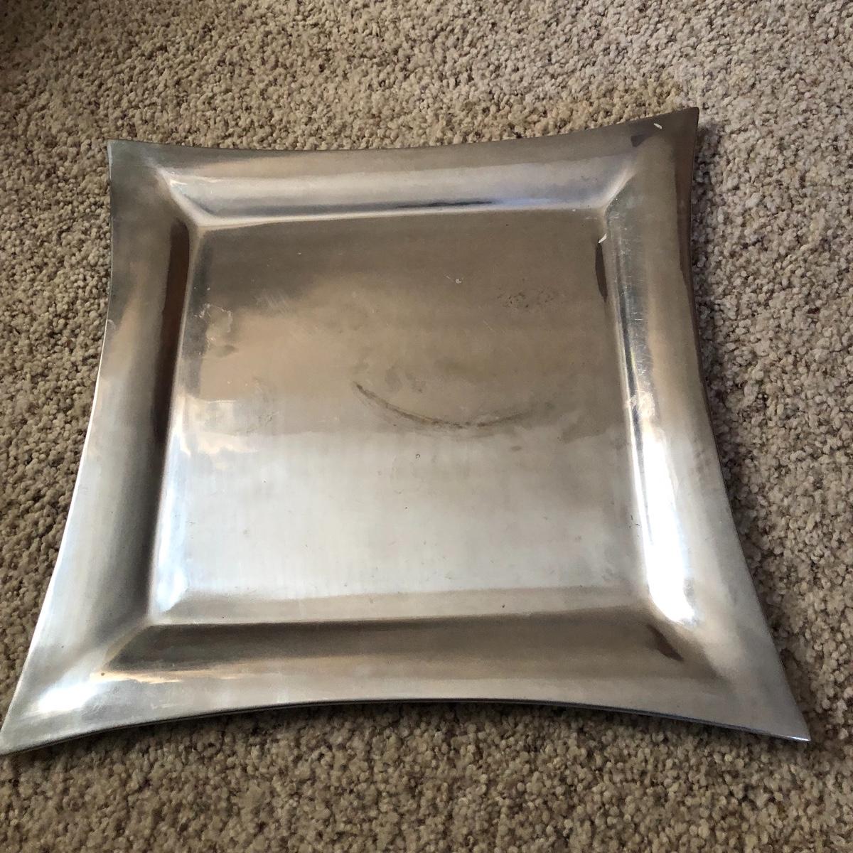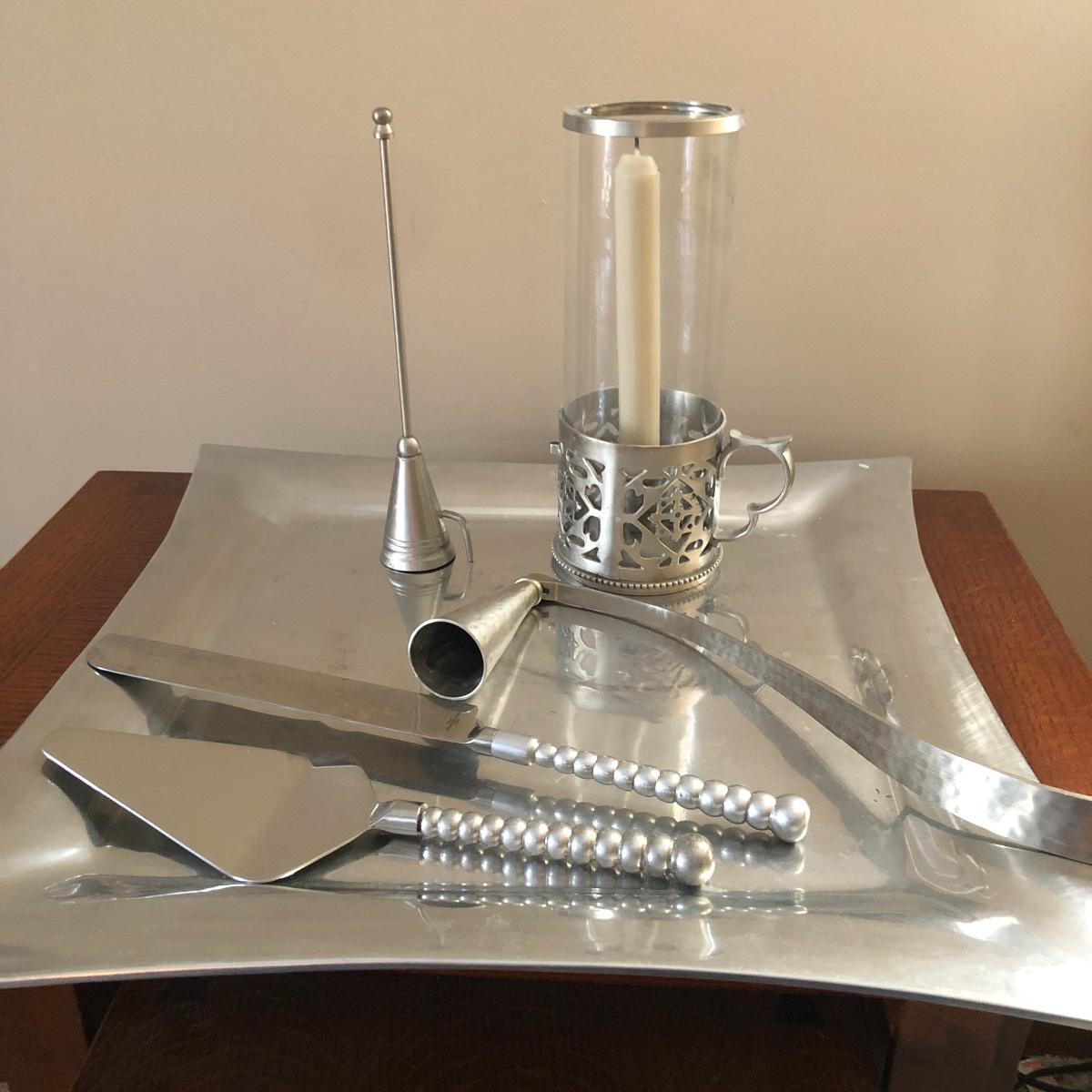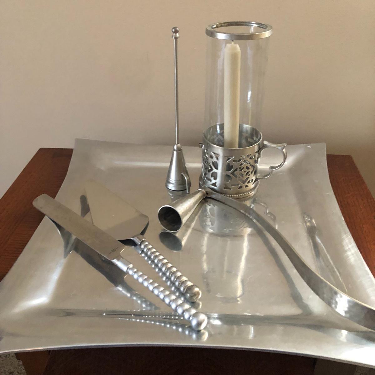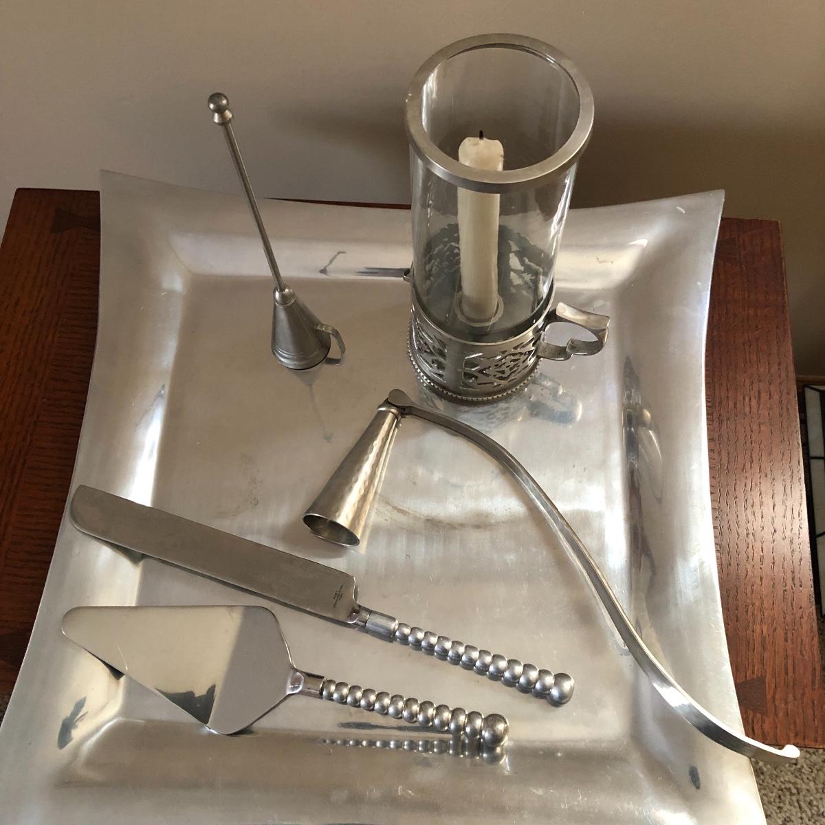 This lot includes a square beveled tray which measures 17.5” x 17.5”. It appears to be made of chrome. The pewter like candle holder with accompanying snuffer is 3.5” in diameter and 9.5” tall. The additional snuffer has a hammered pewter-style look. And finally, the Pier One knobbed pie server and knife is stainless steel, from India. Shipping Available.