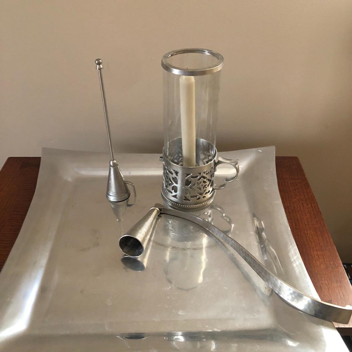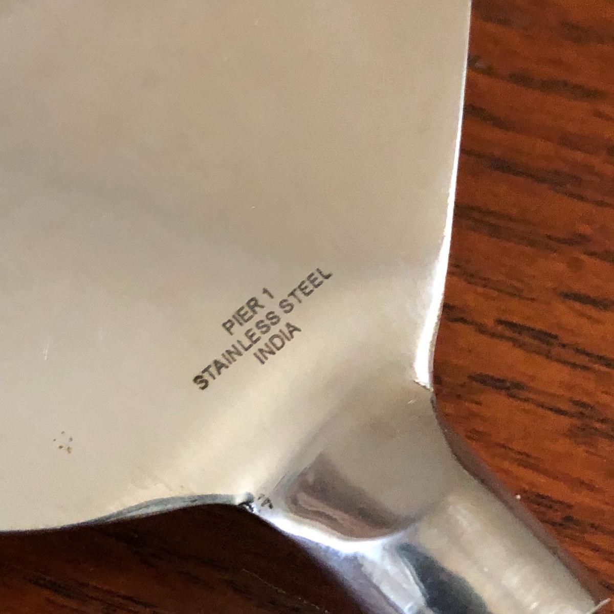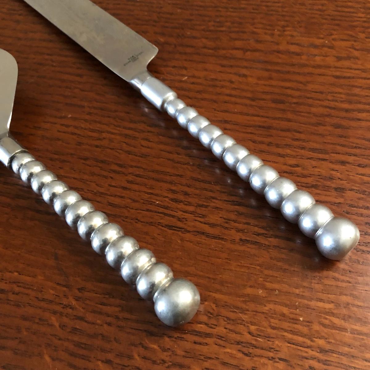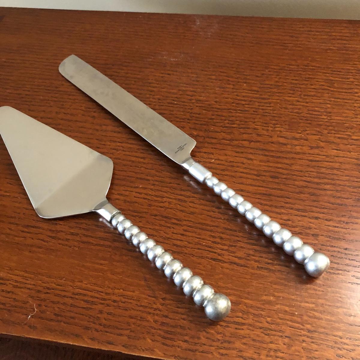 This lot includes a square beveled tray which measures 17.5” x 17.5”. It appears to be made of chrome. The pewter like candle holder with accompanying snuffer is 3.5” in diameter and 9.5” tall. The additional snuffer has a hammered pewter-style look. And finally, the Pier One knobbed pie server and knife is stainless steel, from India. Shipping Available.