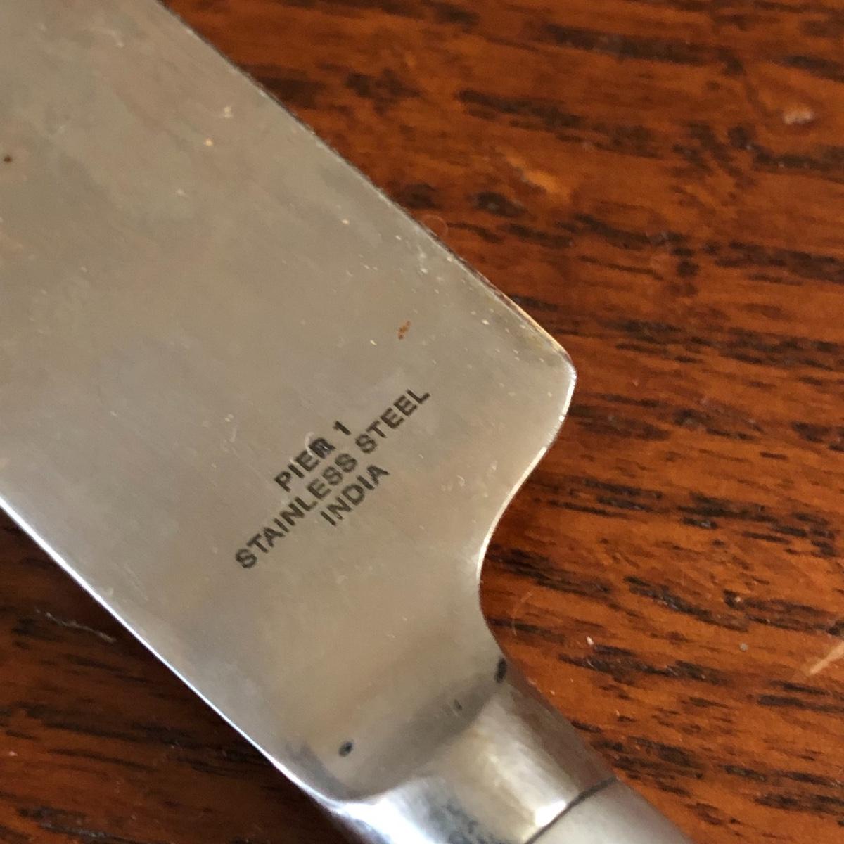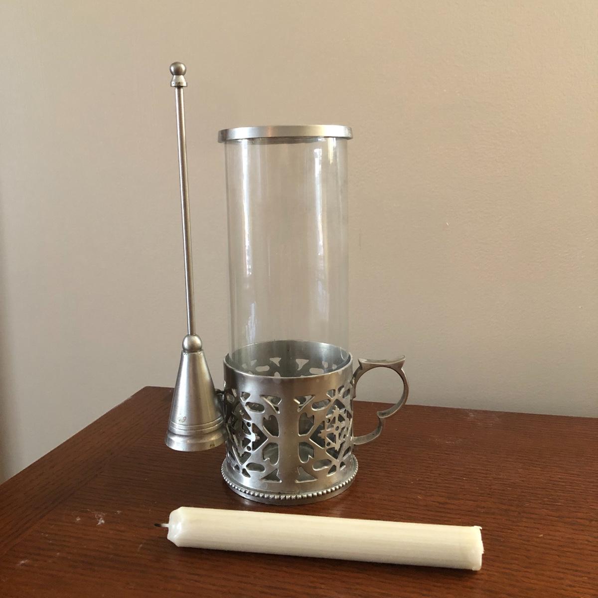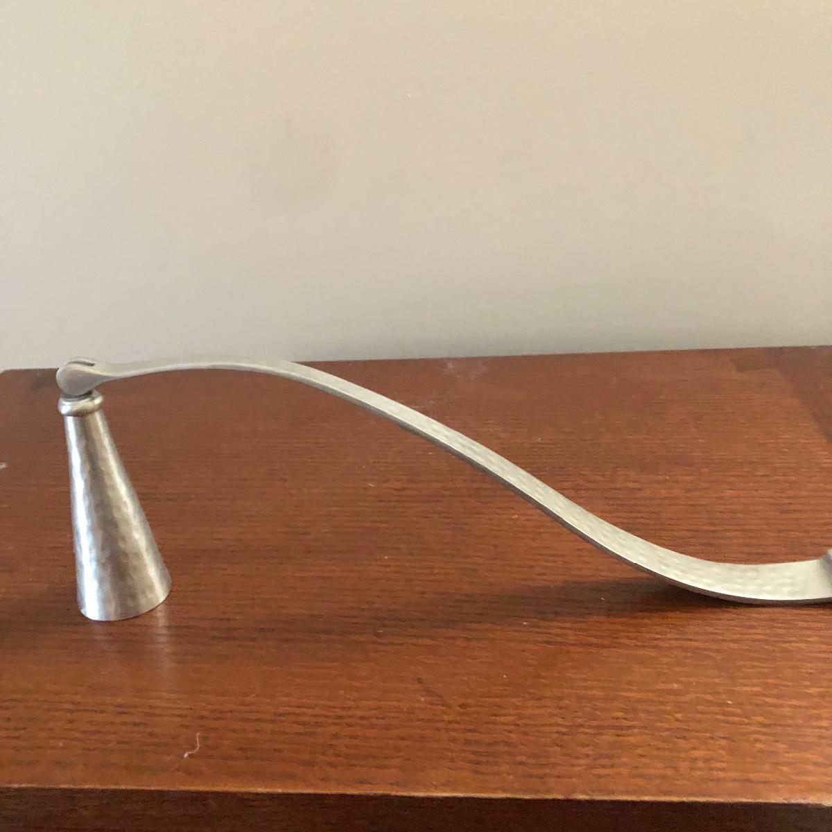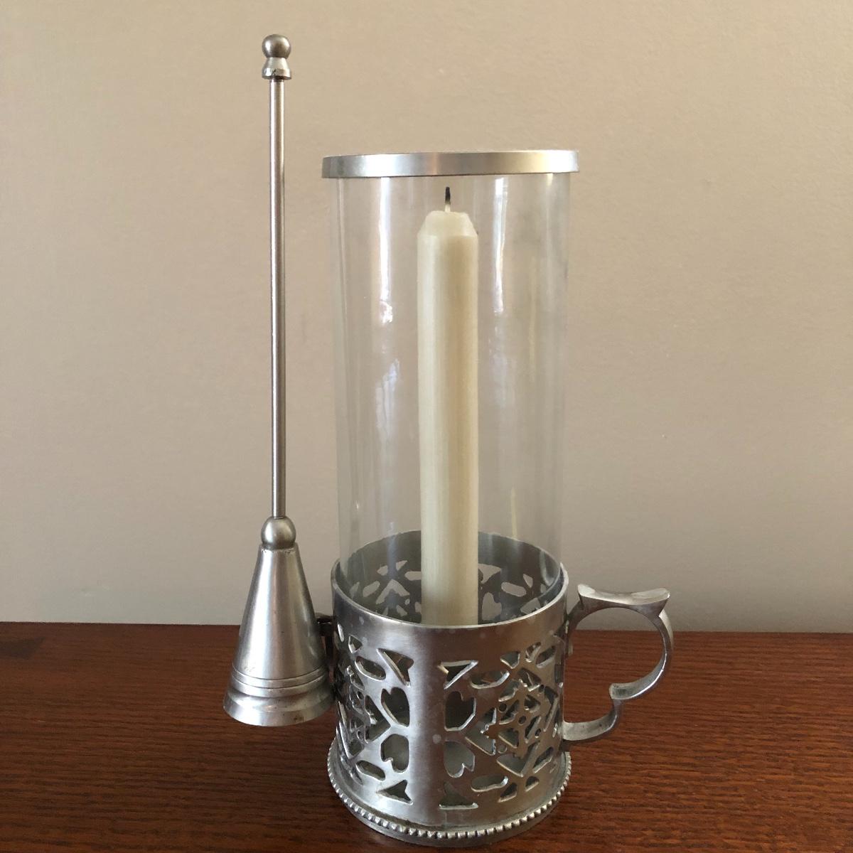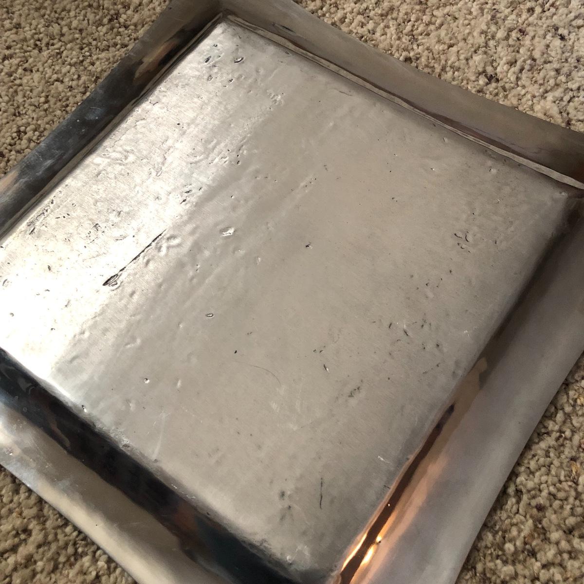 This lot includes a square beveled tray which measures 17.5” x 17.5”. It appears to be made of chrome. The pewter like candle holder with accompanying snuffer is 3.5” in diameter and 9.5” tall. The additional snuffer has a hammered pewter-style look. And finally, the Pier One knobbed pie server and knife is stainless steel, from India. Shipping Available.
