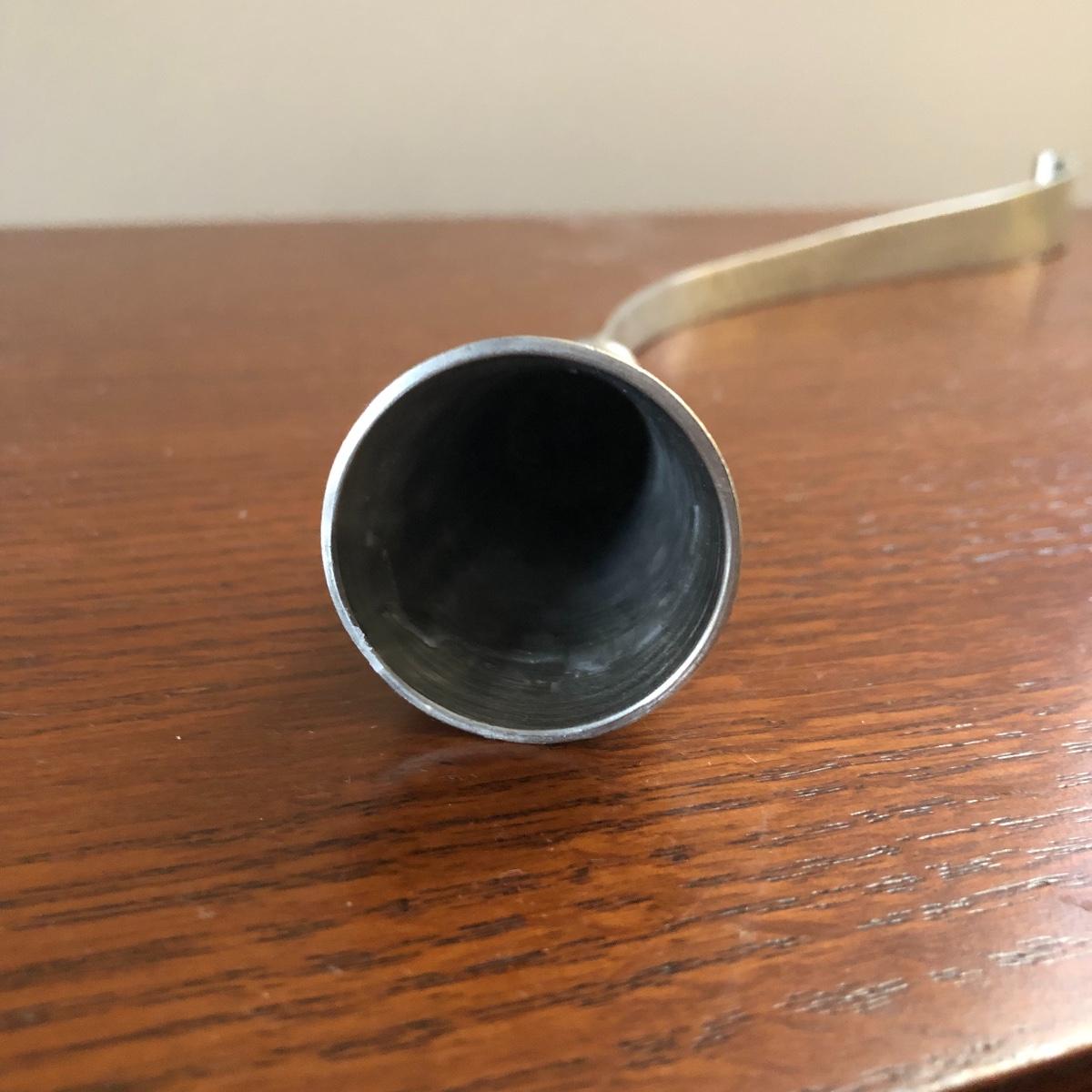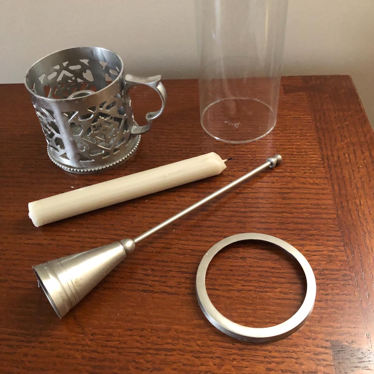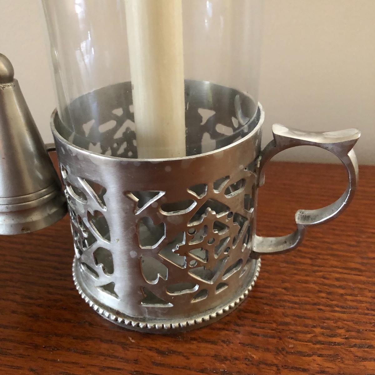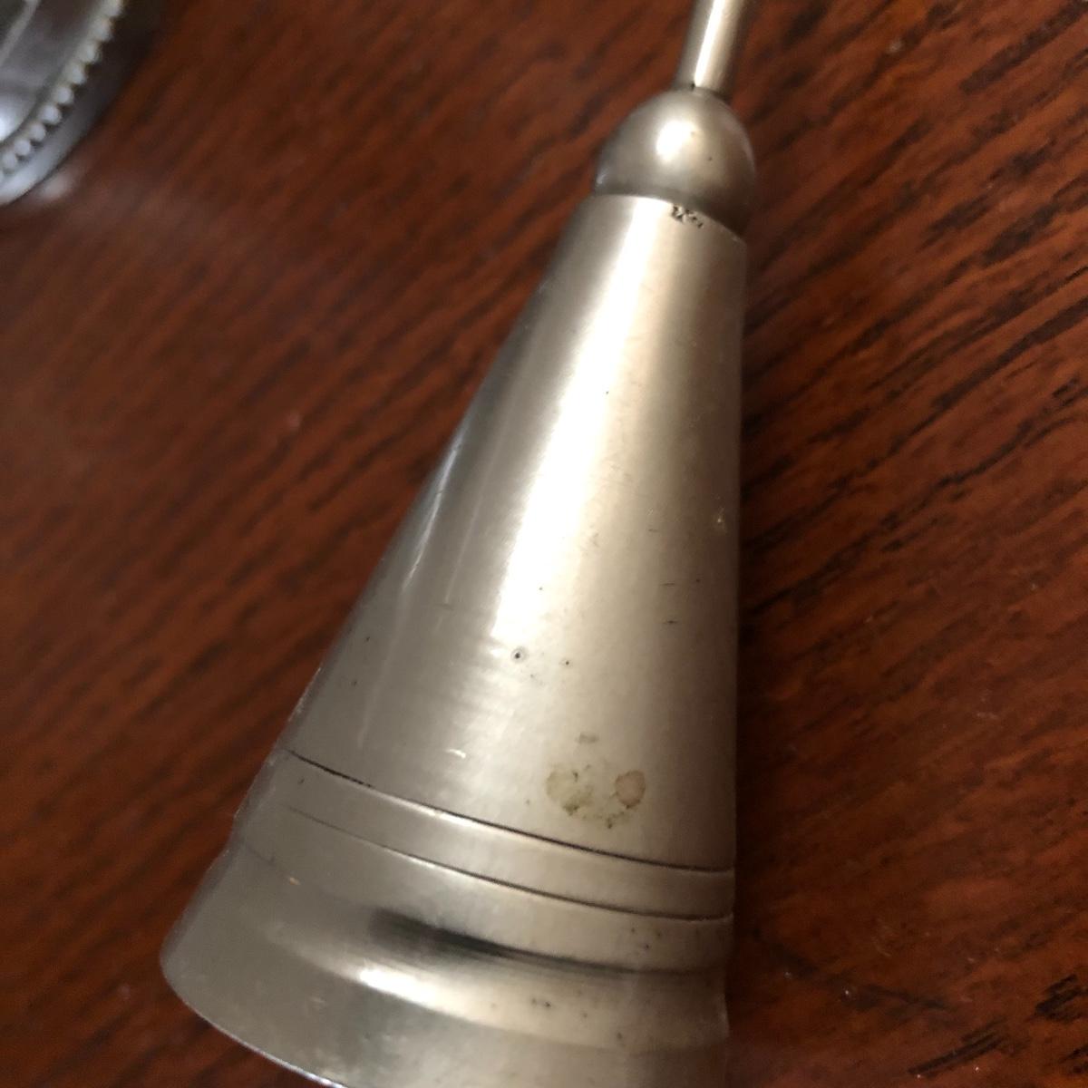 This lot includes a square beveled tray which measures 17.5” x 17.5”. It appears to be made of chrome. The pewter like candle holder with accompanying snuffer is 3.5” in diameter and 9.5” tall. The additional snuffer has a hammered pewter-style look. And finally, the Pier One knobbed pie server and knife is stainless steel, from India. Shipping Available.
