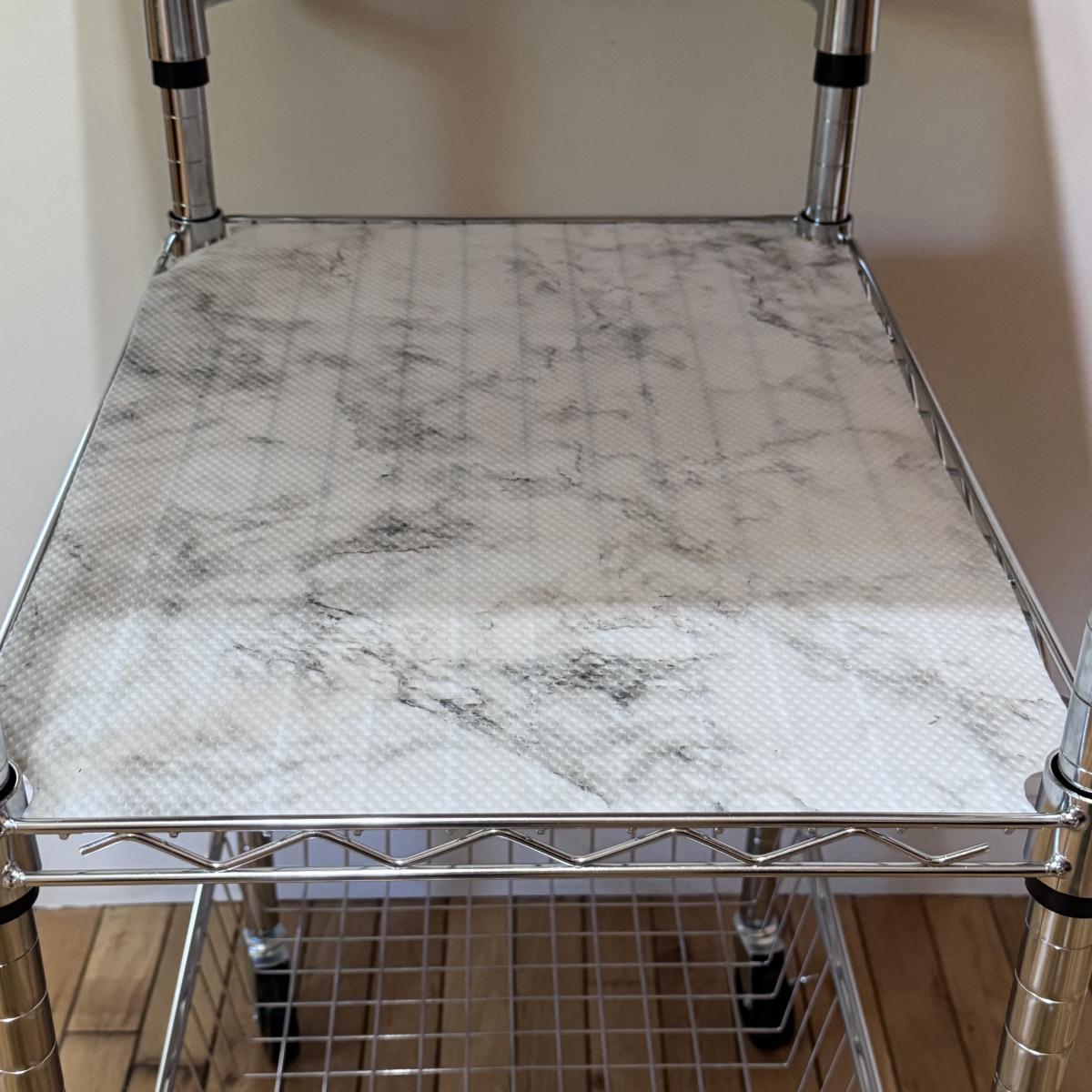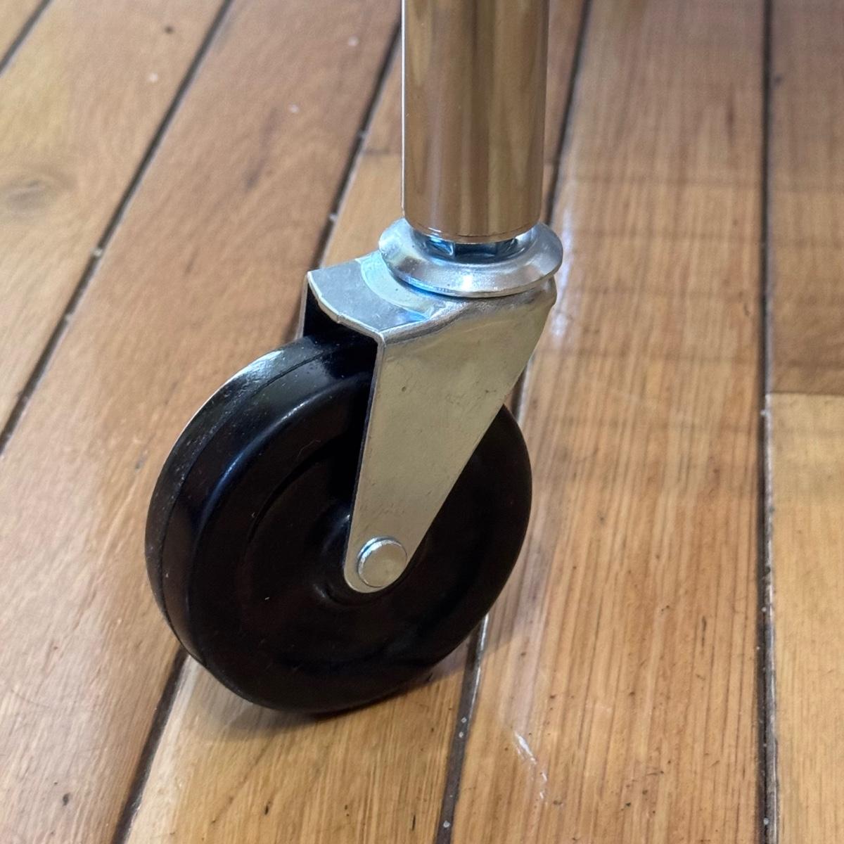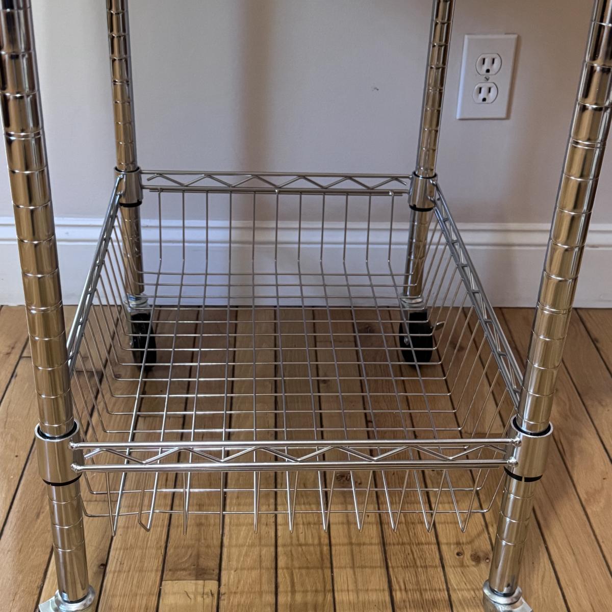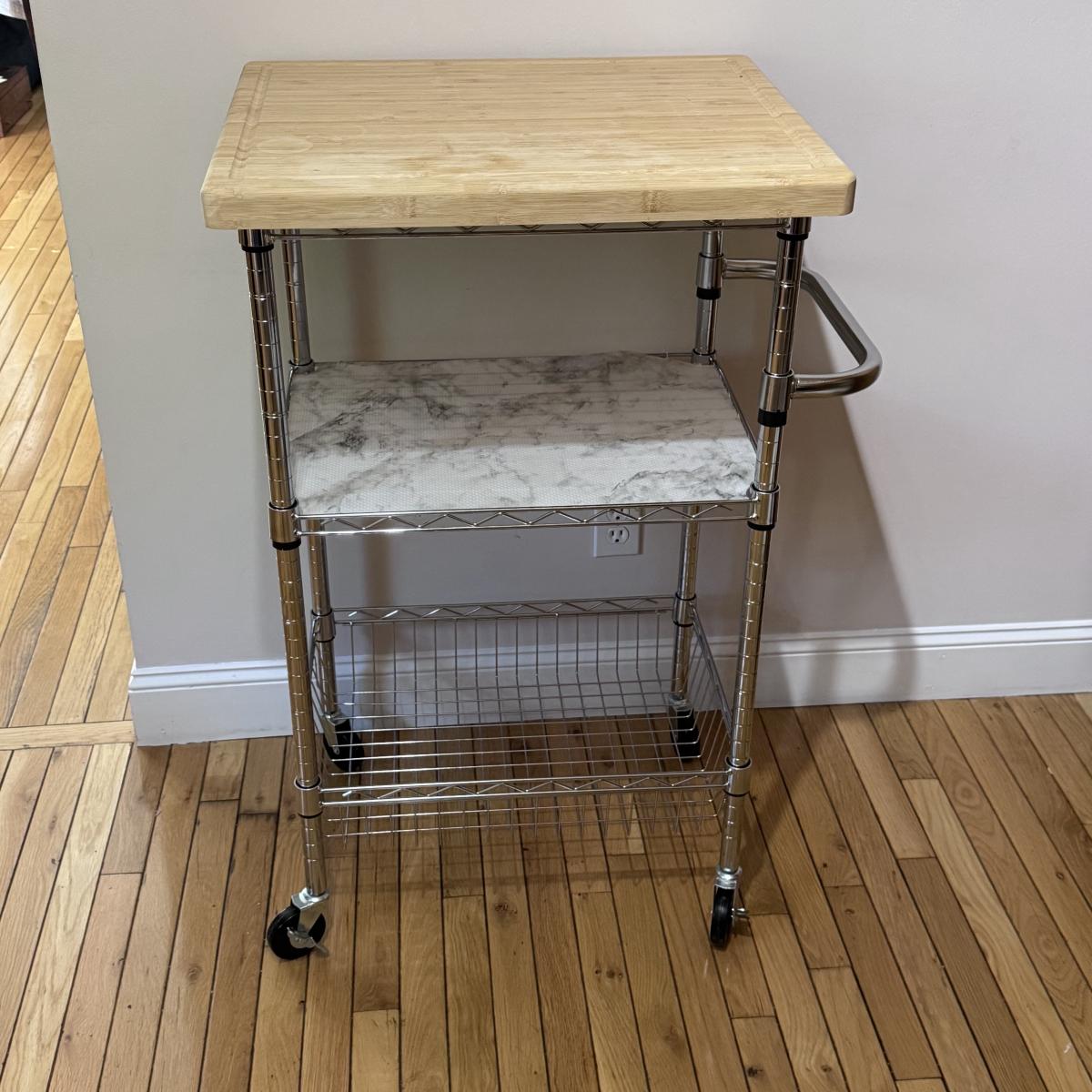 This lot includes one chrome rolling kitchen cart with a removable butcher block top and an attached sheet of plastic on the middle shelf. The cart measures 28” x 19.5” x 40”H. At the bottom of the cart are four wheels that can lock in place. Local pickup only.