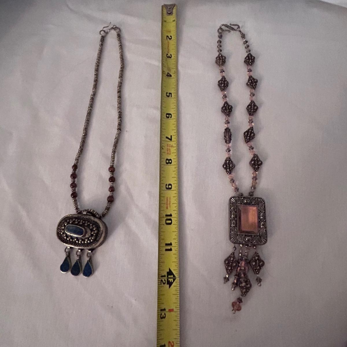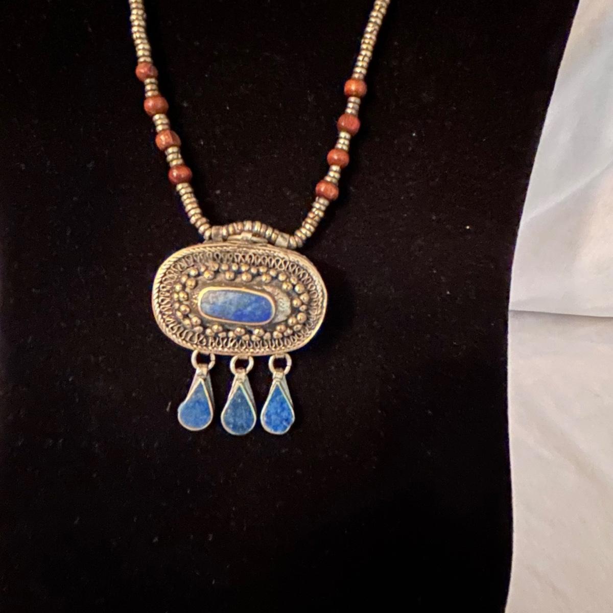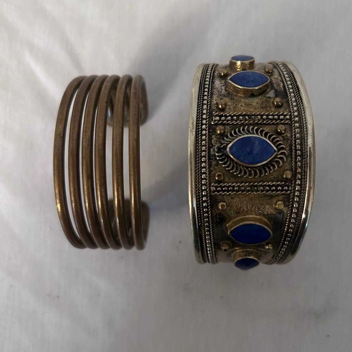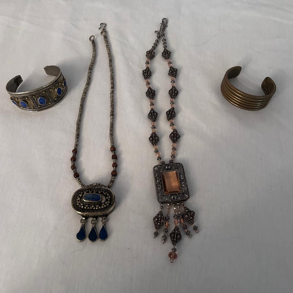 Lot contains four pieces of jewelry. Two necklaces and two bracelets in mostly brass material. The blue stones necklace appears to be a box pendant but does not open. Shipping available.