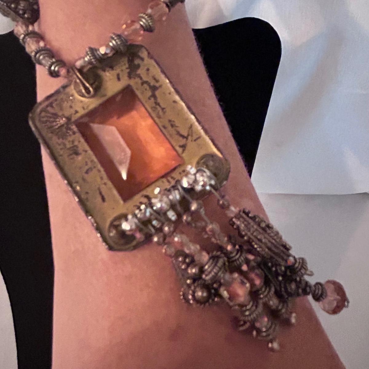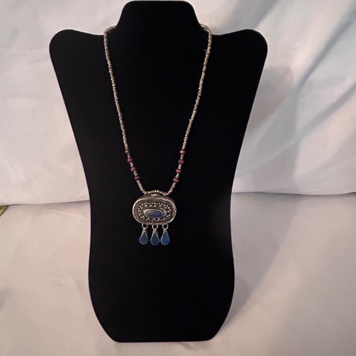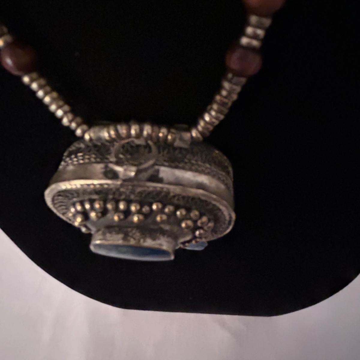 Lot contains four pieces of jewelry. Two necklaces and two bracelets in mostly brass material. The blue stones necklace appears to be a box pendant but does not open. Shipping available.