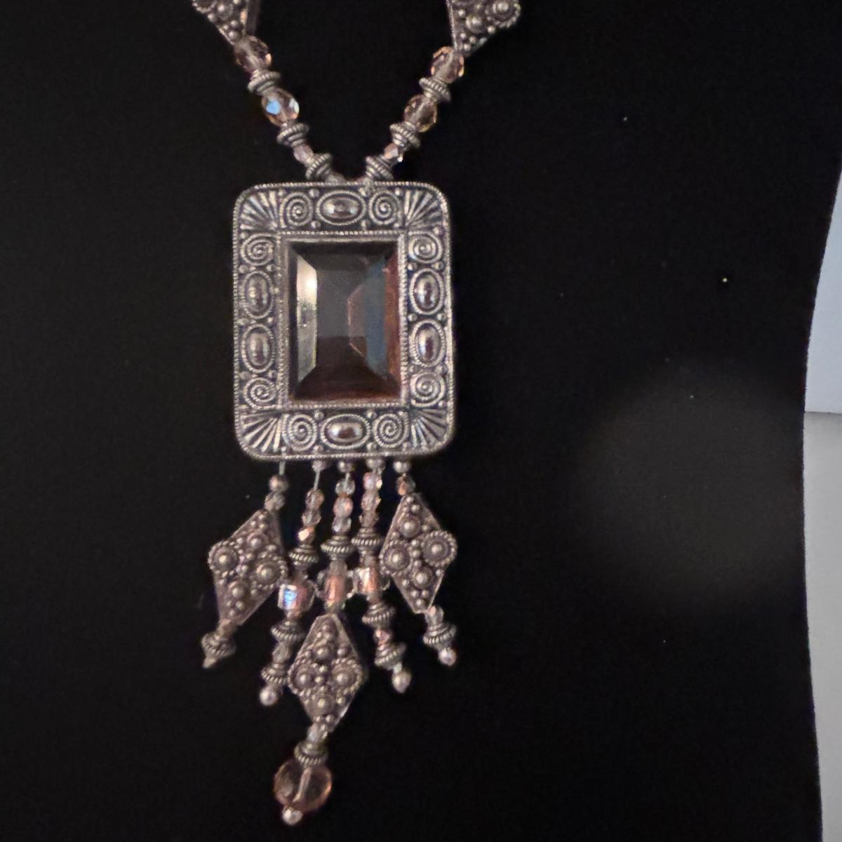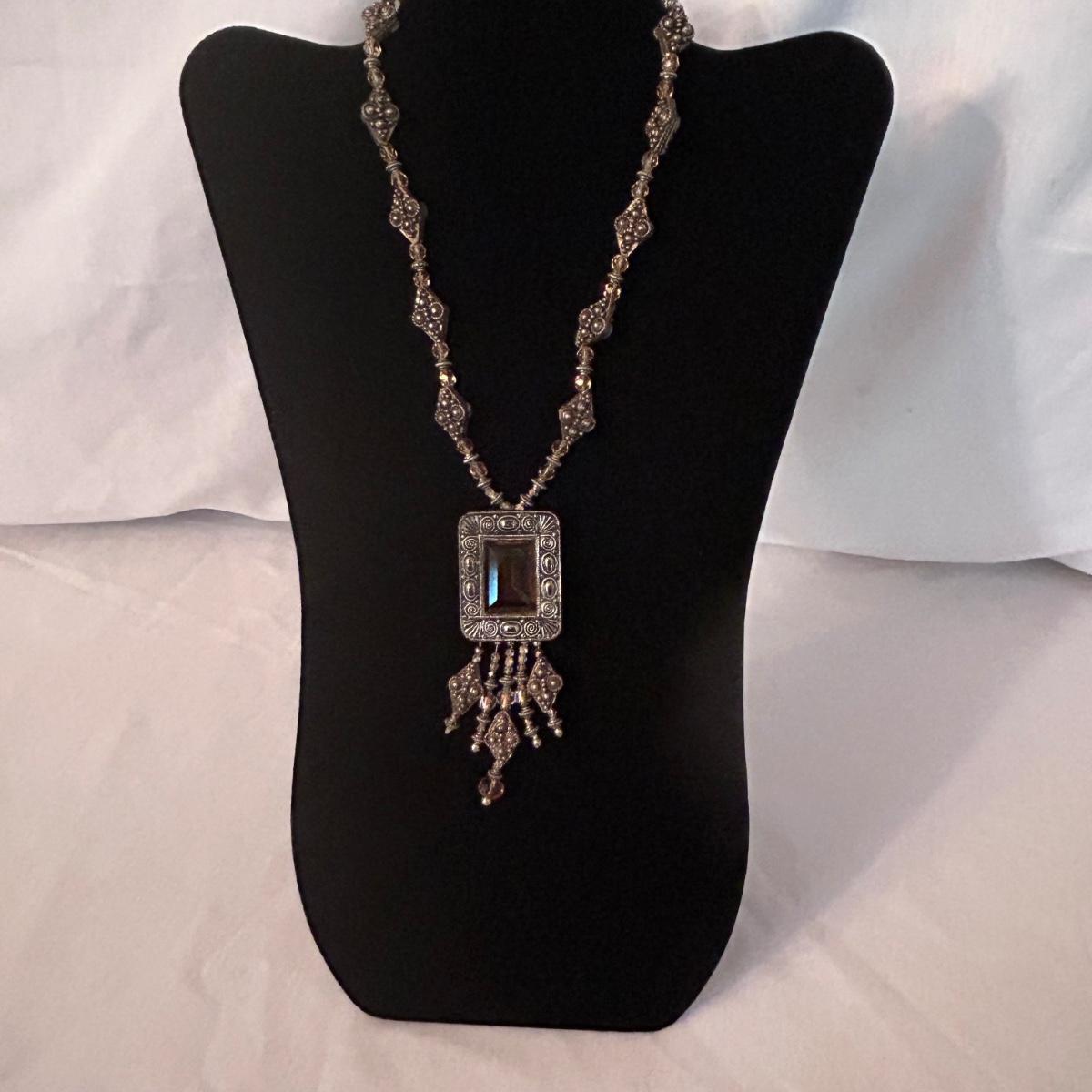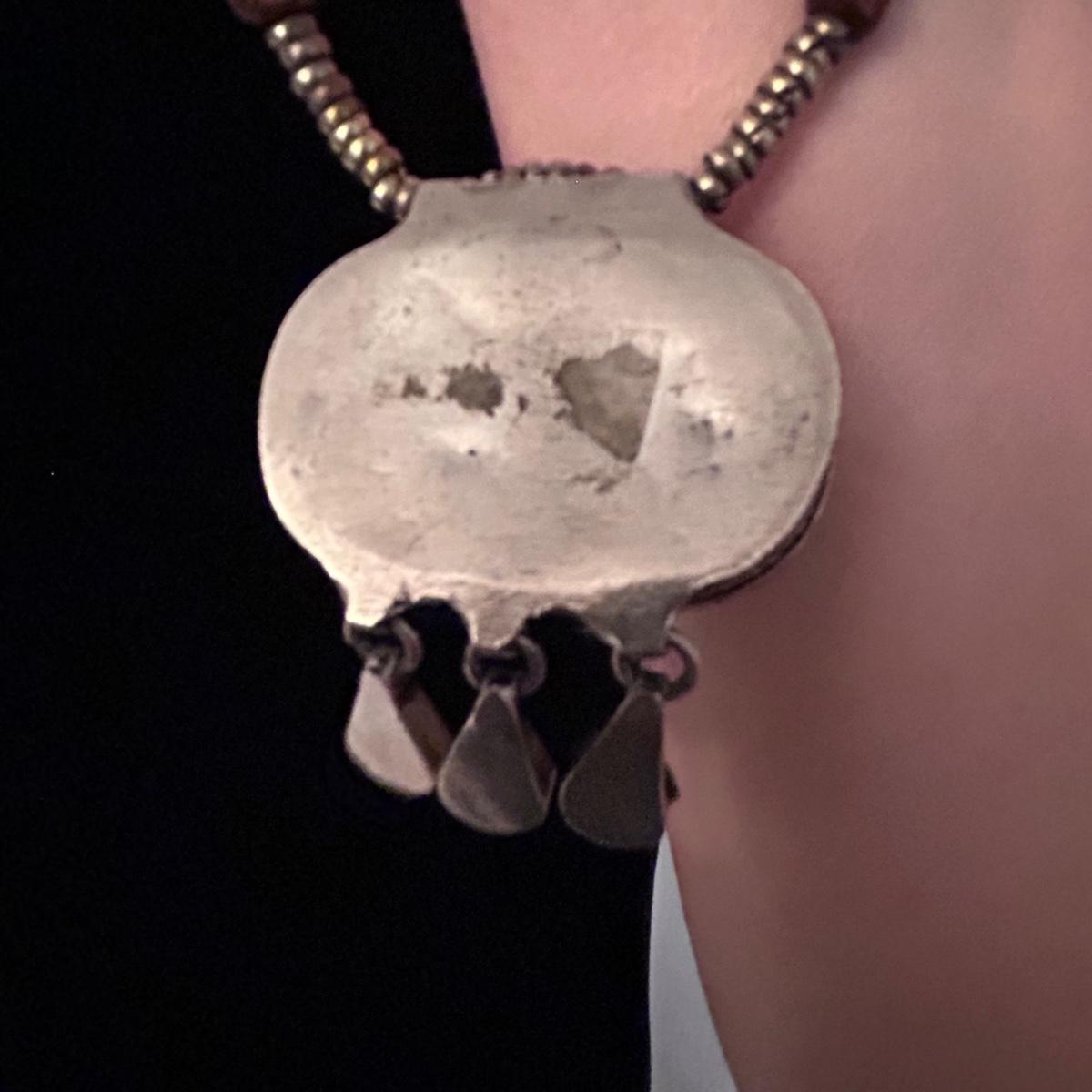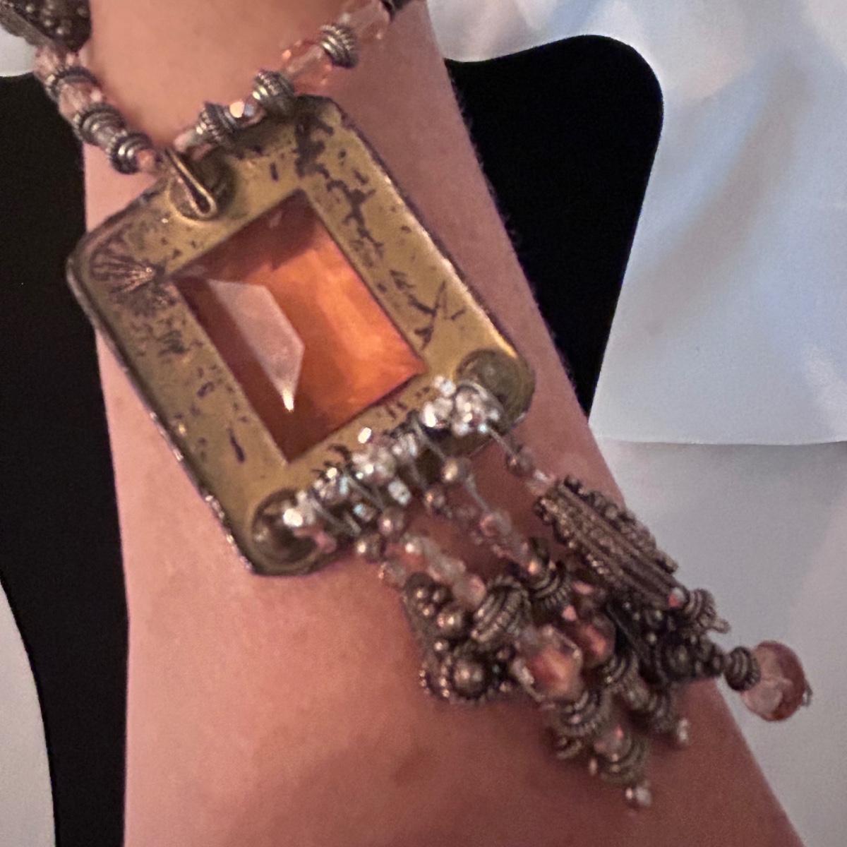 Lot contains four pieces of jewelry. Two necklaces and two bracelets in mostly brass material. The blue stones necklace appears to be a box pendant but does not open. Shipping available.