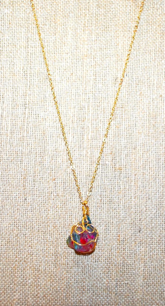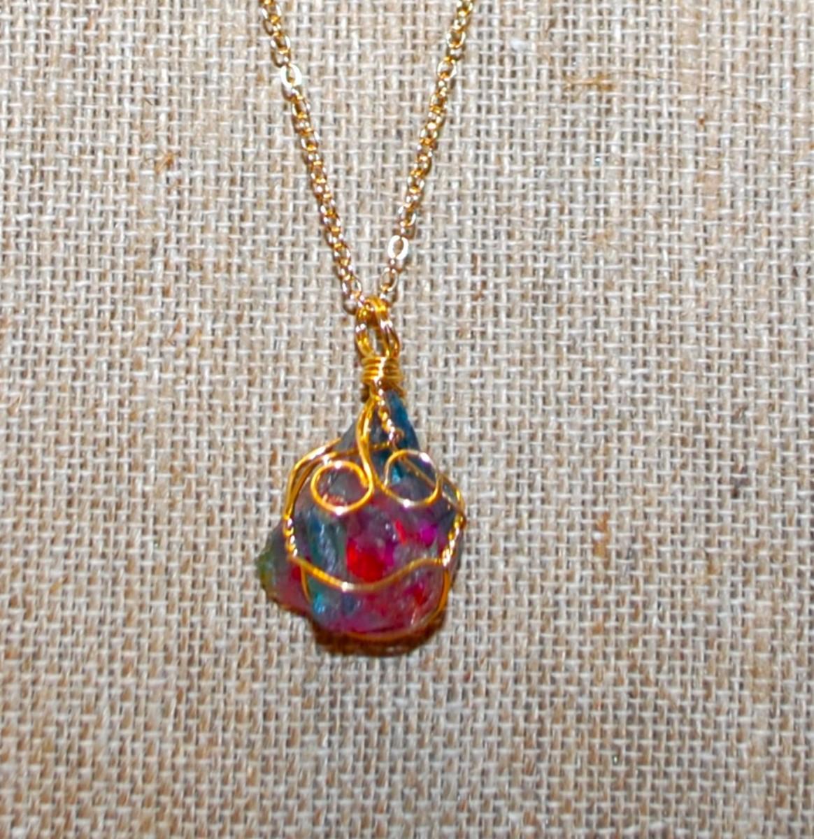 Chunky Colorful Wired Stone PENDANT (1¼" x 1") on a Gold Tone Necklace Chain 18" L