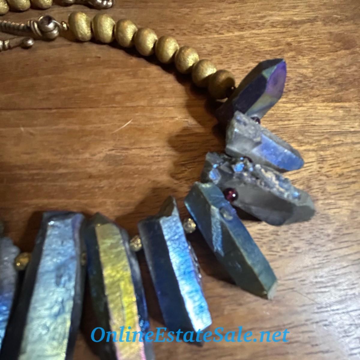 16in Chunky Blue Crystal and Gold Colored Bead Necklace with Vintage Hook and Eye Clasp