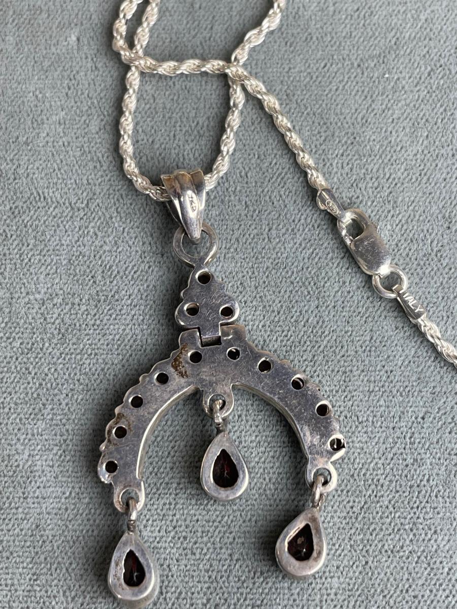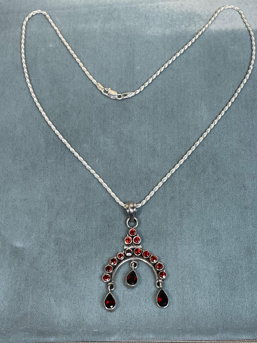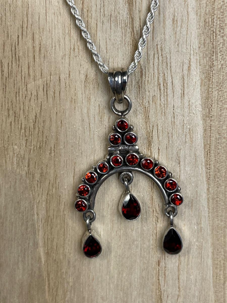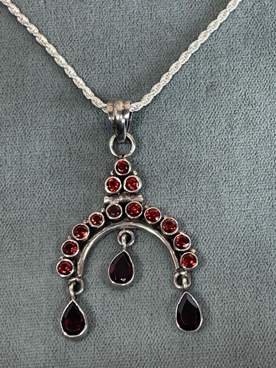 Genuine garnet stones in removable 2” pendant. With 18” rope chain.