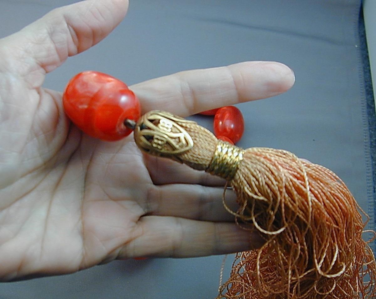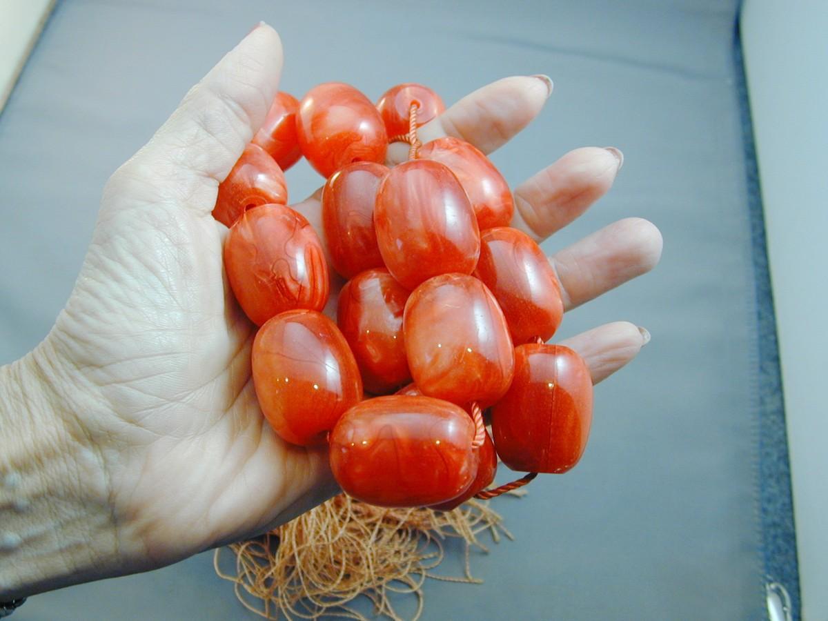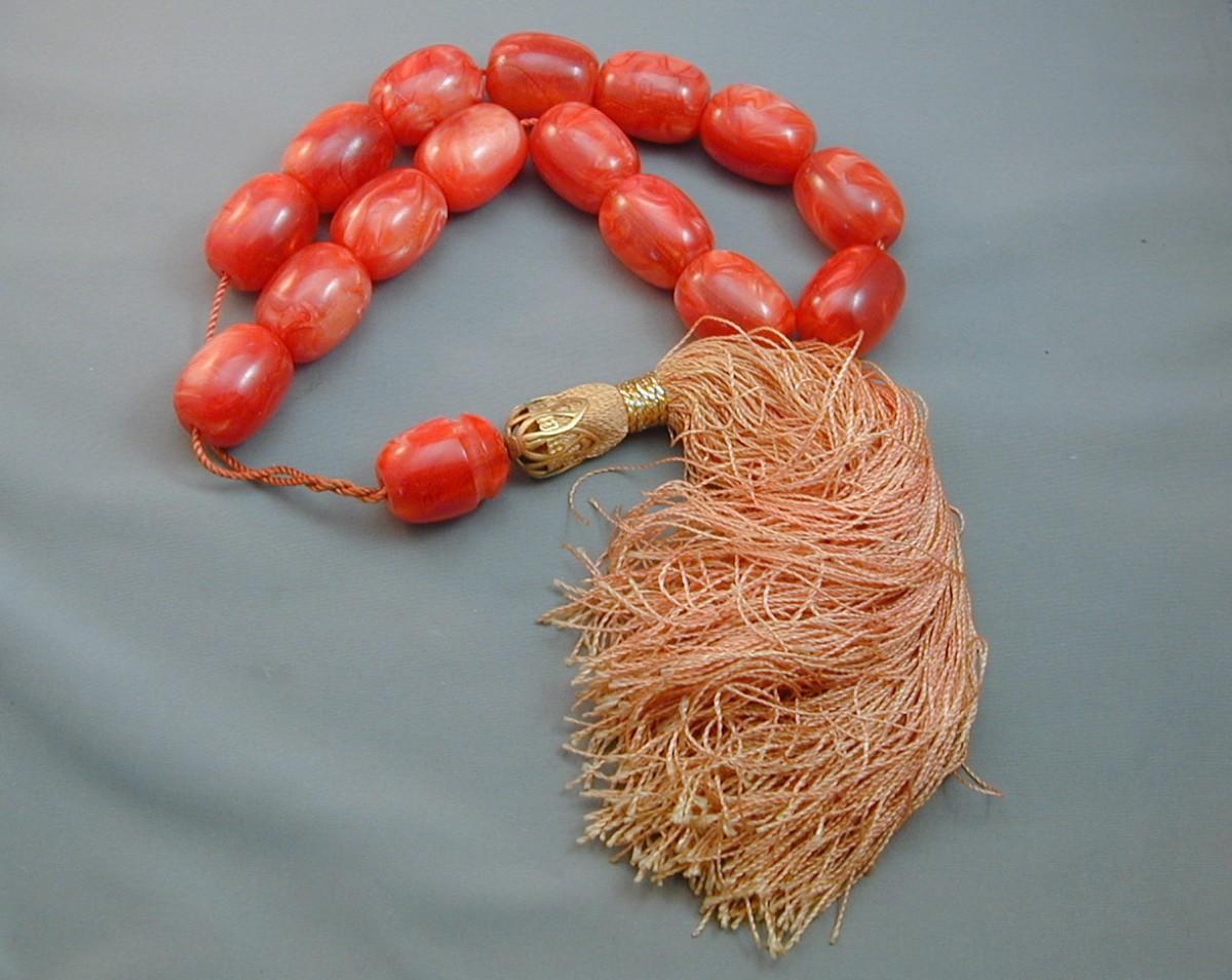 Chunky Marbled Islamic Prayer Beads Silk Tassel/cord 24" long - some sort of marbled lucite/plastic. The beads are1 3/16" long. Some discoloration on the silk.