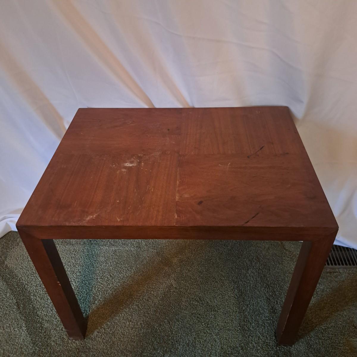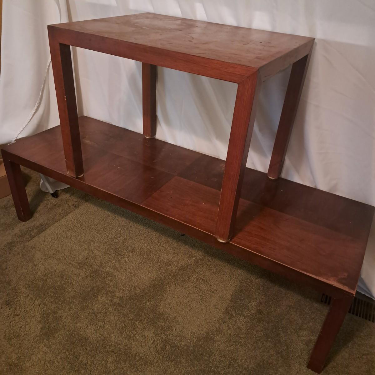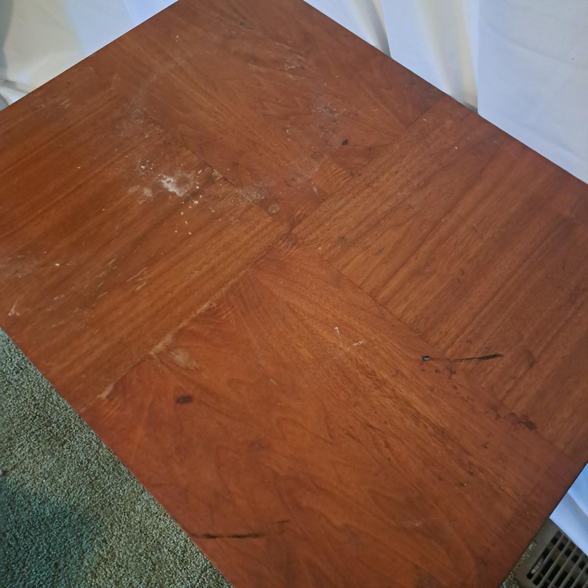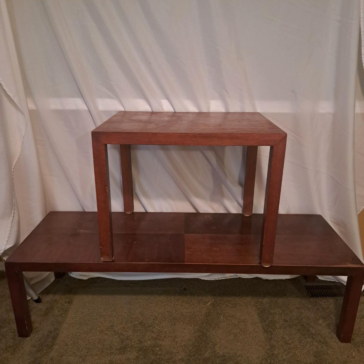 A matching pair: one Lane coffee table is 55" x 19" x 15"H and the matching Lane side table is 26" x 20" x 20.5"H. Both have a parquet-style tops and cool chunky square legs similar to a Parsons table. Both appear to be quite sturdy; however, both pieces have some surface scuffs and scratches as well as scattered water marks. Local pickup only.