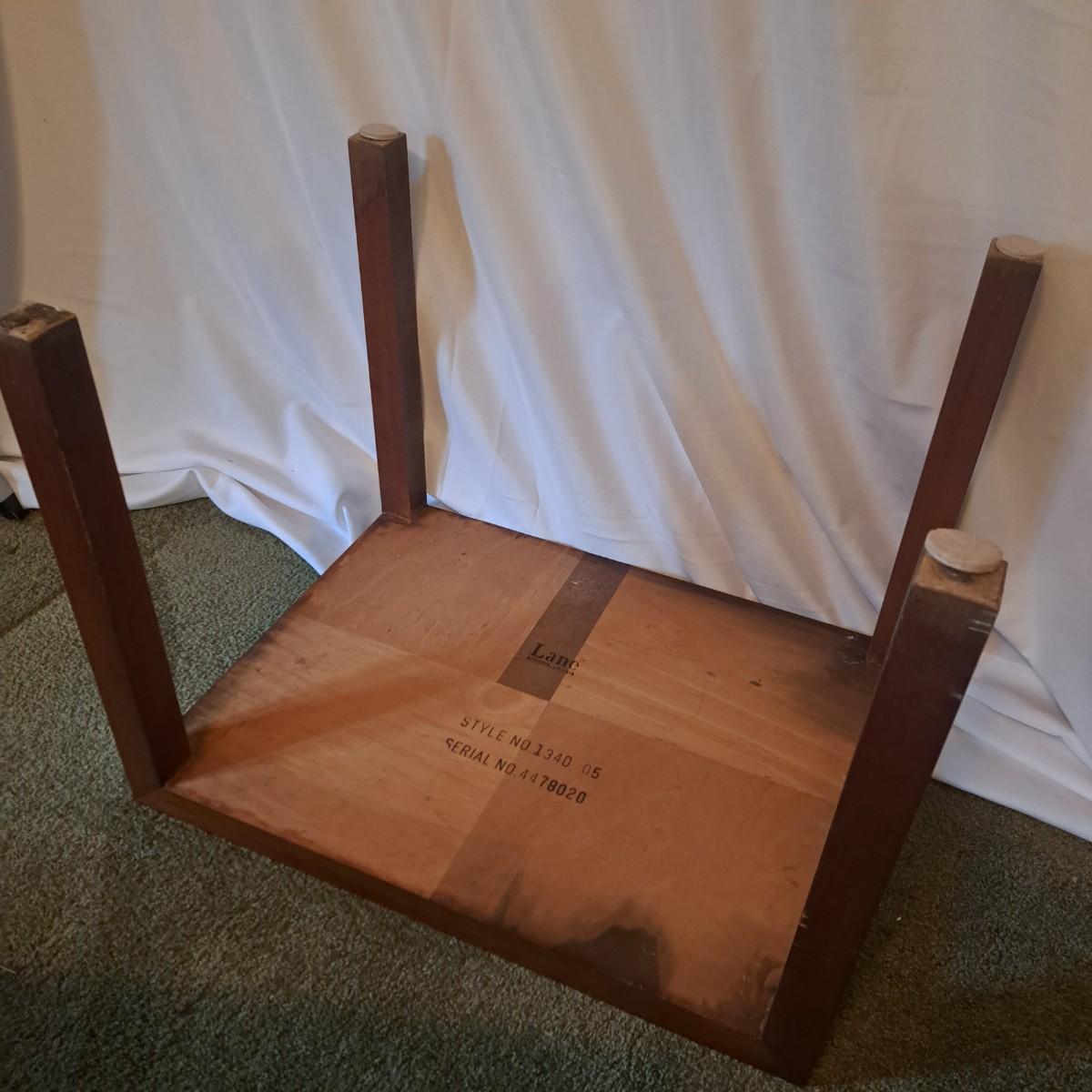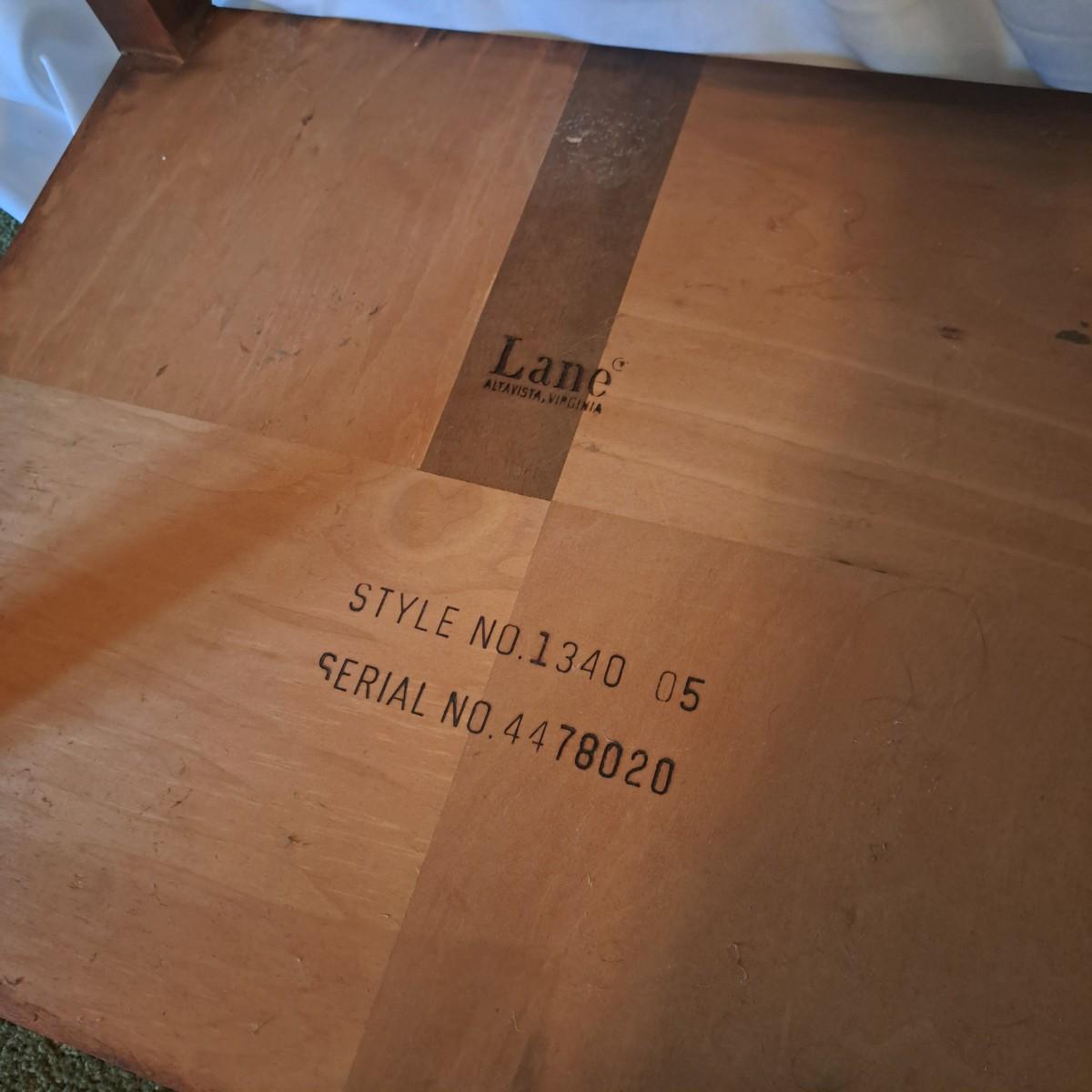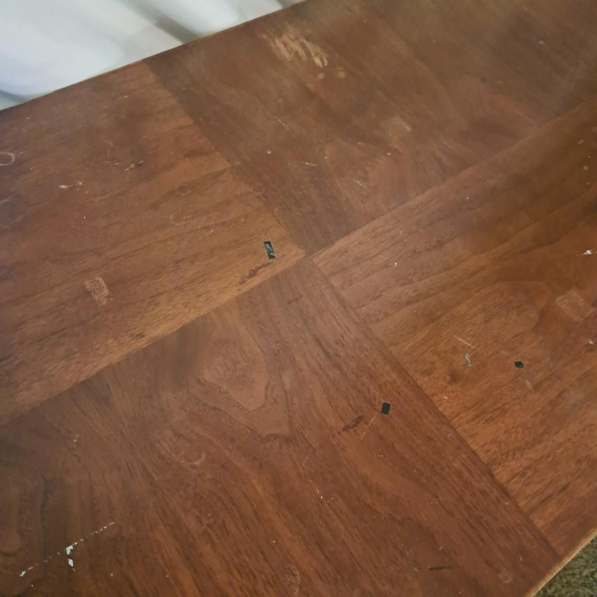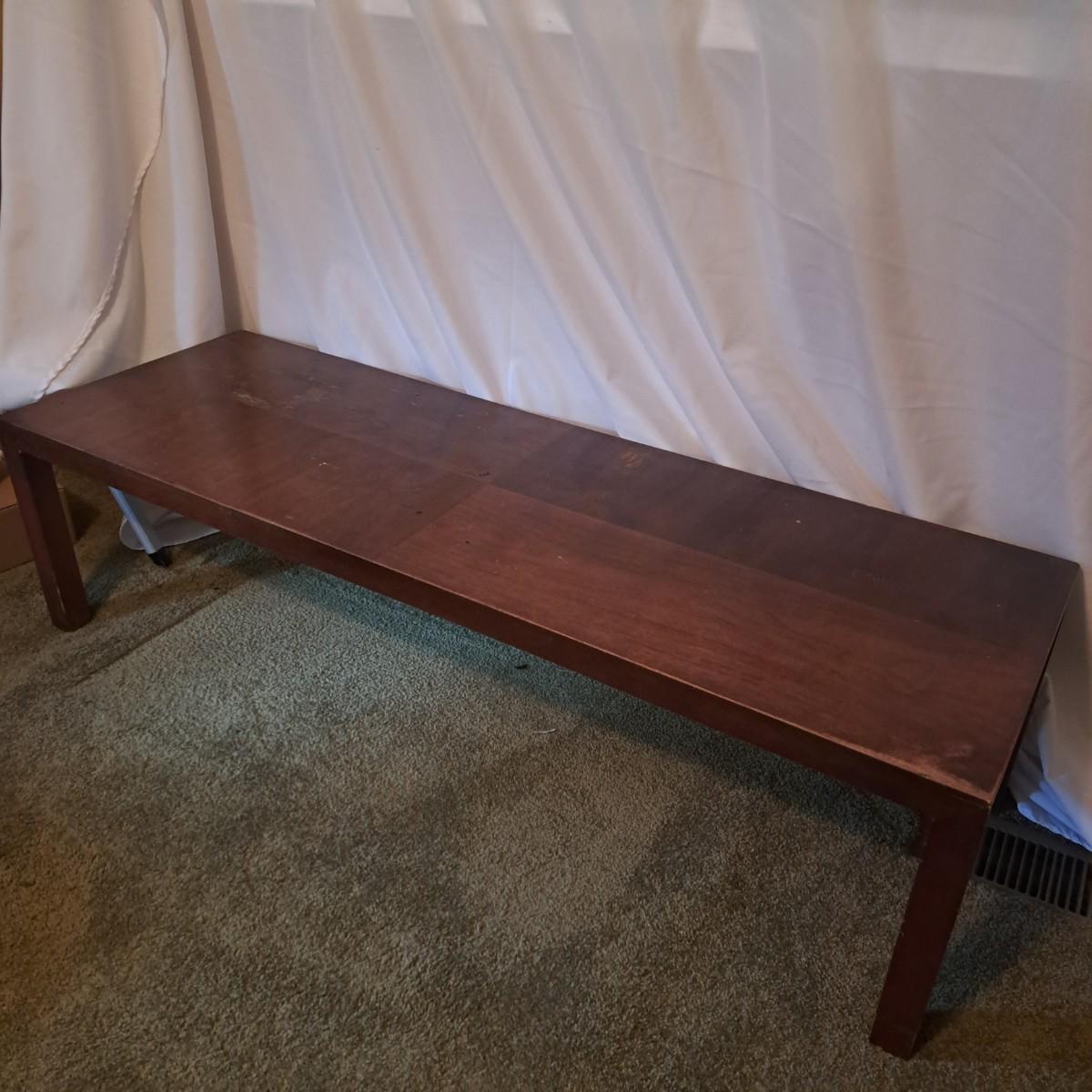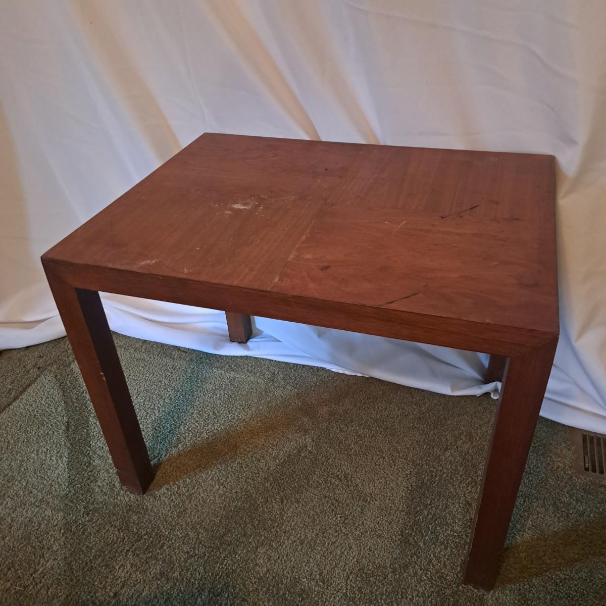 A matching pair: one Lane coffee table is 55" x 19" x 15"H and the matching Lane side table is 26" x 20" x 20.5"H. Both have a parquet-style tops and cool chunky square legs similar to a Parsons table. Both appear to be quite sturdy; however, both pieces have some surface scuffs and scratches as well as scattered water marks. Local pickup only.