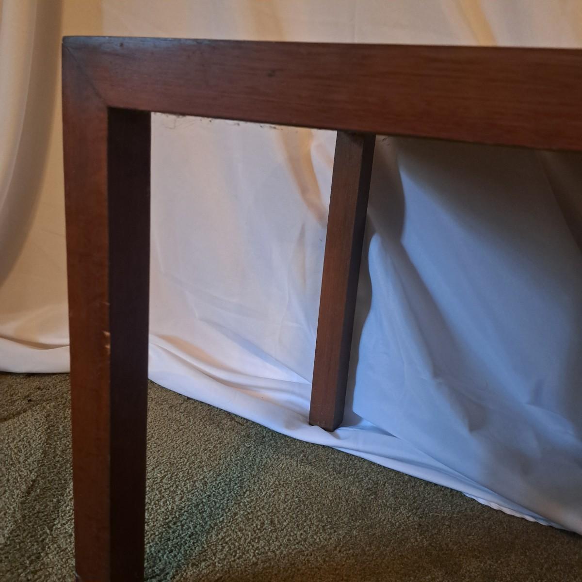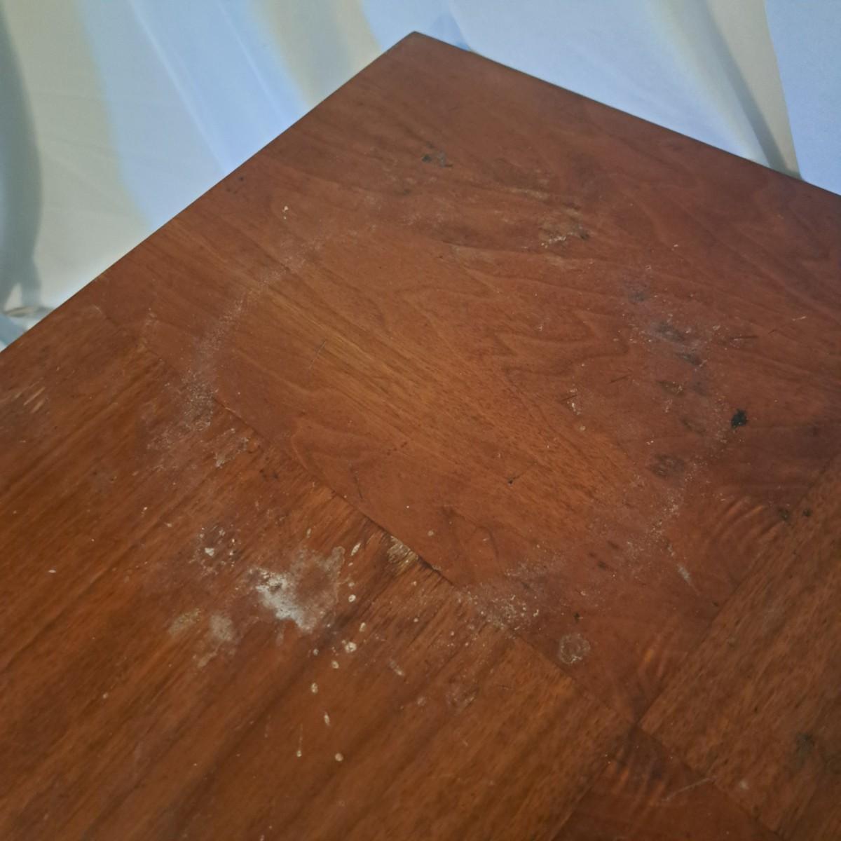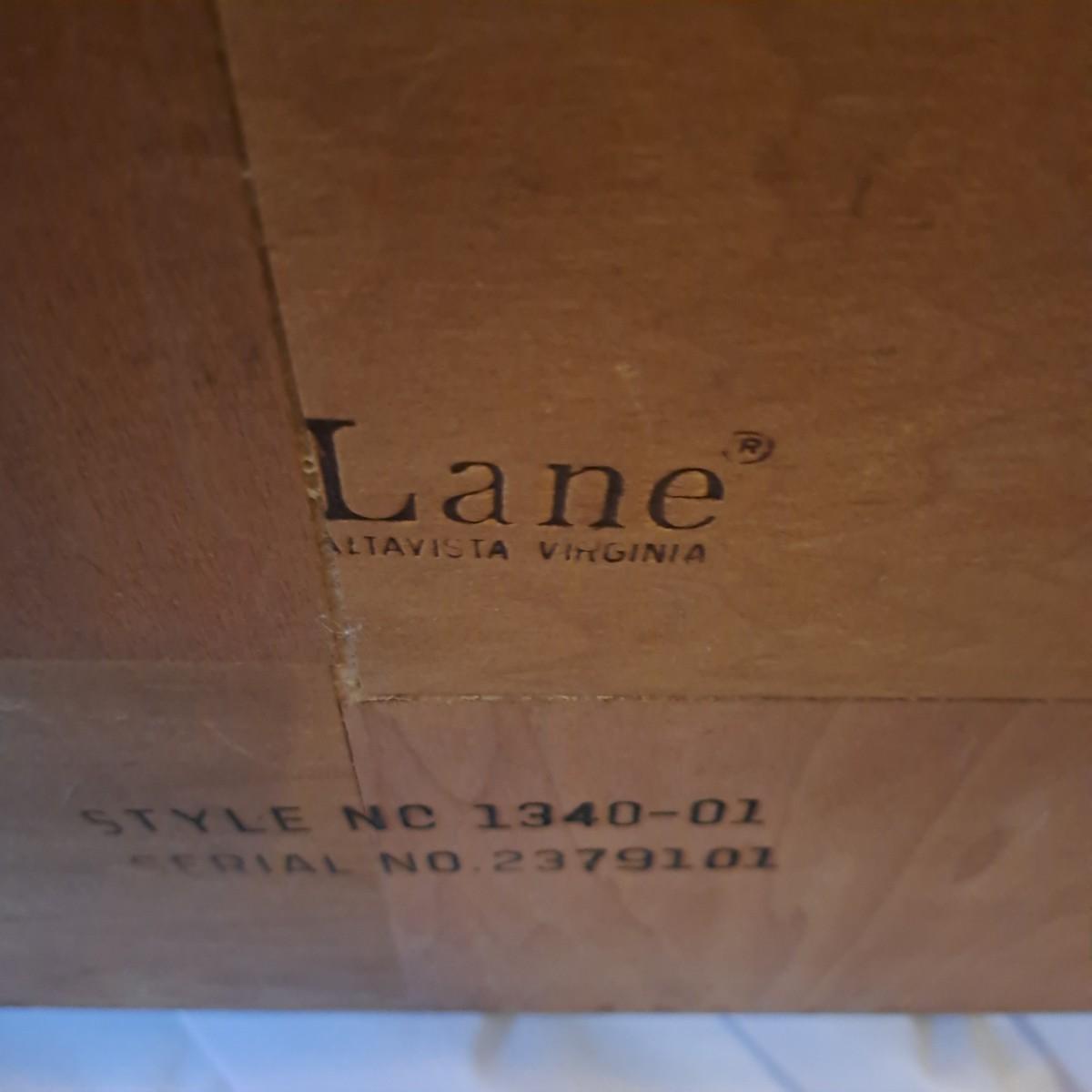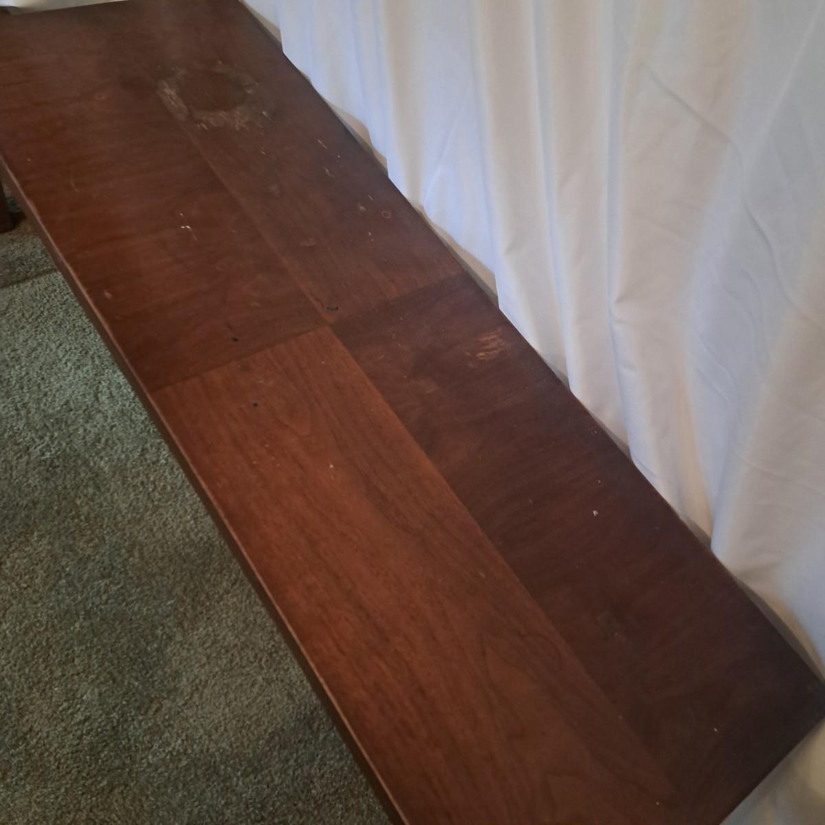 A matching pair: one Lane coffee table is 55" x 19" x 15"H and the matching Lane side table is 26" x 20" x 20.5"H. Both have a parquet-style tops and cool chunky square legs similar to a Parsons table. Both appear to be quite sturdy; however, both pieces have some surface scuffs and scratches as well as scattered water marks. Local pickup only.
