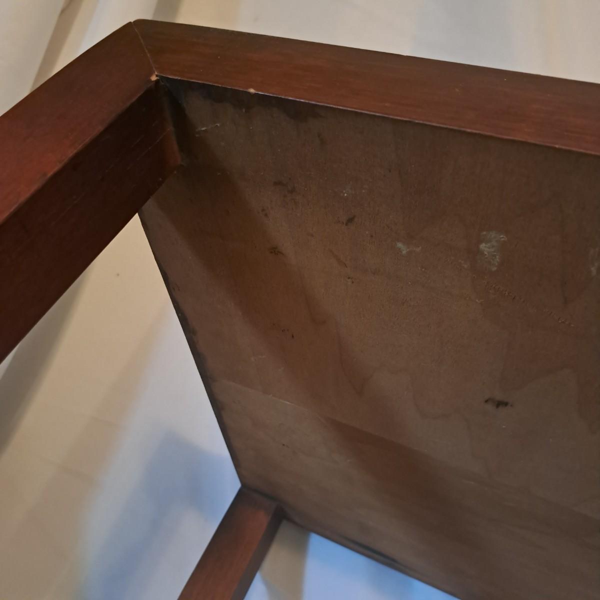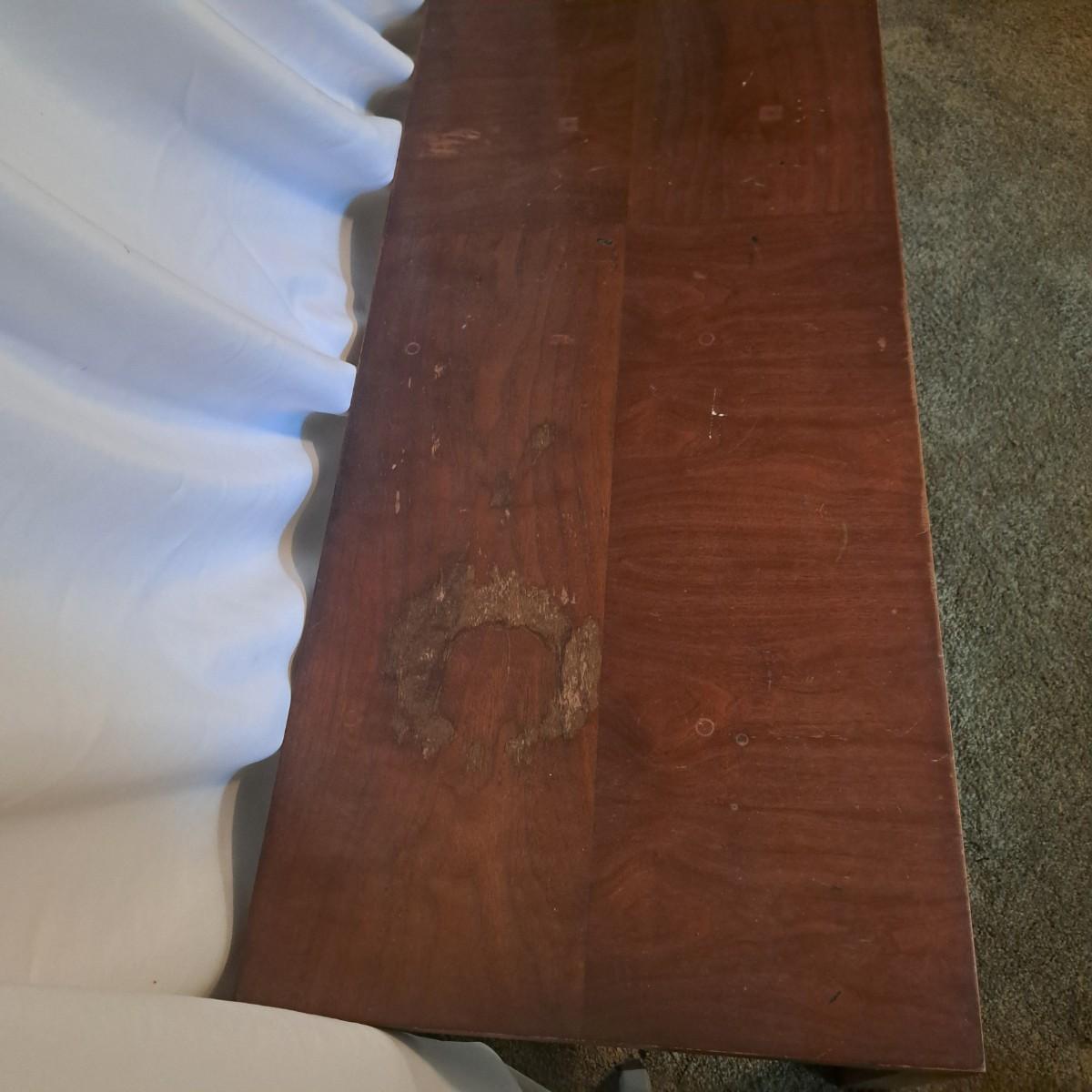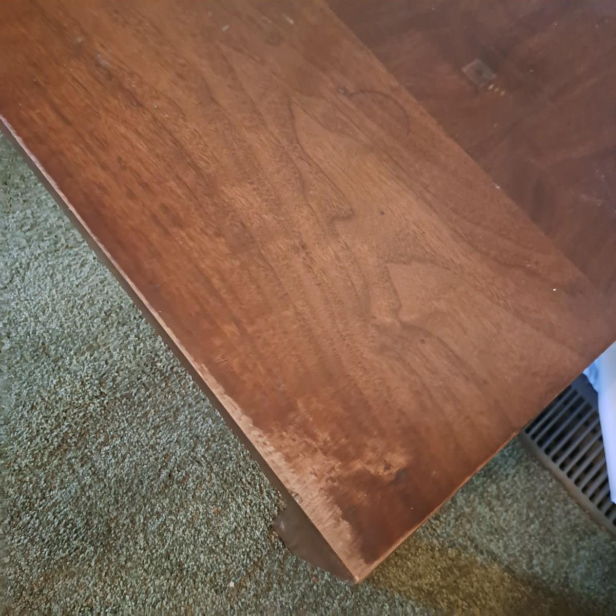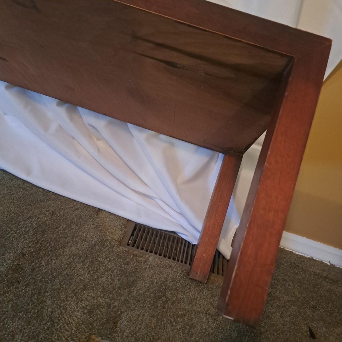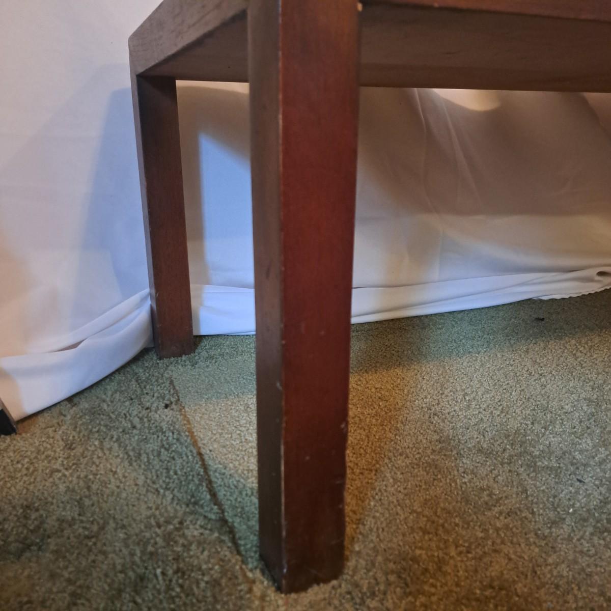 A matching pair: one Lane coffee table is 55" x 19" x 15"H and the matching Lane side table is 26" x 20" x 20.5"H. Both have a parquet-style tops and cool chunky square legs similar to a Parsons table. Both appear to be quite sturdy; however, both pieces have some surface scuffs and scratches as well as scattered water marks. Local pickup only.