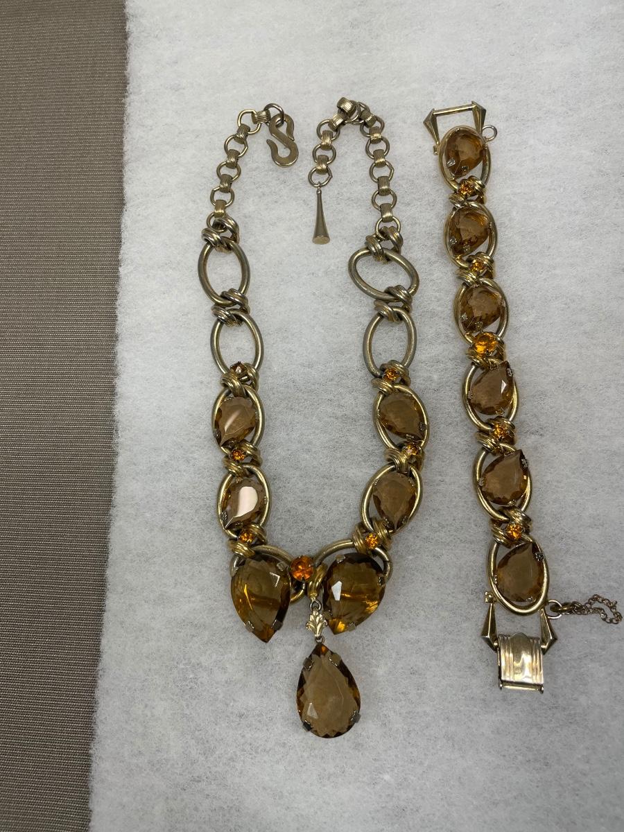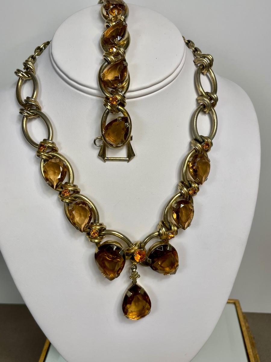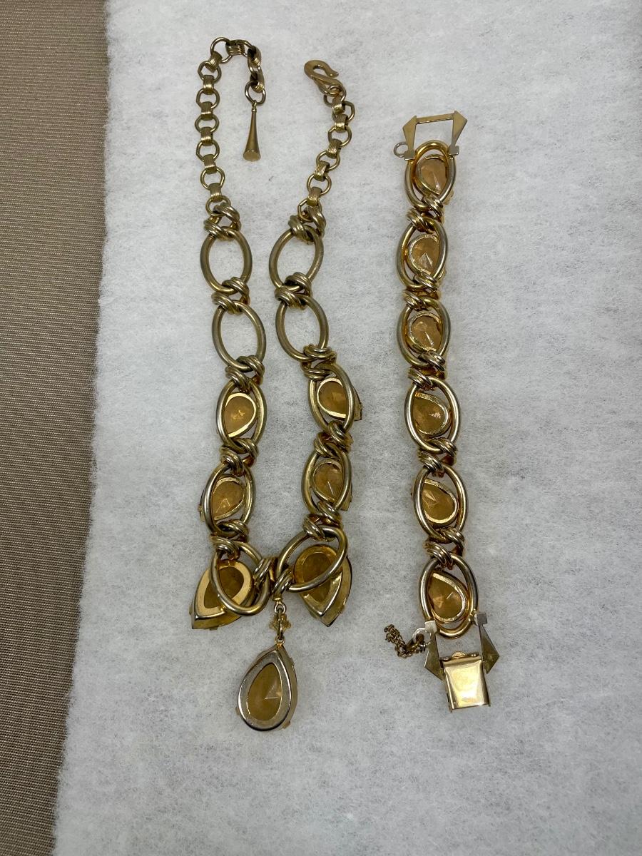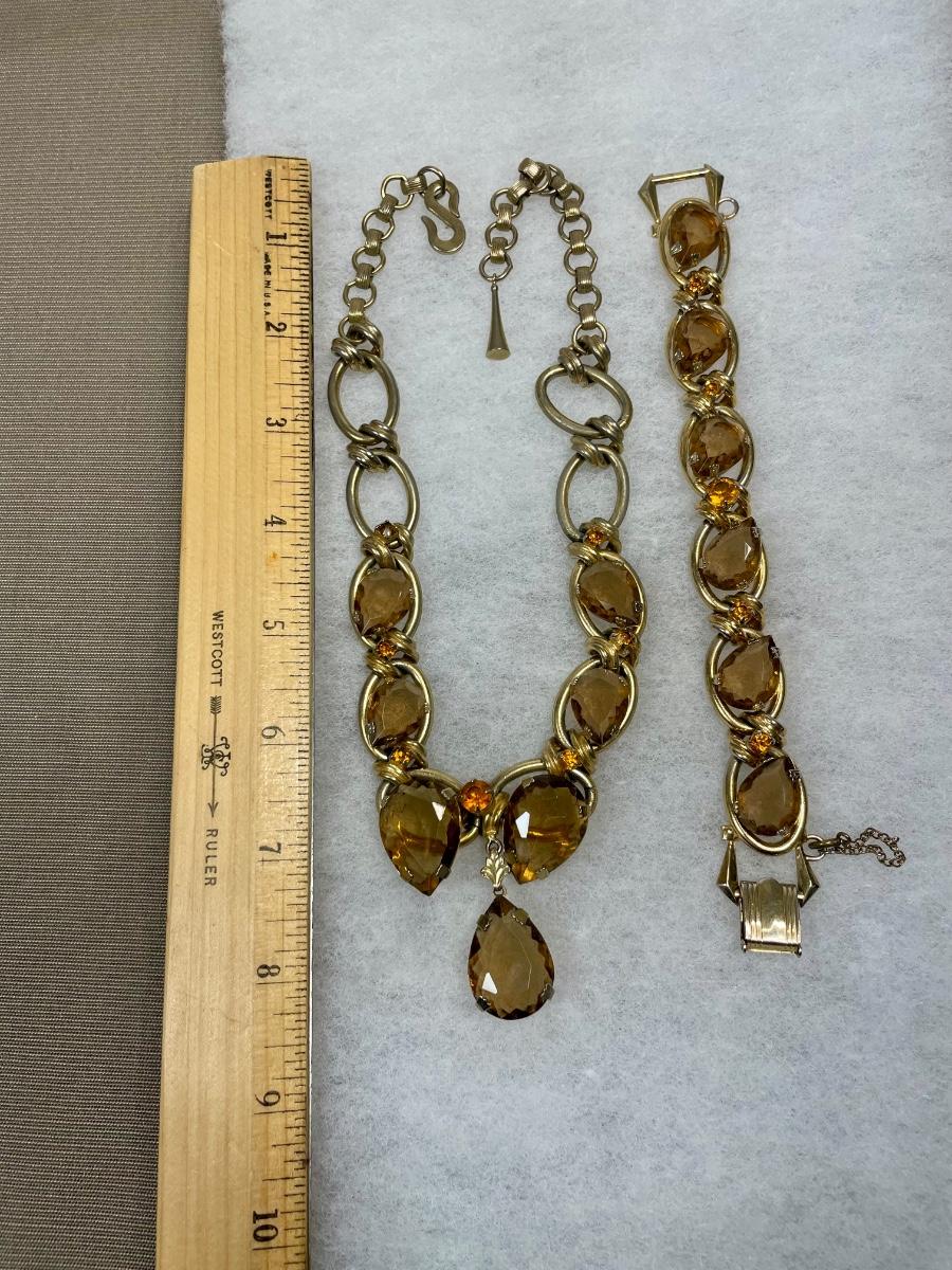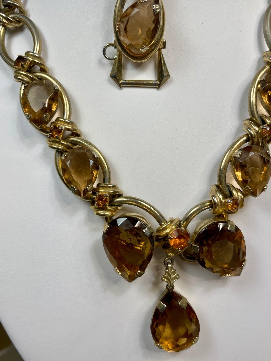 Topaz colored open back stones. Gold tone metal has some color wear but still a fun, bold set!