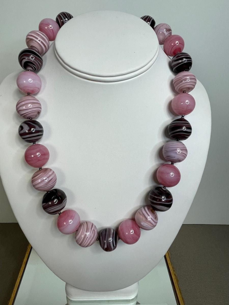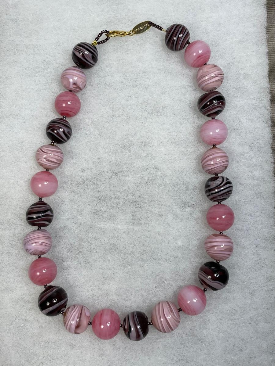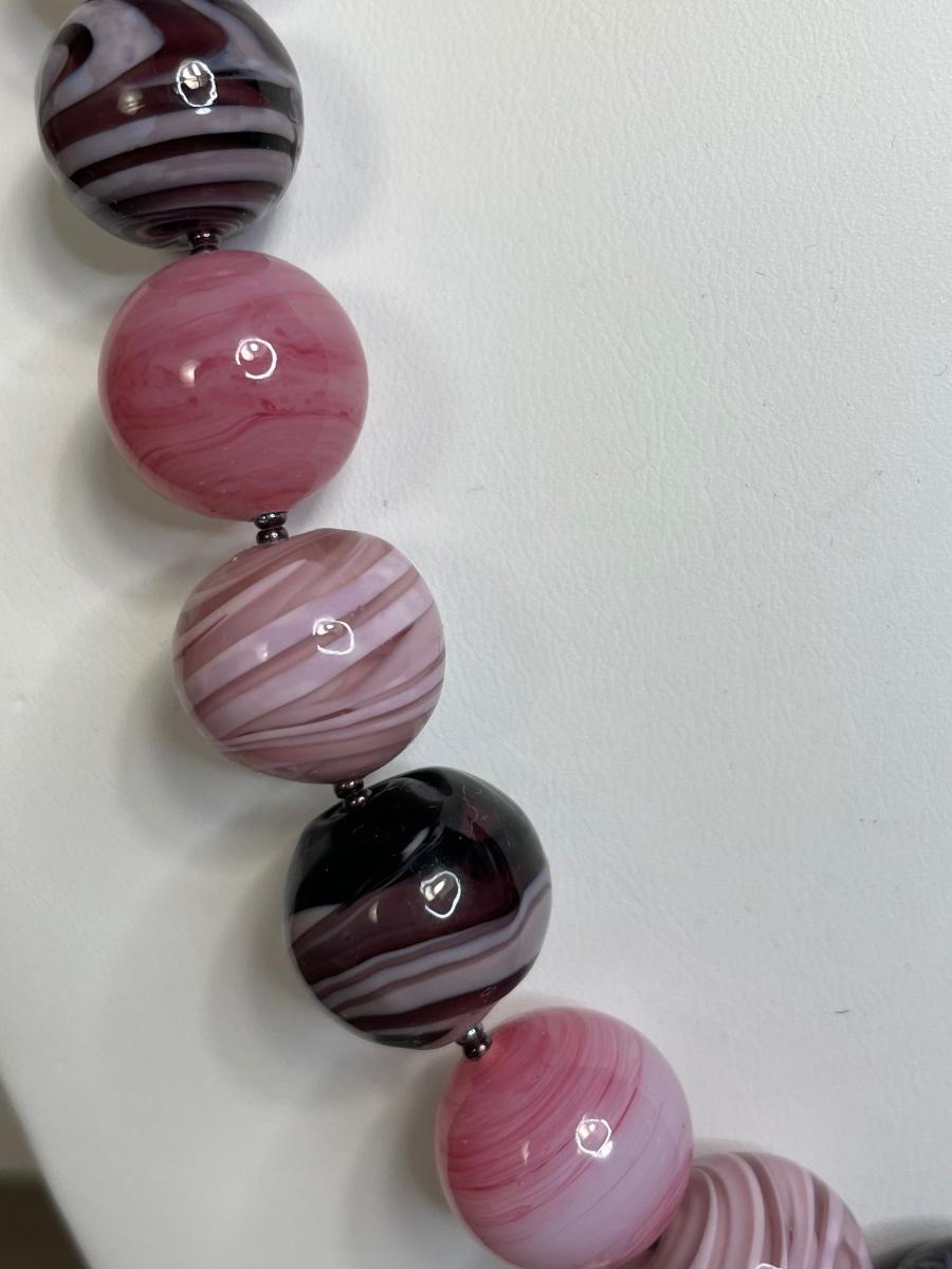 Large pink and purple swirled glass beads. Necklace is signed at the clasp.