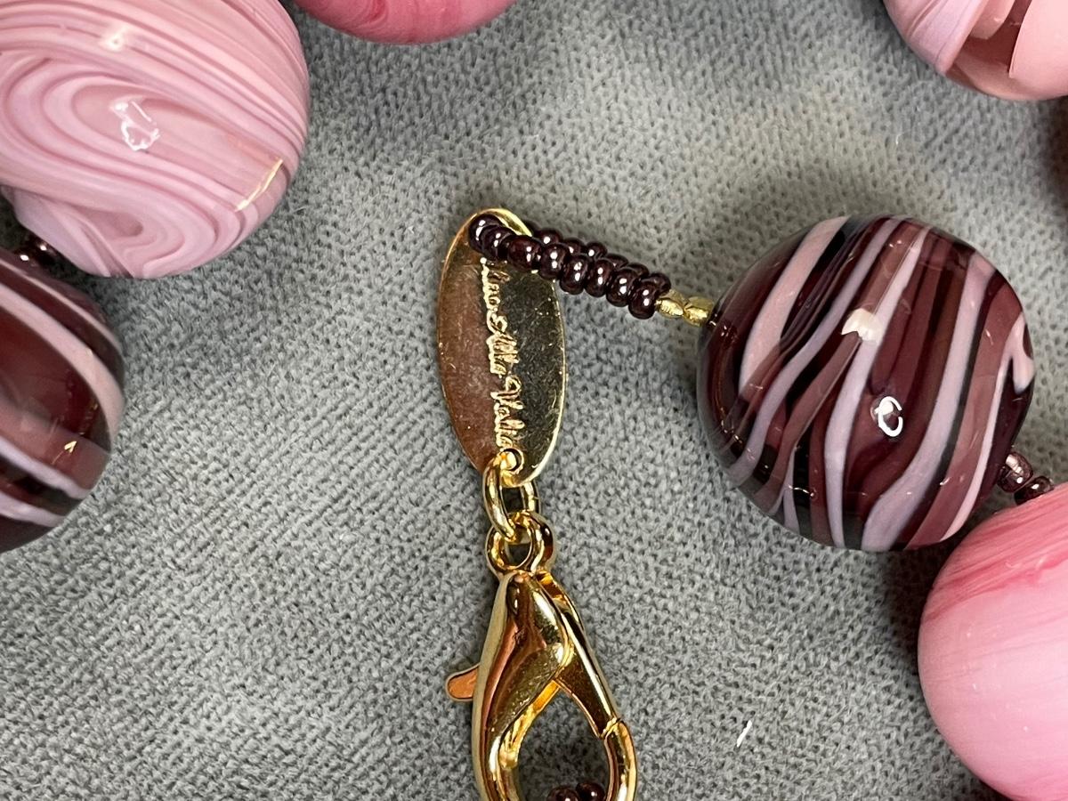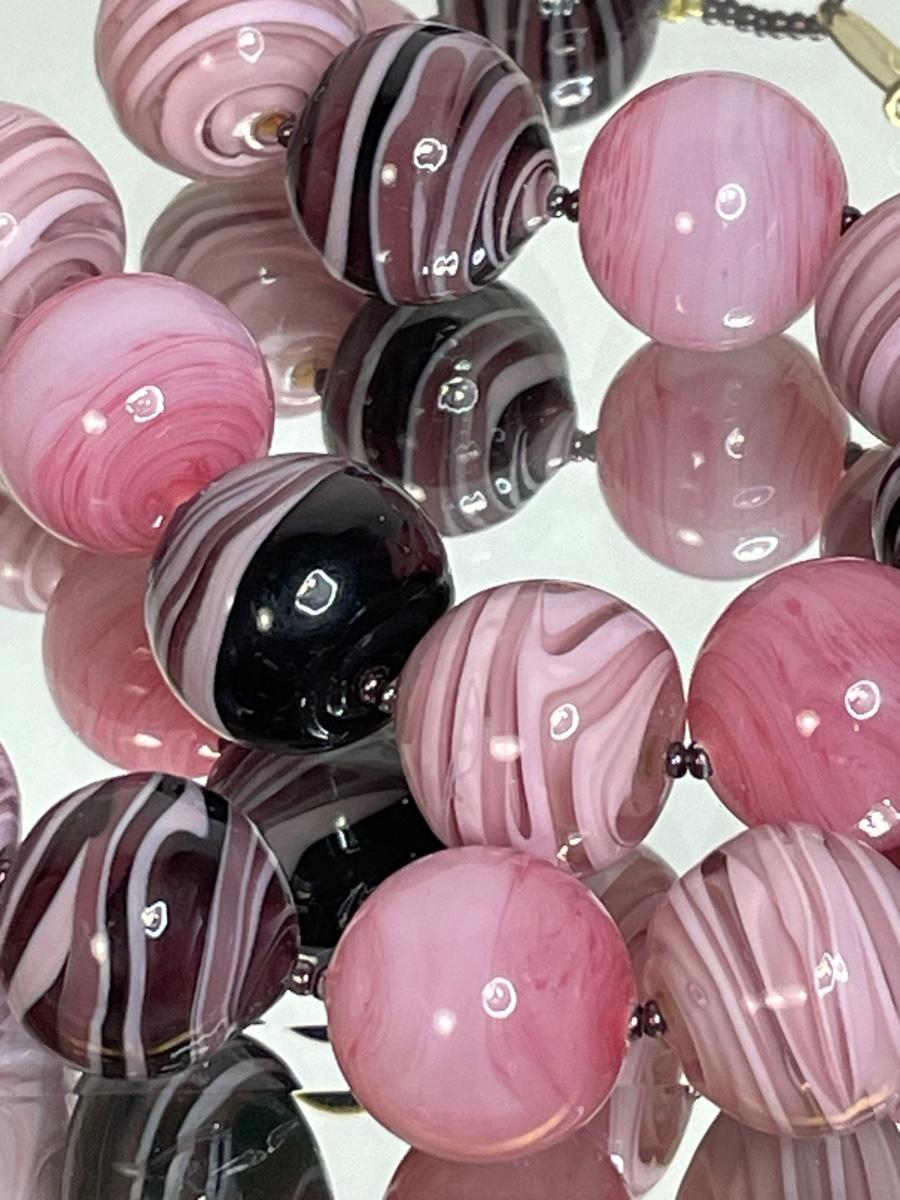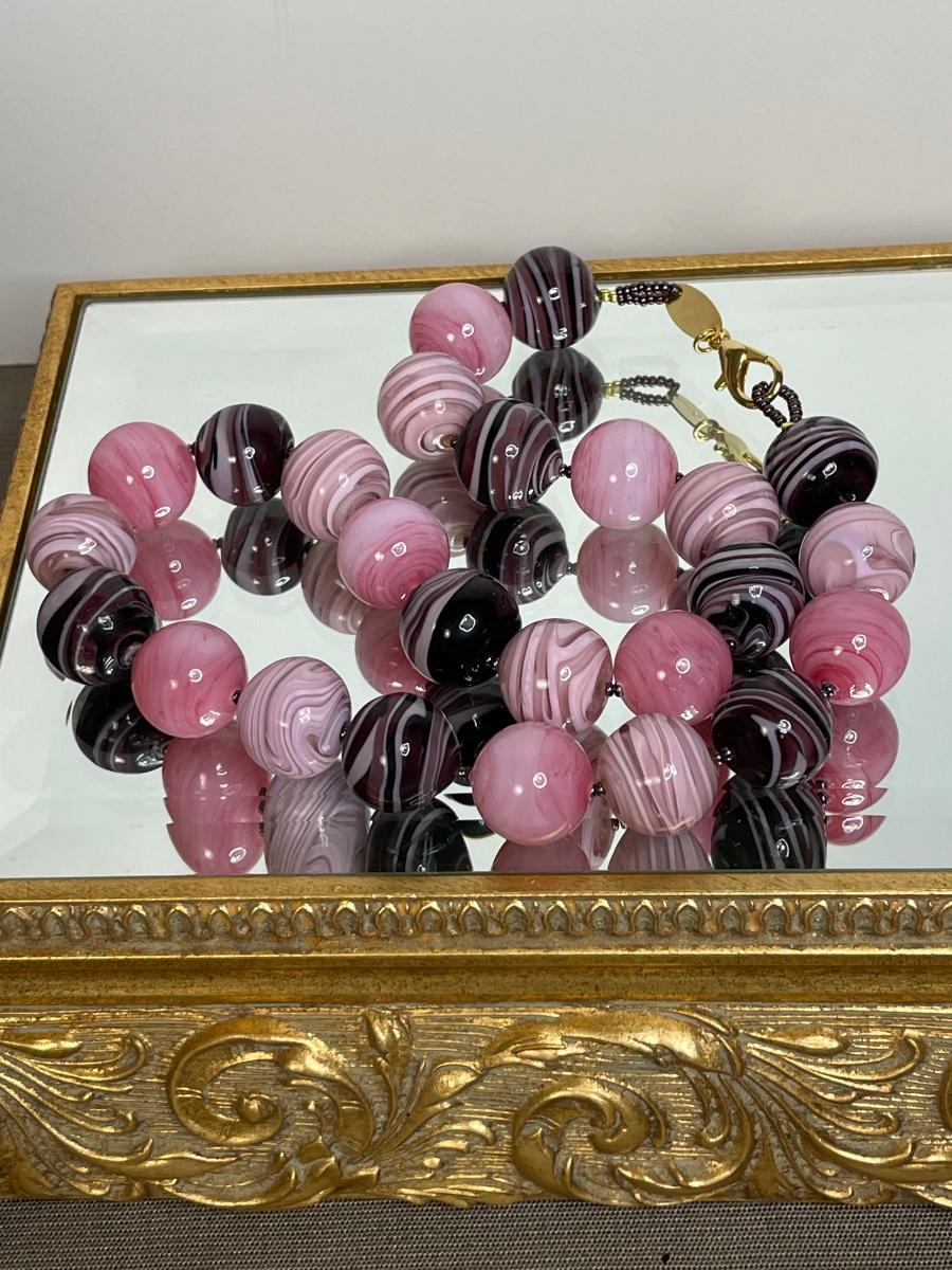 Large pink and purple swirled glass beads. Necklace is signed at the clasp.