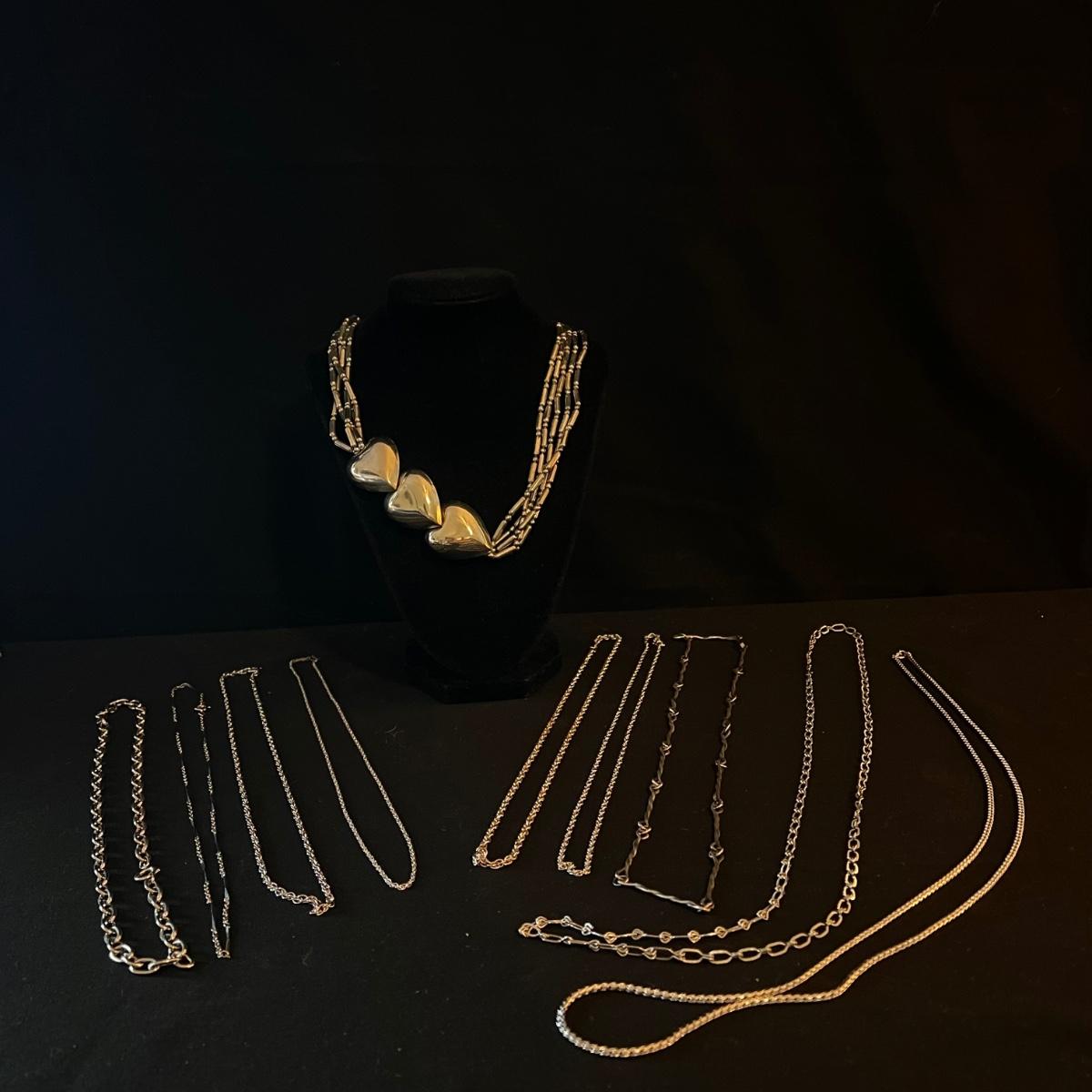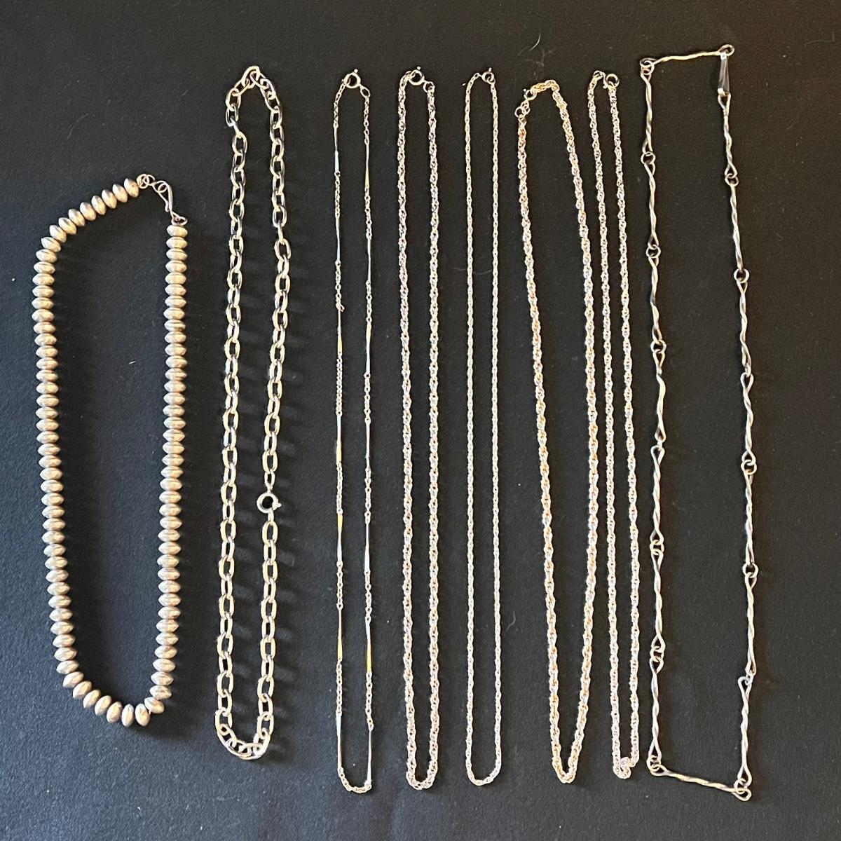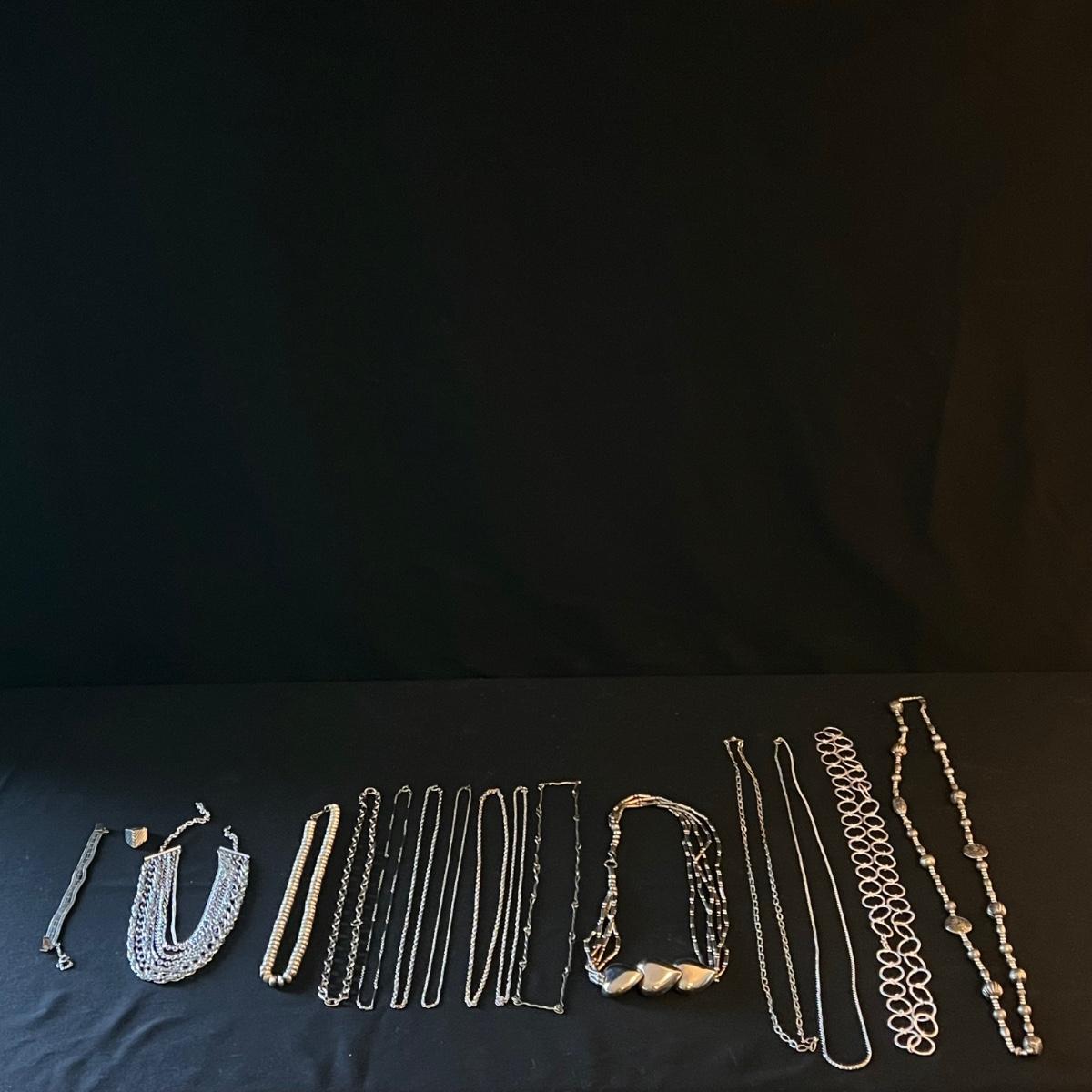 This lot includes ten plus silver necklaces of various sizes, one bracelet, and one ring. The largest necklace measures 41” long and the smallest necklace (the one with multiple chains) measures 15” long. The bracelet measures 6.75” long and clasps together nicely. Please see photos for details. All sales are final. No returns or refunds. Please bid accordingly. Shipping available.