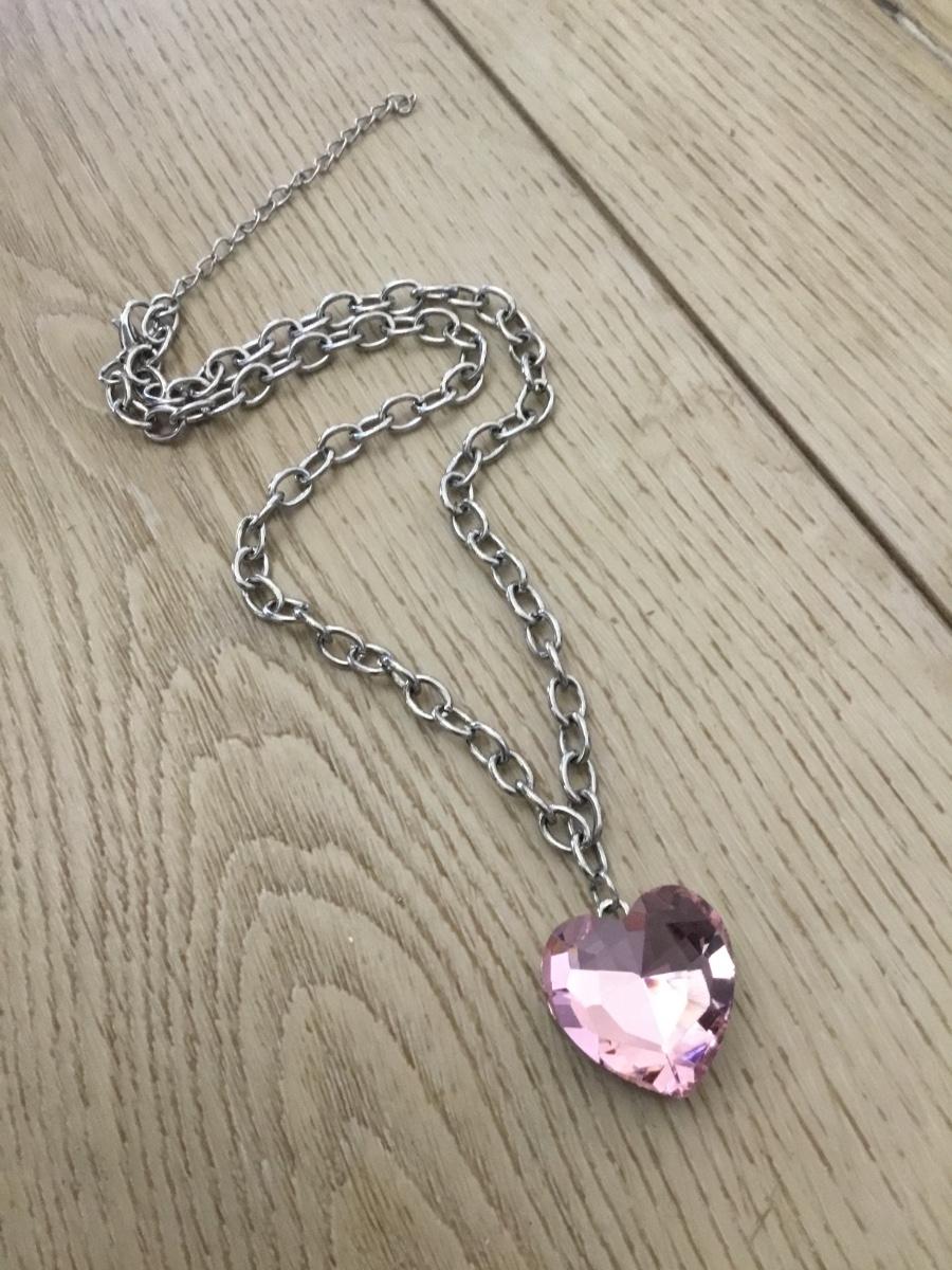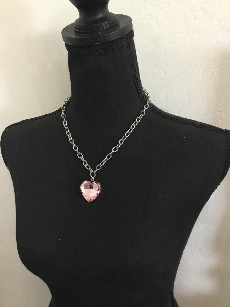 Chunky, silver, toned, pink heart, crystal pendant, necklace, silver tone chain