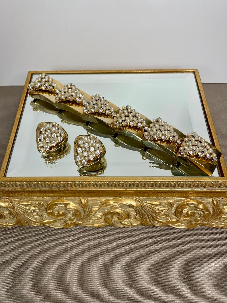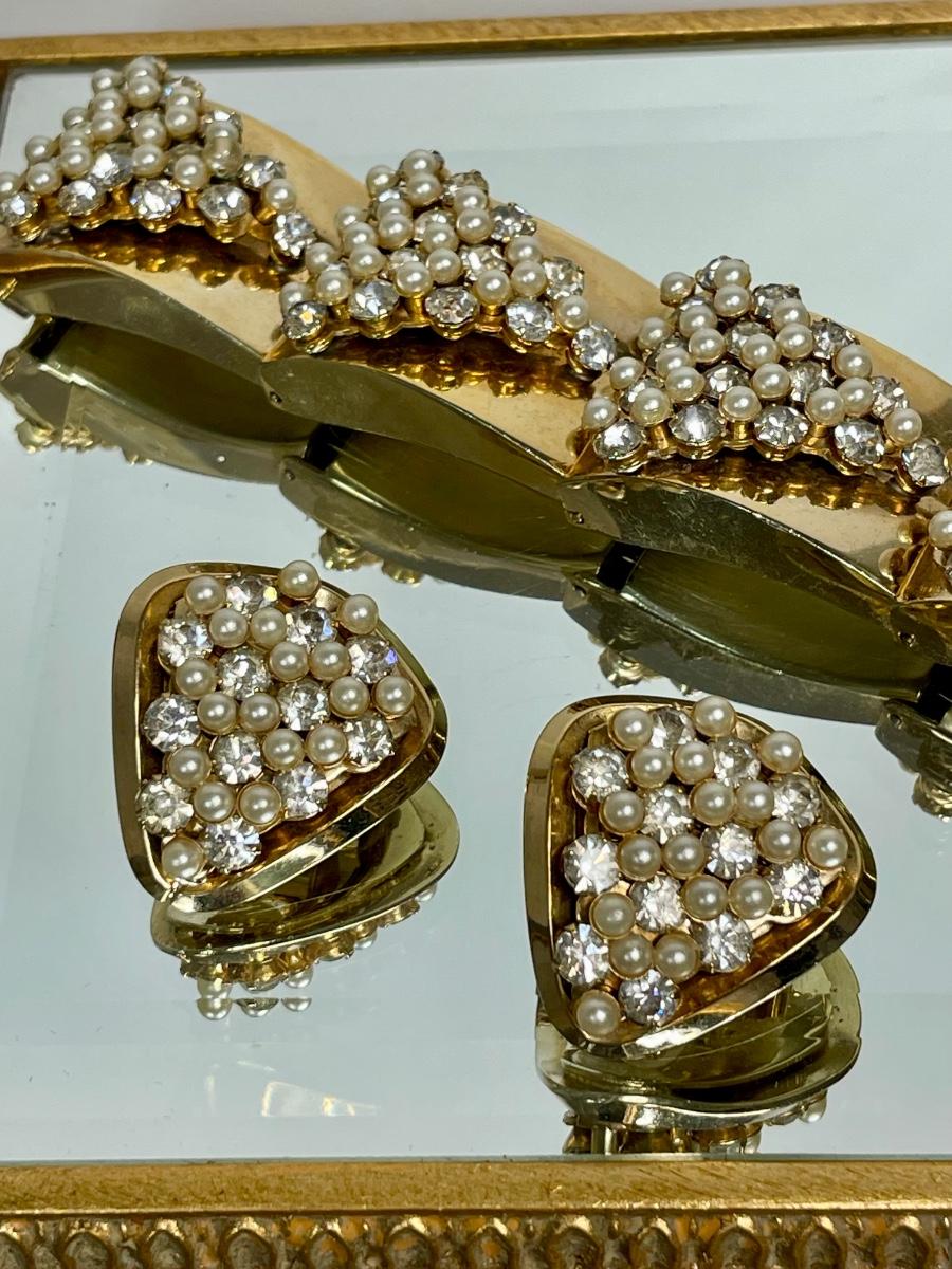 Gold tone with faux pearls and glass rhinestones. Bracelet measures 7 1/2” long. Very good condition