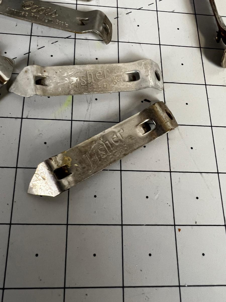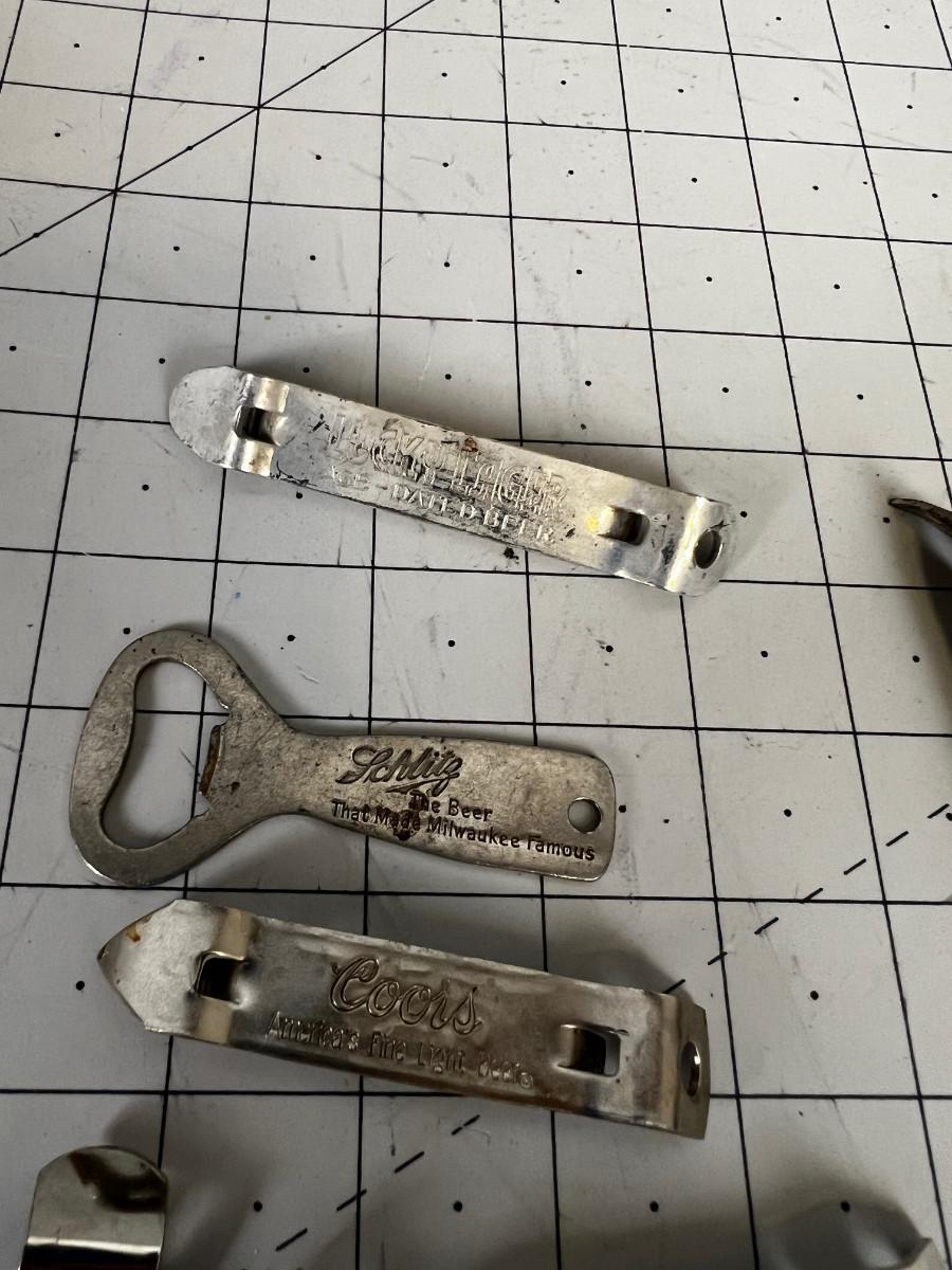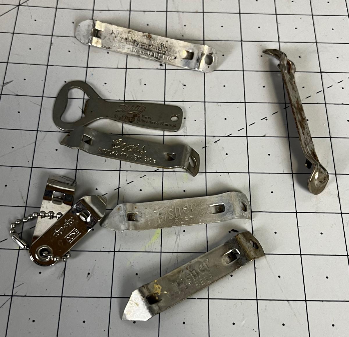 Church Key Can Opener Set: Schlitz, Hams, Coors, Lucky Logger and Fisher.