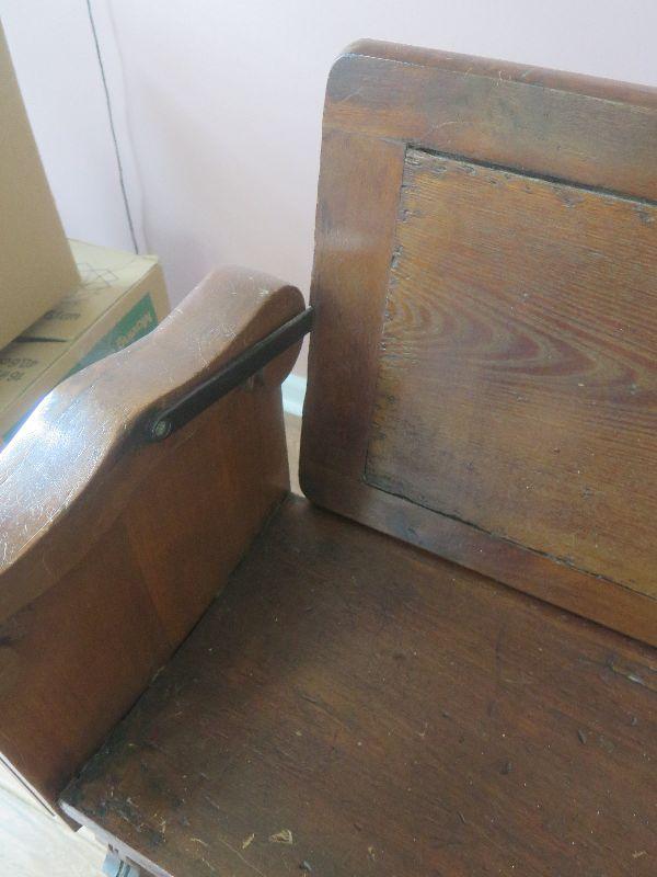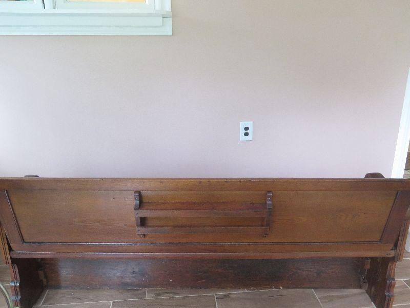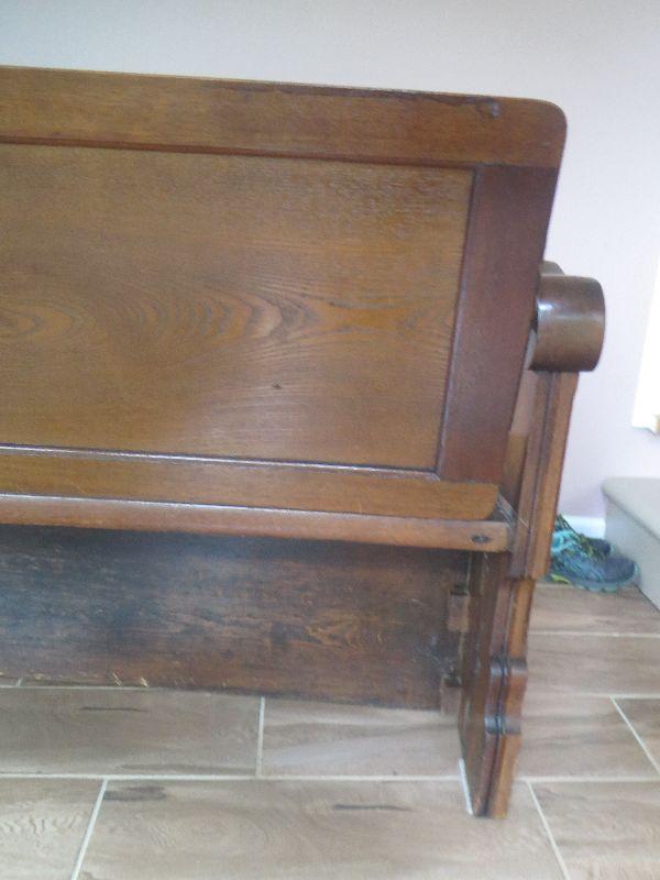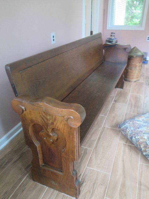 Solid wood church pew with carved sides. This has a flip over back so it easily accommodates direction for seating. Minor Dings and scratches, but an interesting, solid bench. 80x18x3315. Heavy, bring help to move.
