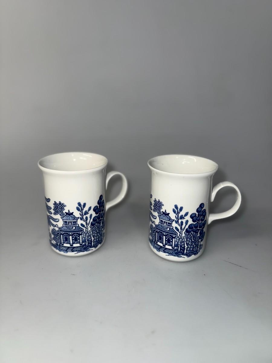 Churchill England Blue Willow Mugs  4 3/8”, Made in England, Blue and White Coffee Mug Tea, Chinoiserie, Vintage, Ear Handle, Tall Mug