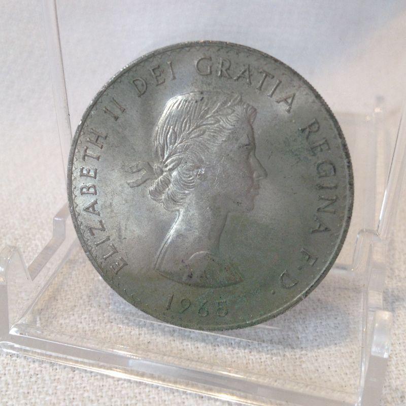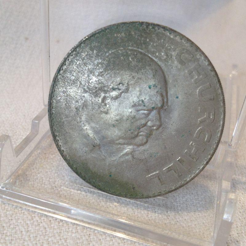 This is a 1965 Churchill Commemorative English Shilling Coin. It is rough and worn condition.