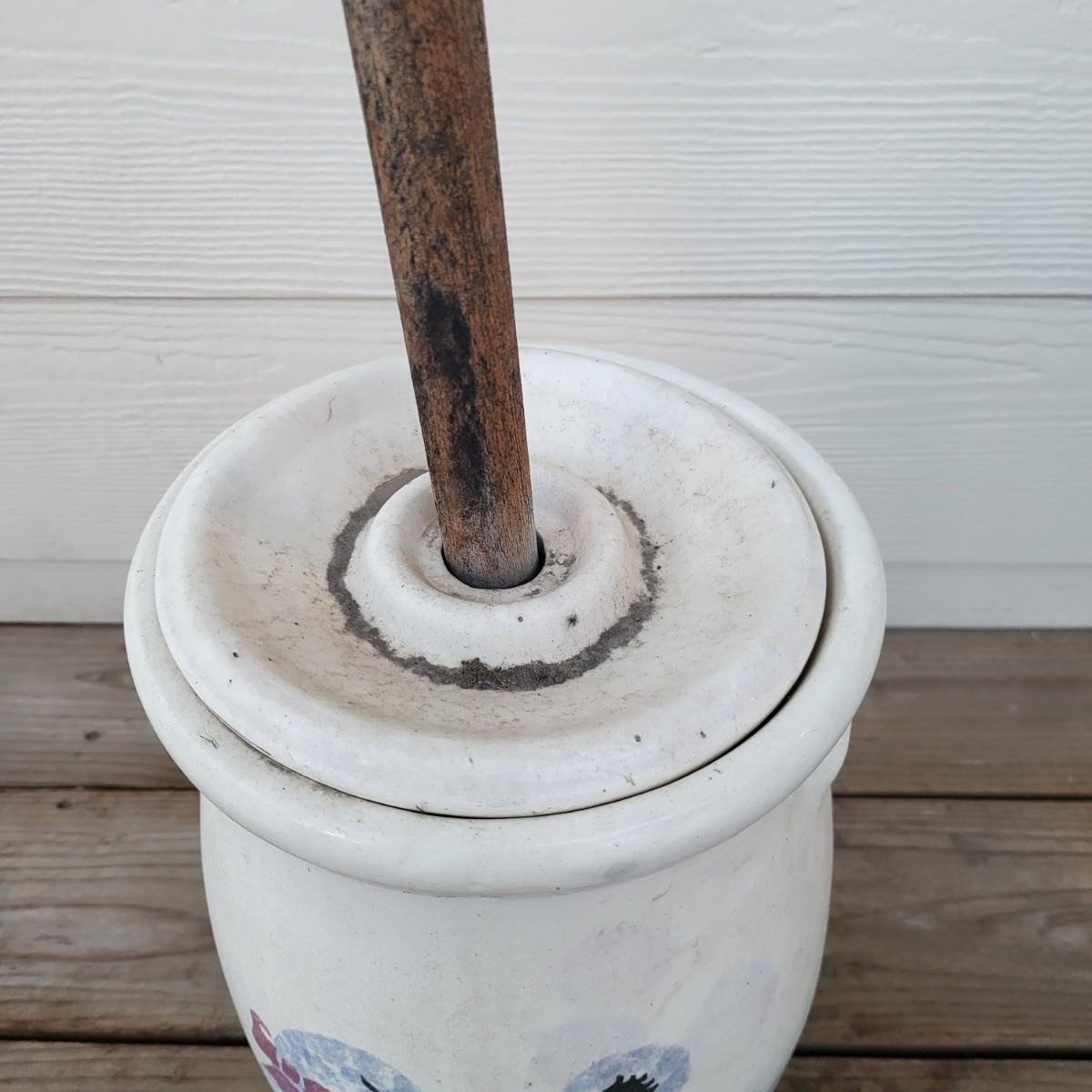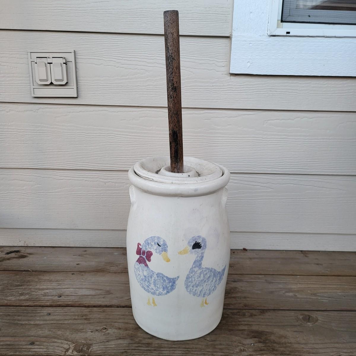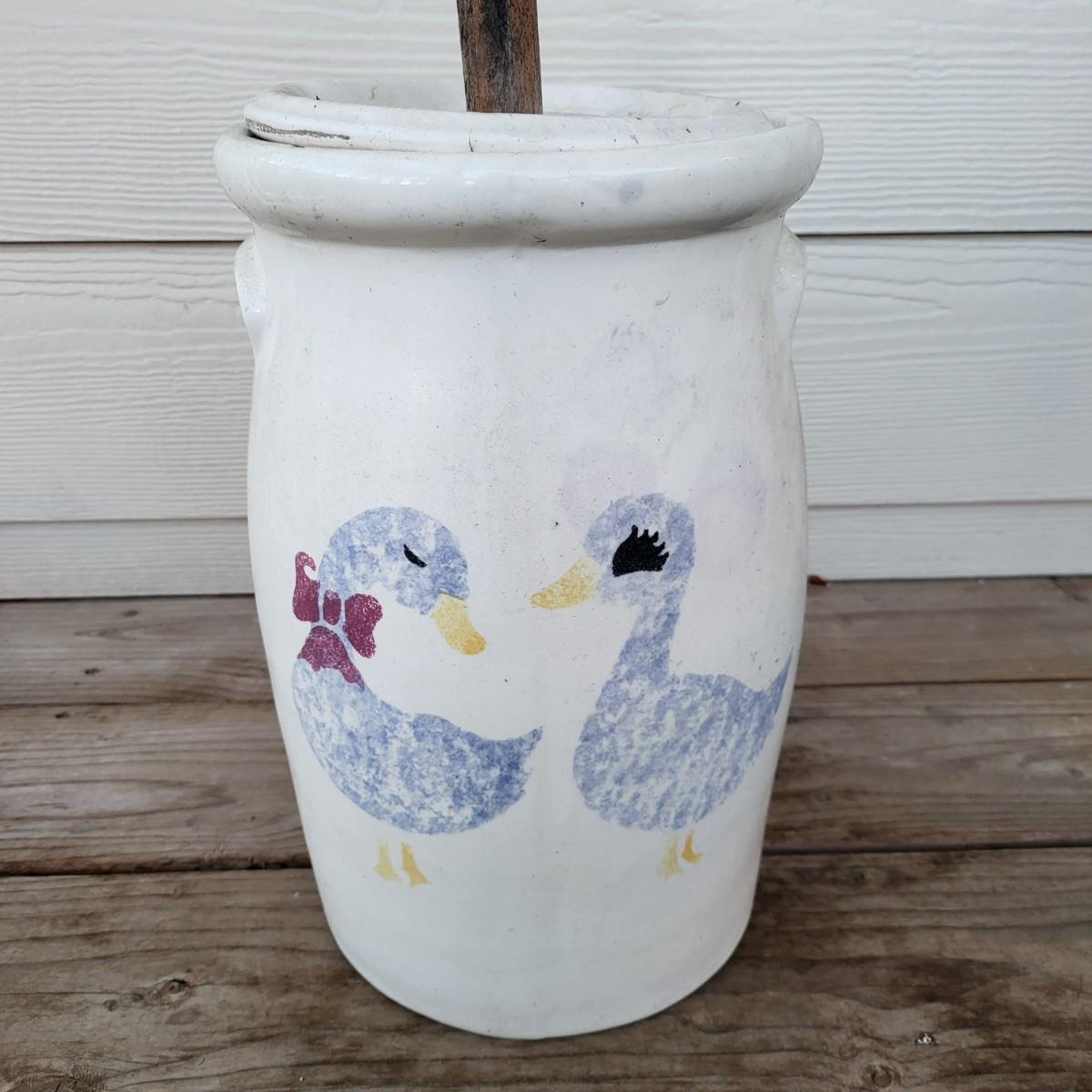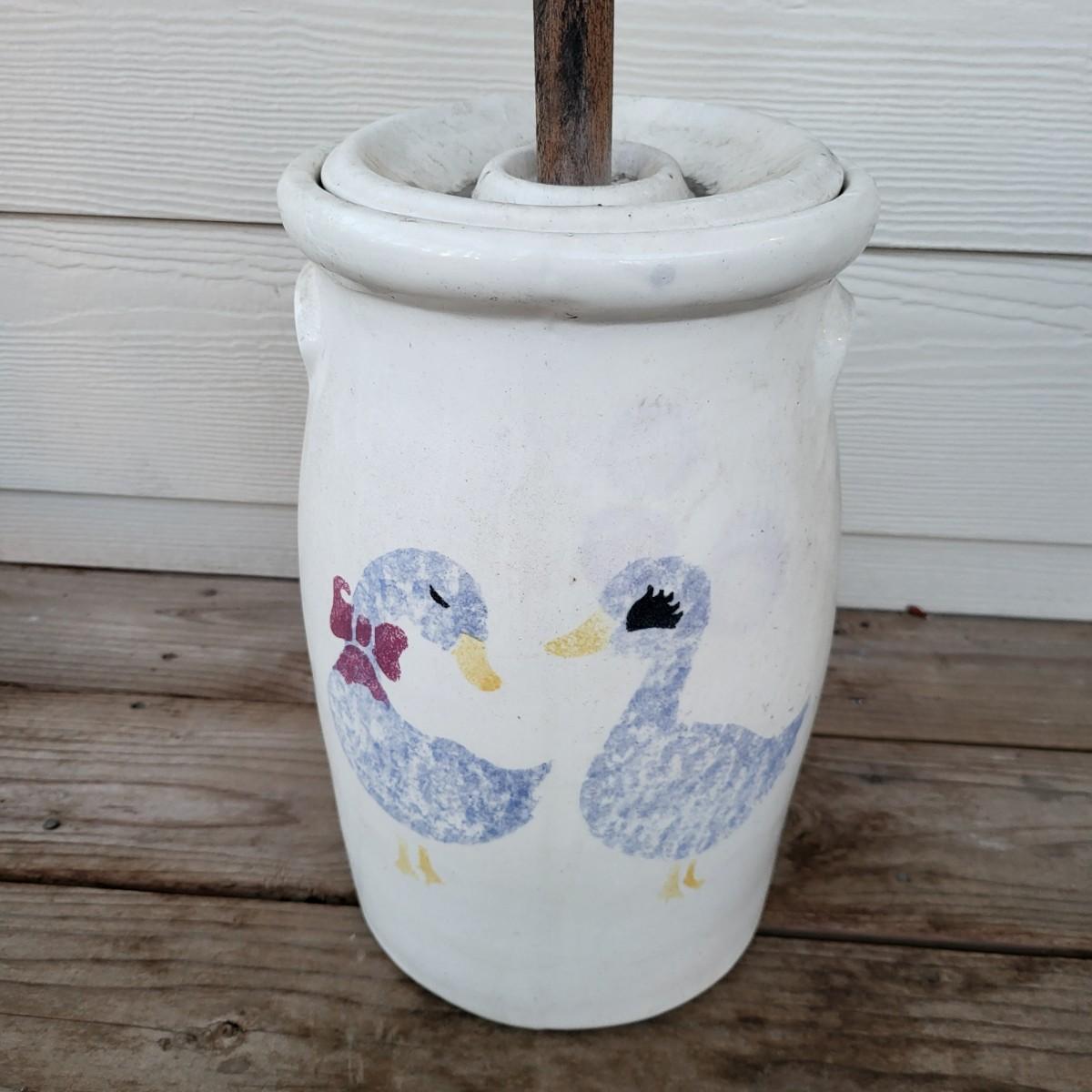 12" tall x 6" diameter vintage pottery butter churn. Hand painted ducks on front of churn. Has a ceramic lid and wood churn paddle.