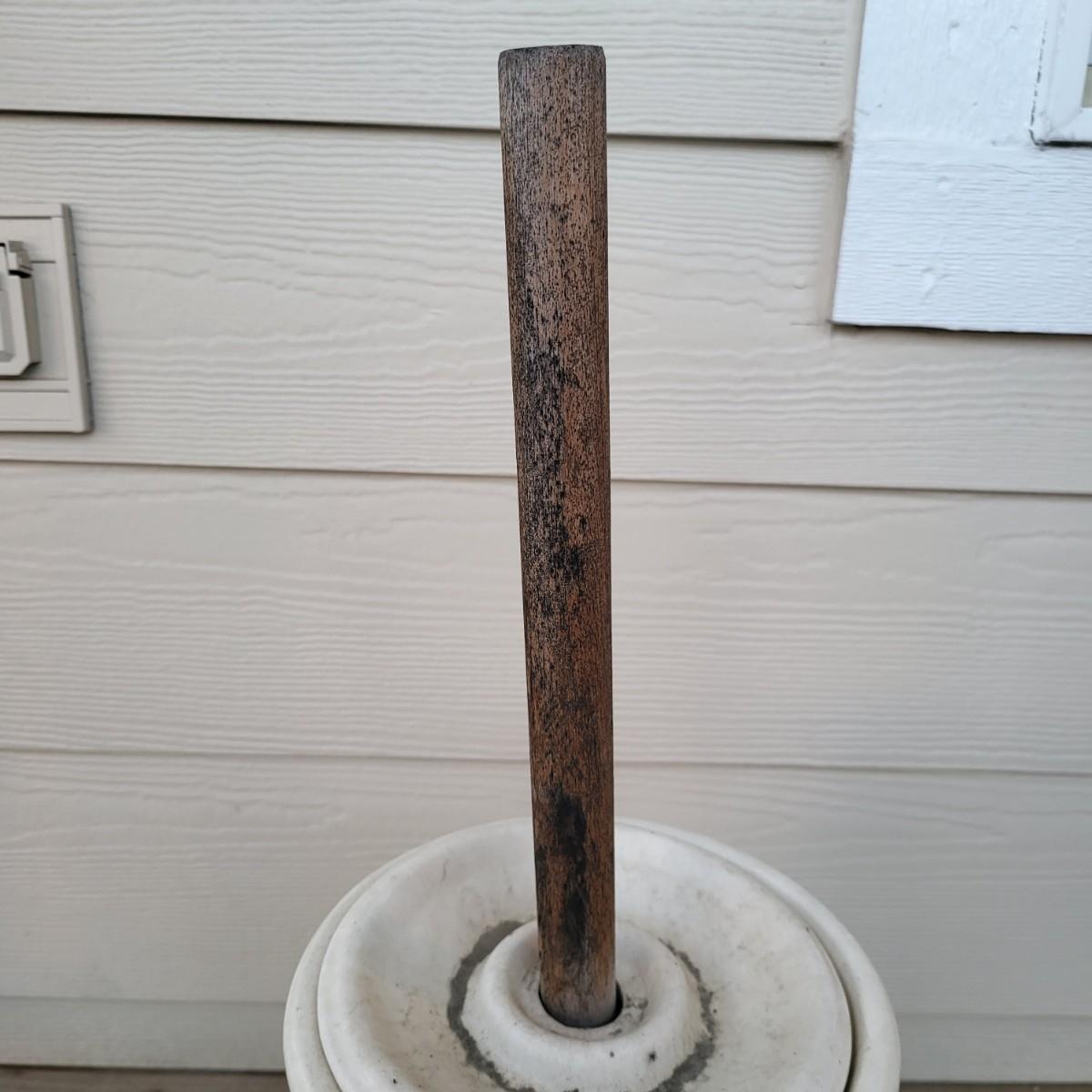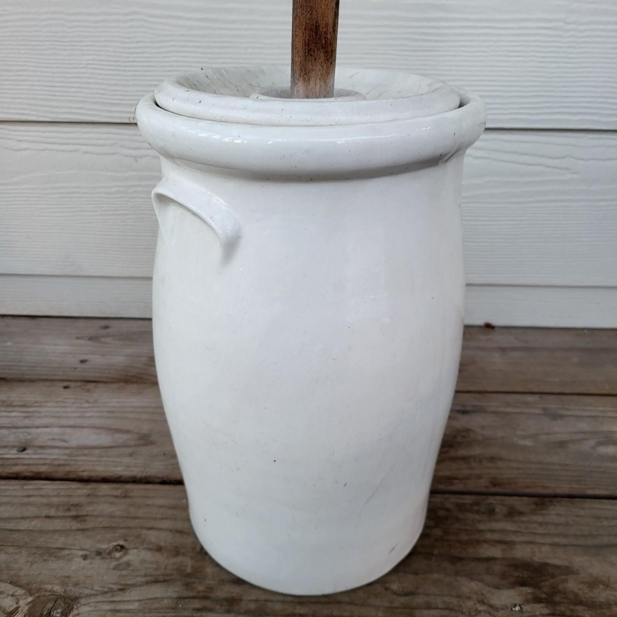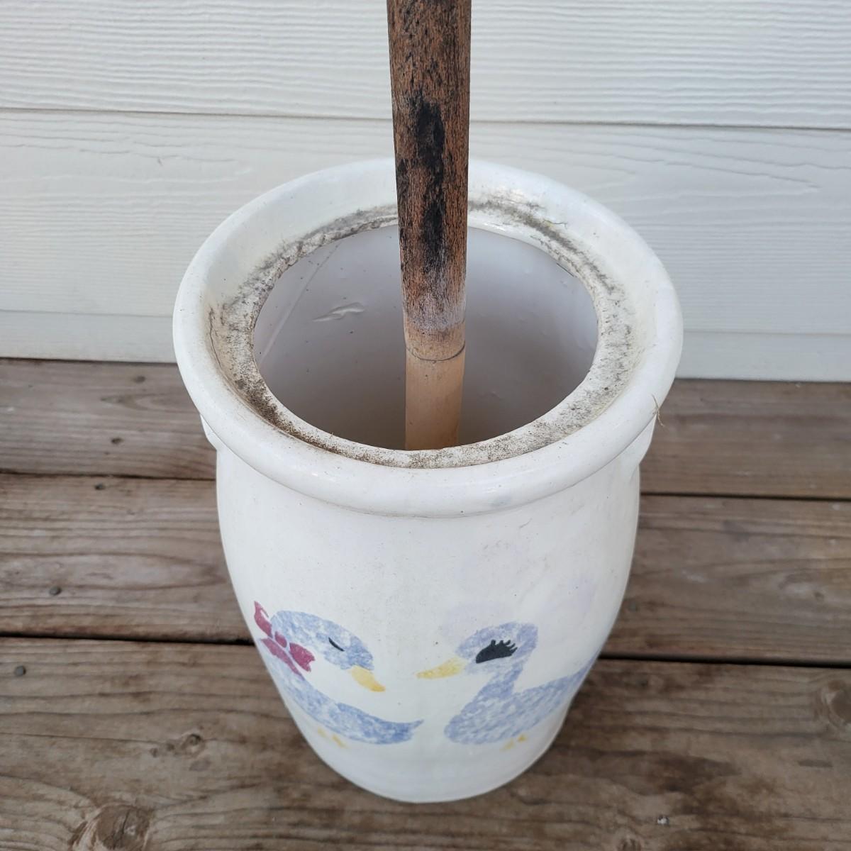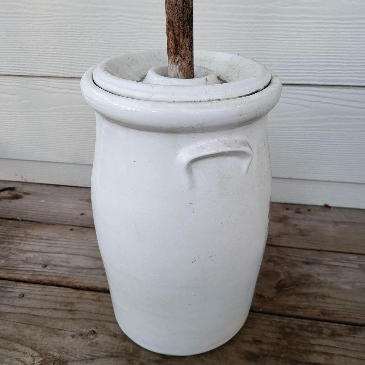 12" tall x 6" diameter vintage pottery butter churn. Hand painted ducks on front of churn. Has a ceramic lid and wood churn paddle.
