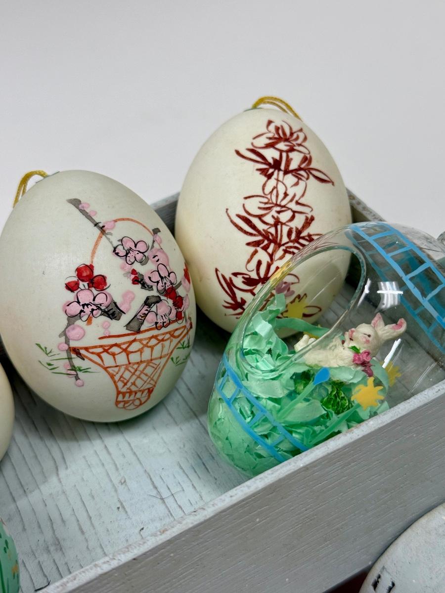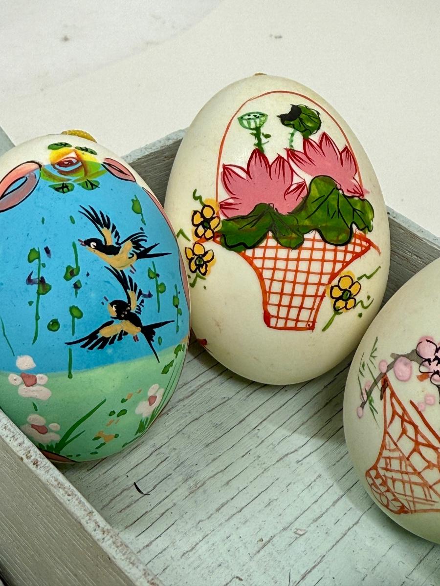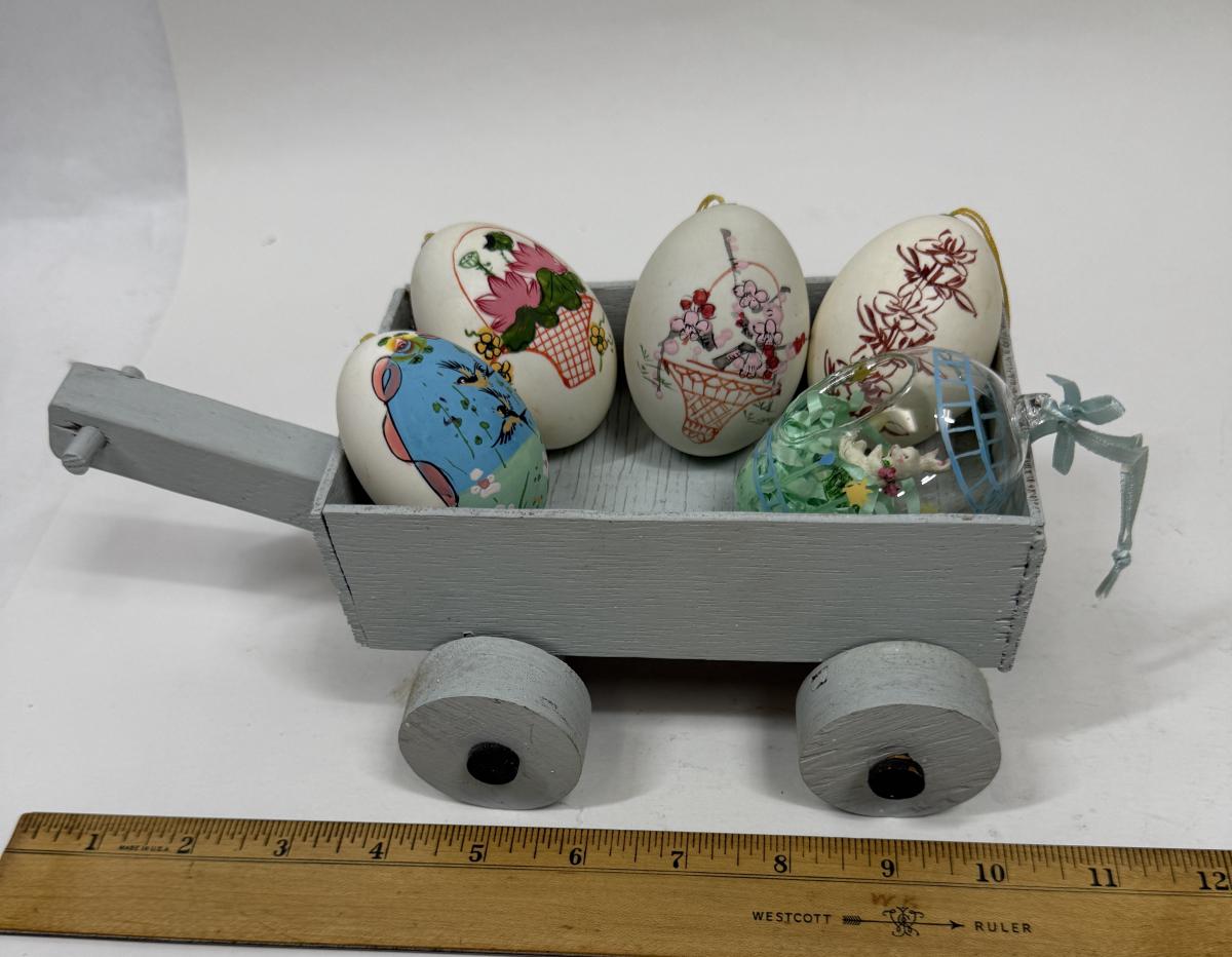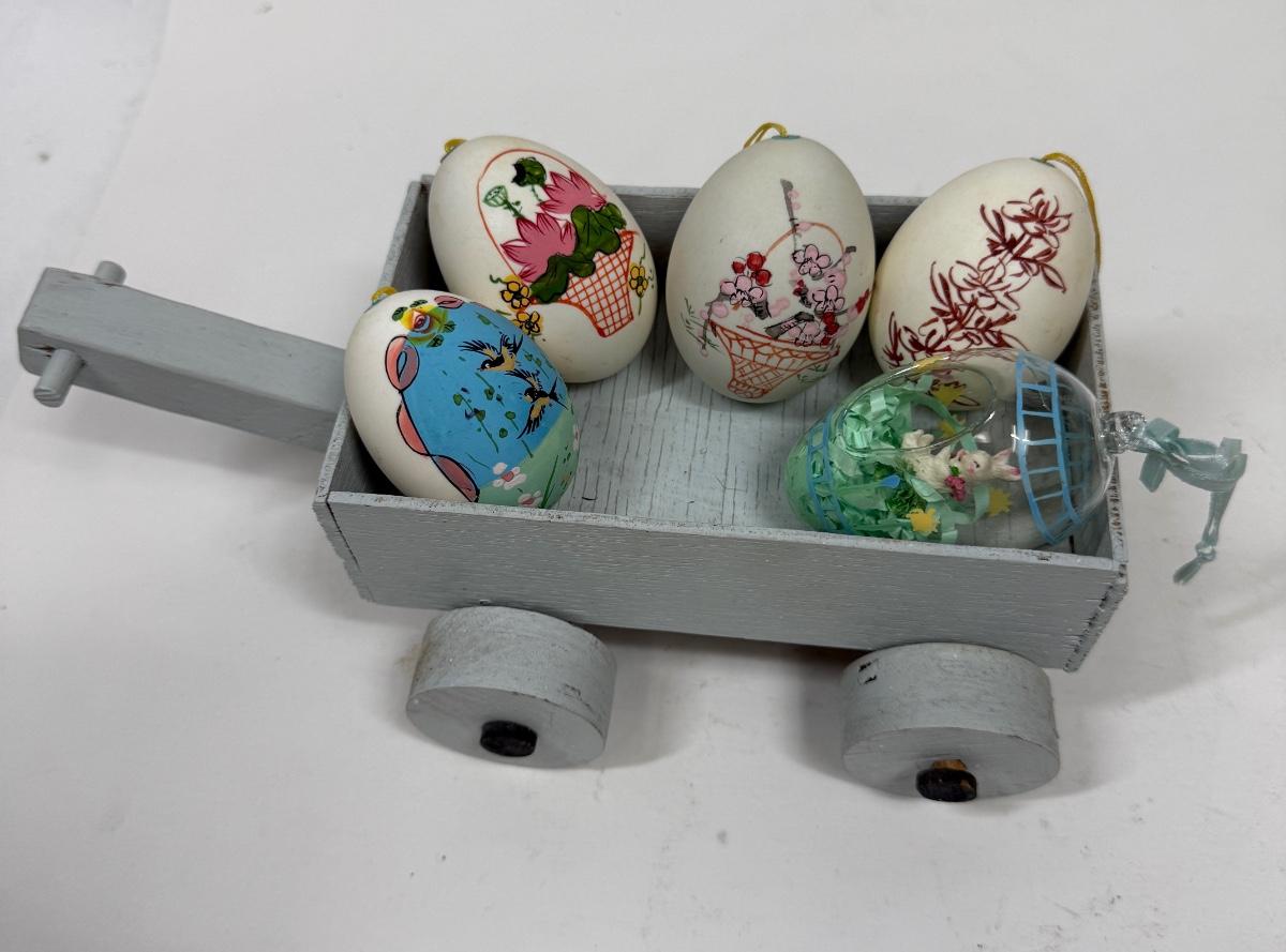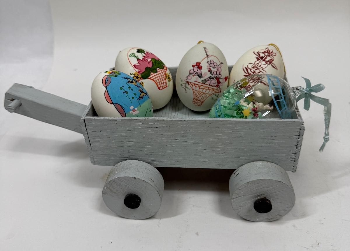 Hand Painted Real Shell Easter Eggs and 1 glass egg in wood wagon