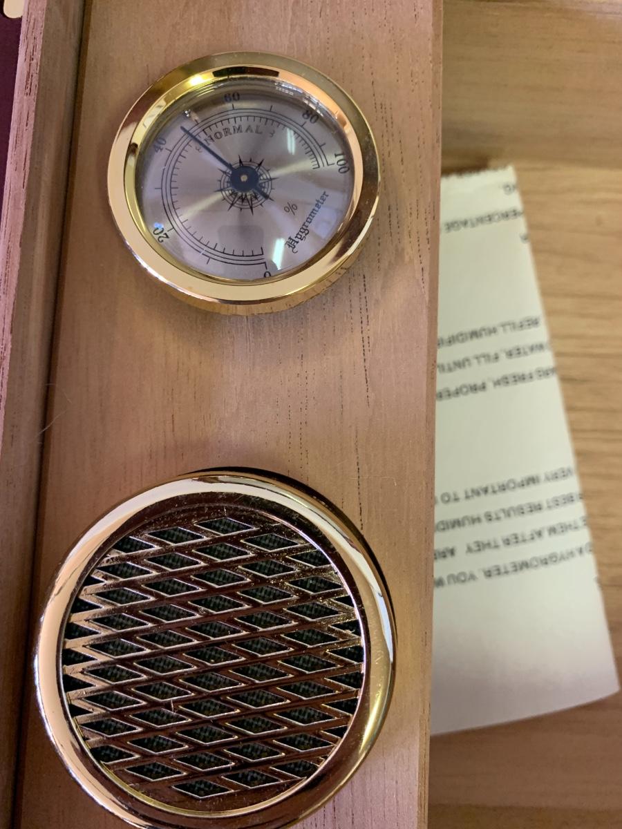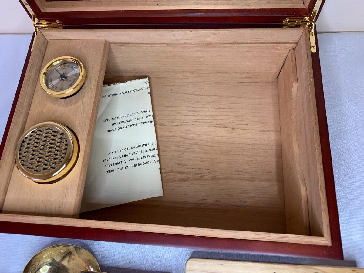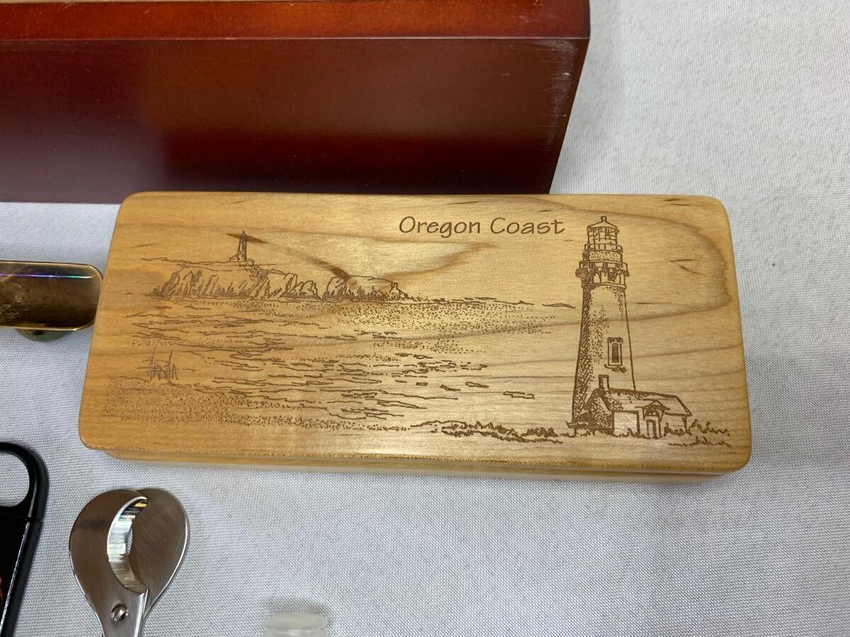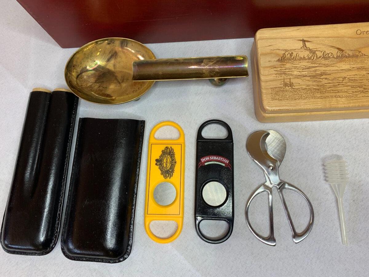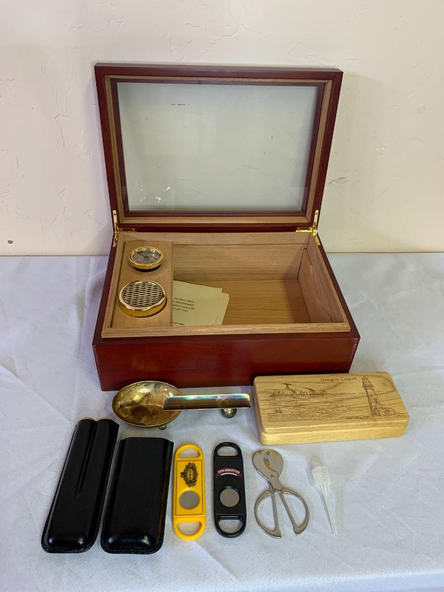 Rosewood humidor, made in China, Oregon Coast wood carved cigar holder, leather cigar holder, and various cutters,