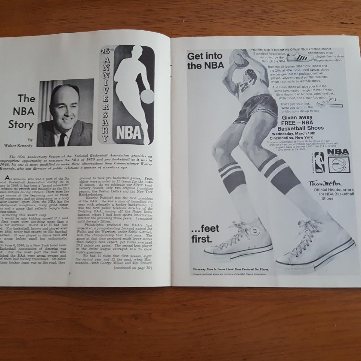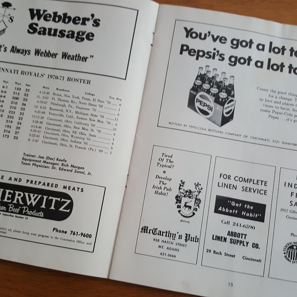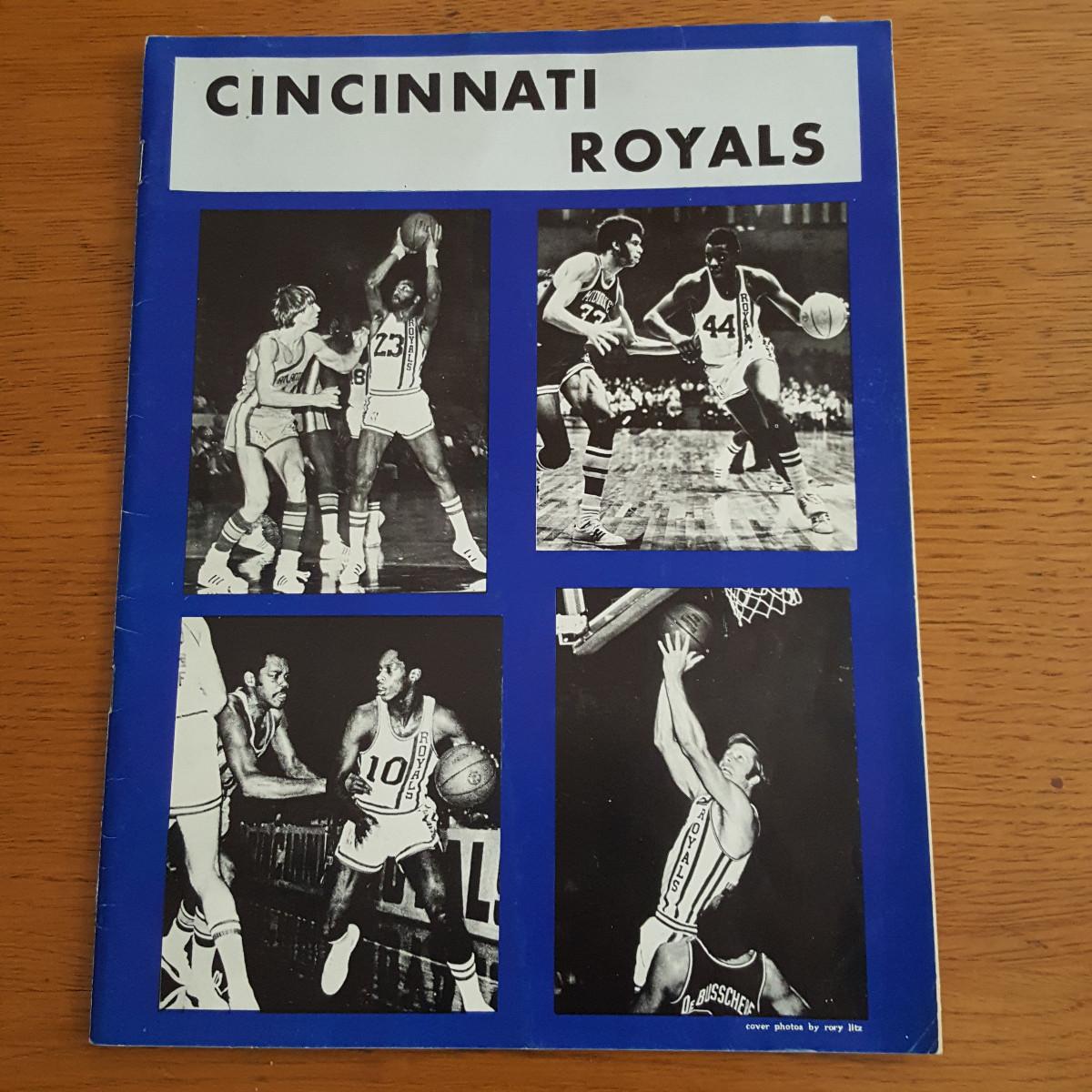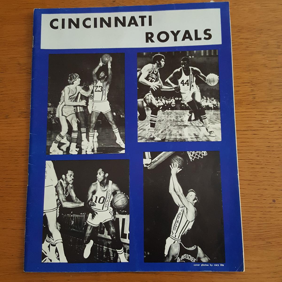 This auction lot is for a nifty copy of a Cincinnati Royals 1970-71 Basketball Program. This program was for the game between the Royals and the Detroit Pistons. A rare piece of Cincinnati basketball ephemera. The program is in good condition with some minor edge creasing, light spots and loose middle fold page Great automobile advertising and NBA stories inside..
