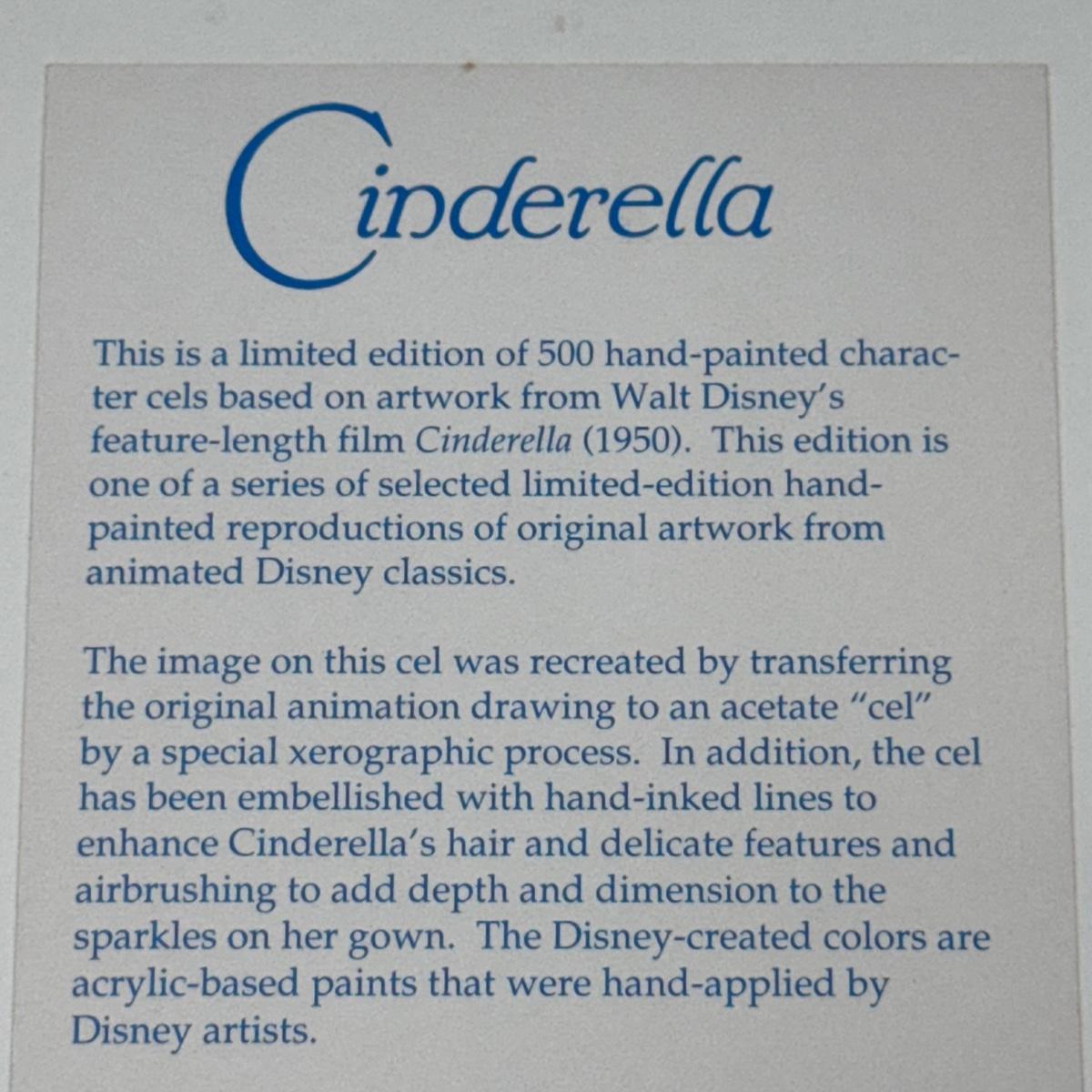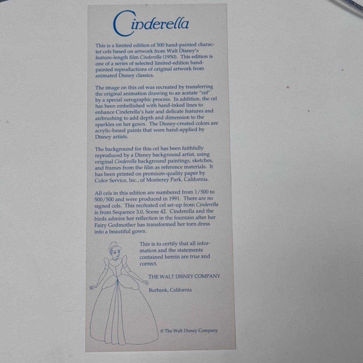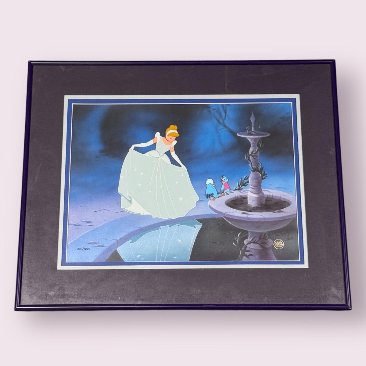This lot includes one Cinderella cel depicting her looking at her reflection. The cel is numbered 201/500 and stamped with “The Walt Disney Company.” The art is protected with a plastic sheet, three mattings, and a metal frame. The frame measures 21.5” x 17.5”H. There is a story attached to the the back of this art explaining the story behind the piece.