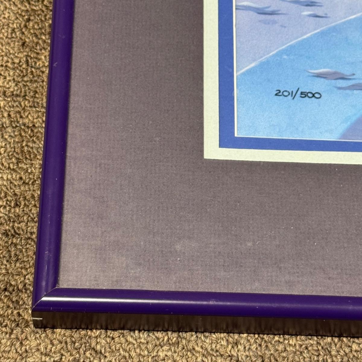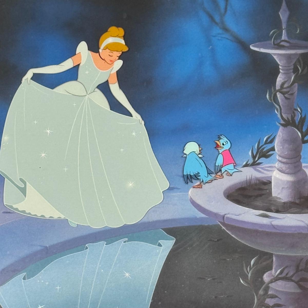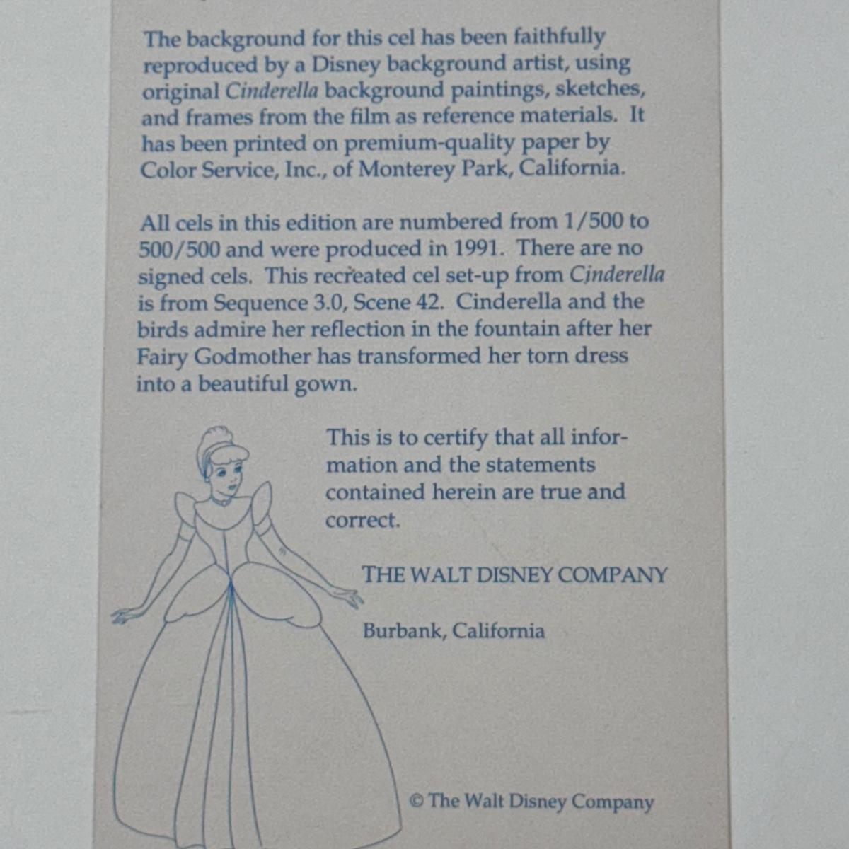 This lot includes one Cinderella cel depicting her looking at her reflection. The cel is numbered 201/500 and stamped with “The Walt Disney Company.” The art is protected with a plastic sheet, three mattings, and a metal frame. The frame measures 21.5” x 17.5”H. There is a story attached to the the back of this art explaining the story behind the piece.