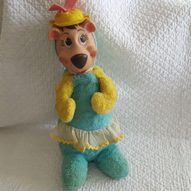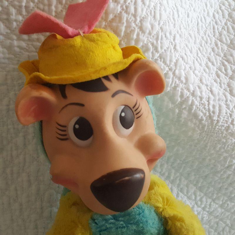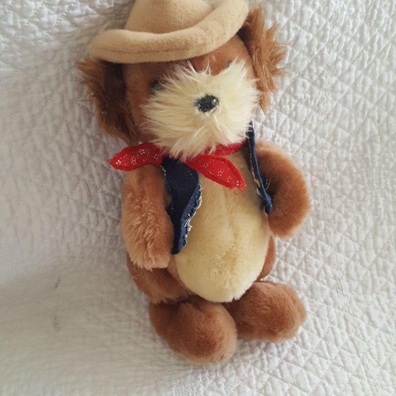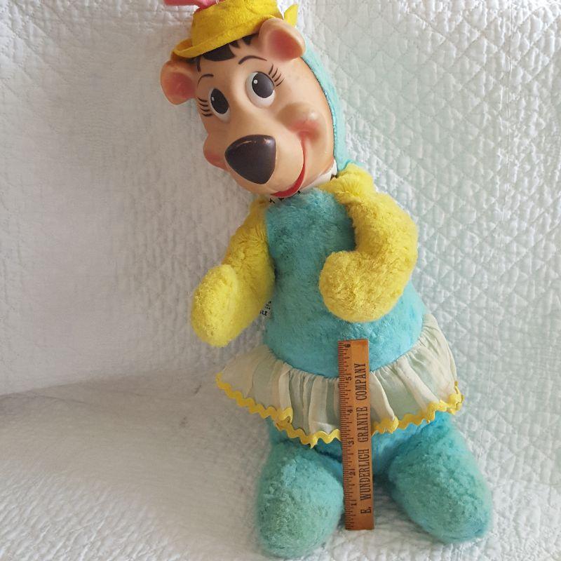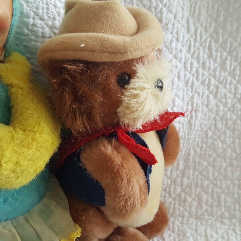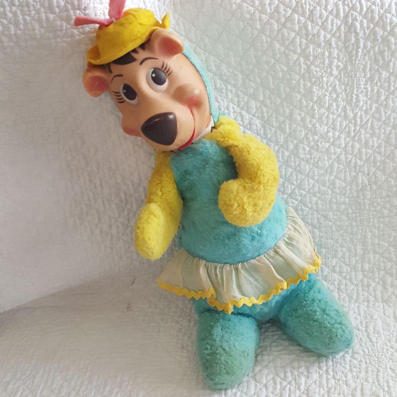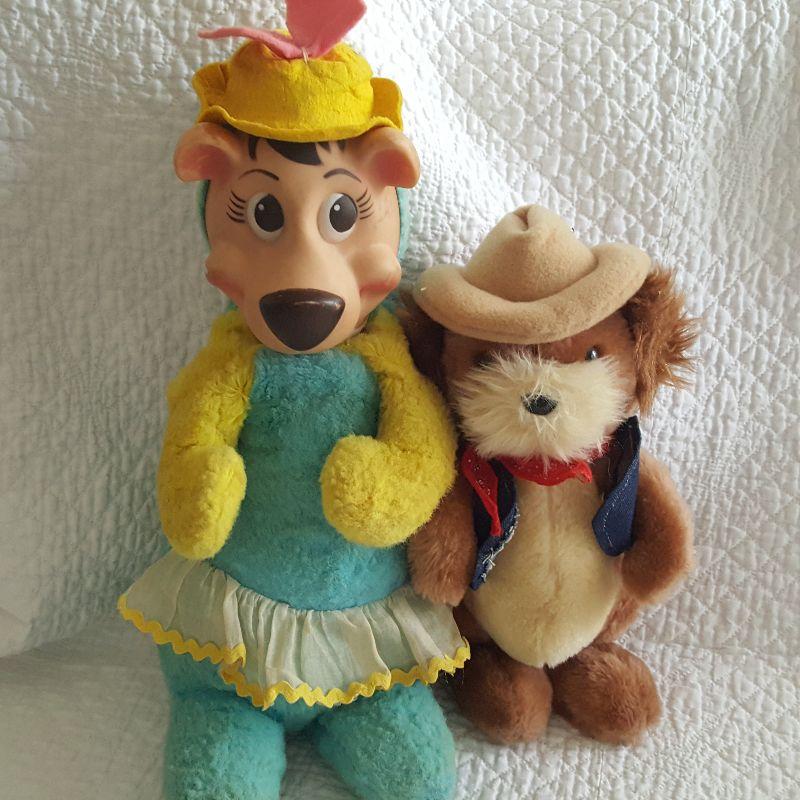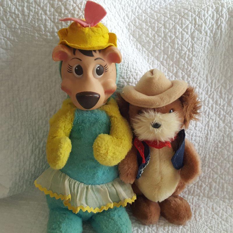 This auction lot is for a "Cindy Bear" Stuffed Toy & Cowboy Dog Friend. Cindy Bear is known as Yogi Bear's Girlfriend. In pretty good shape for a stuffed toy made in 1959 but it has been played with. Has the Knickerbocker label. Also included in the lot is a stuffed Cowboy Dog with a 1981 Dakin Company label also in pretty good condition