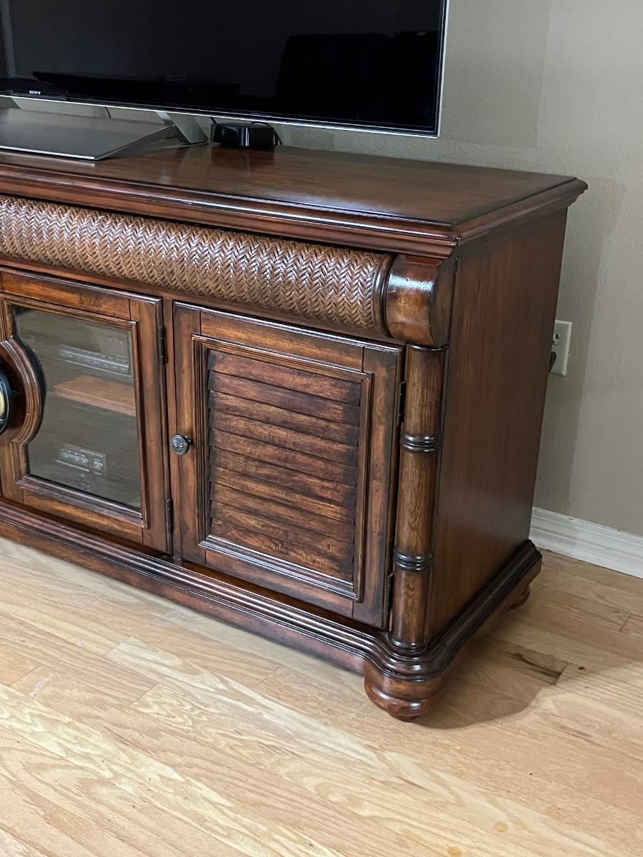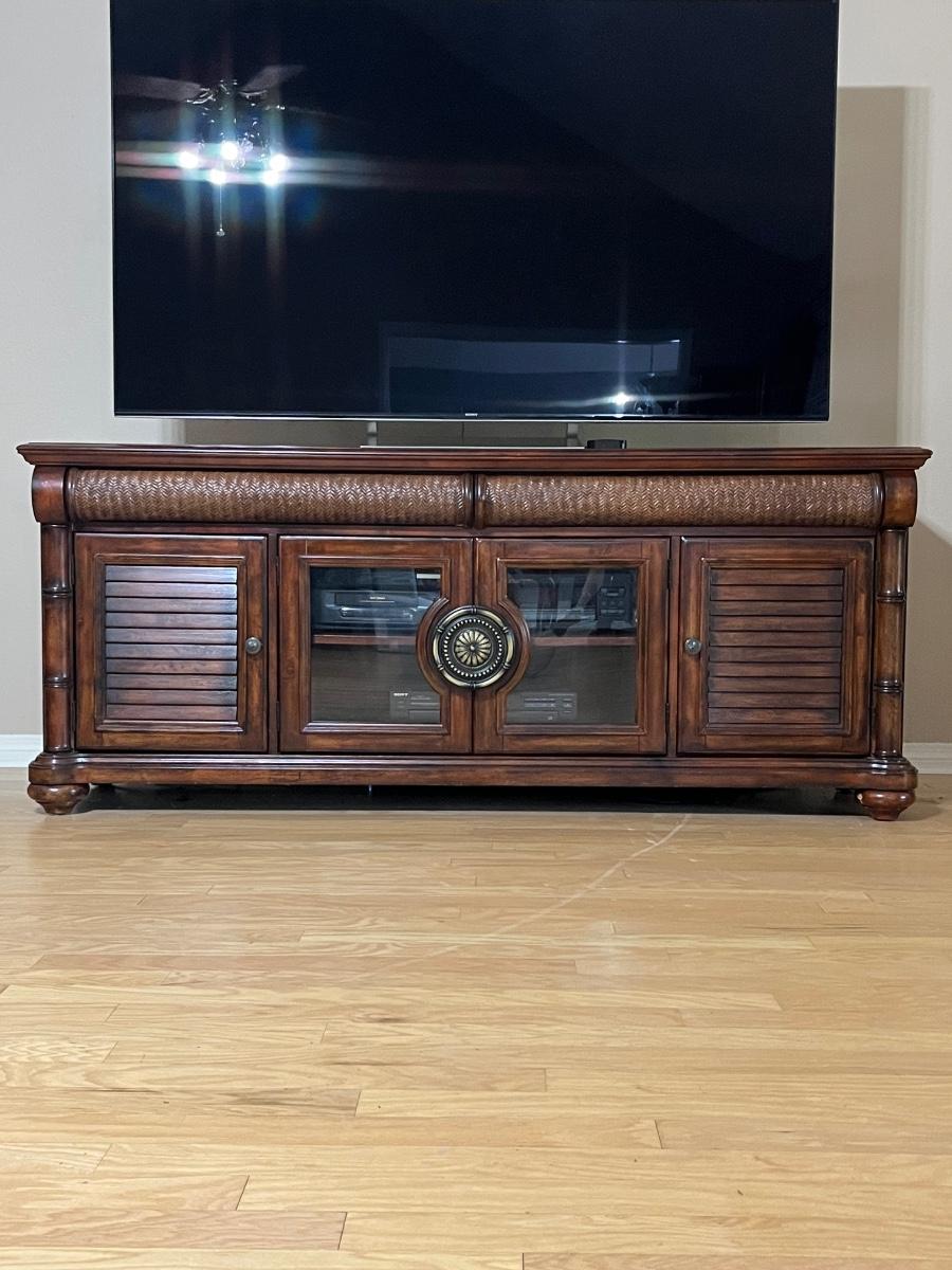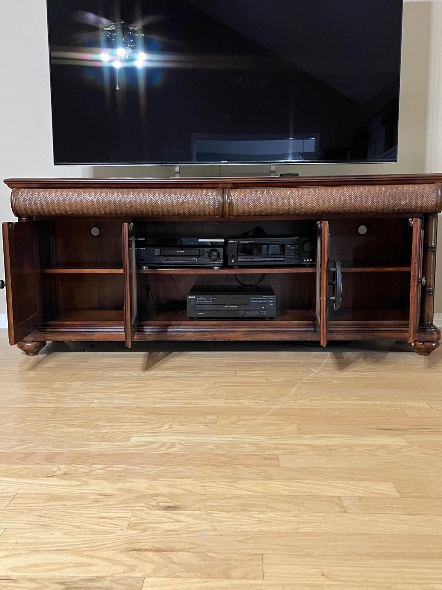 32” H x 78” W x 20” D ~ TV & Electronics not included ~ Drawers slide easily & shelves are not adjustable but can be removed ~ There is a 75" TV sitting on the top